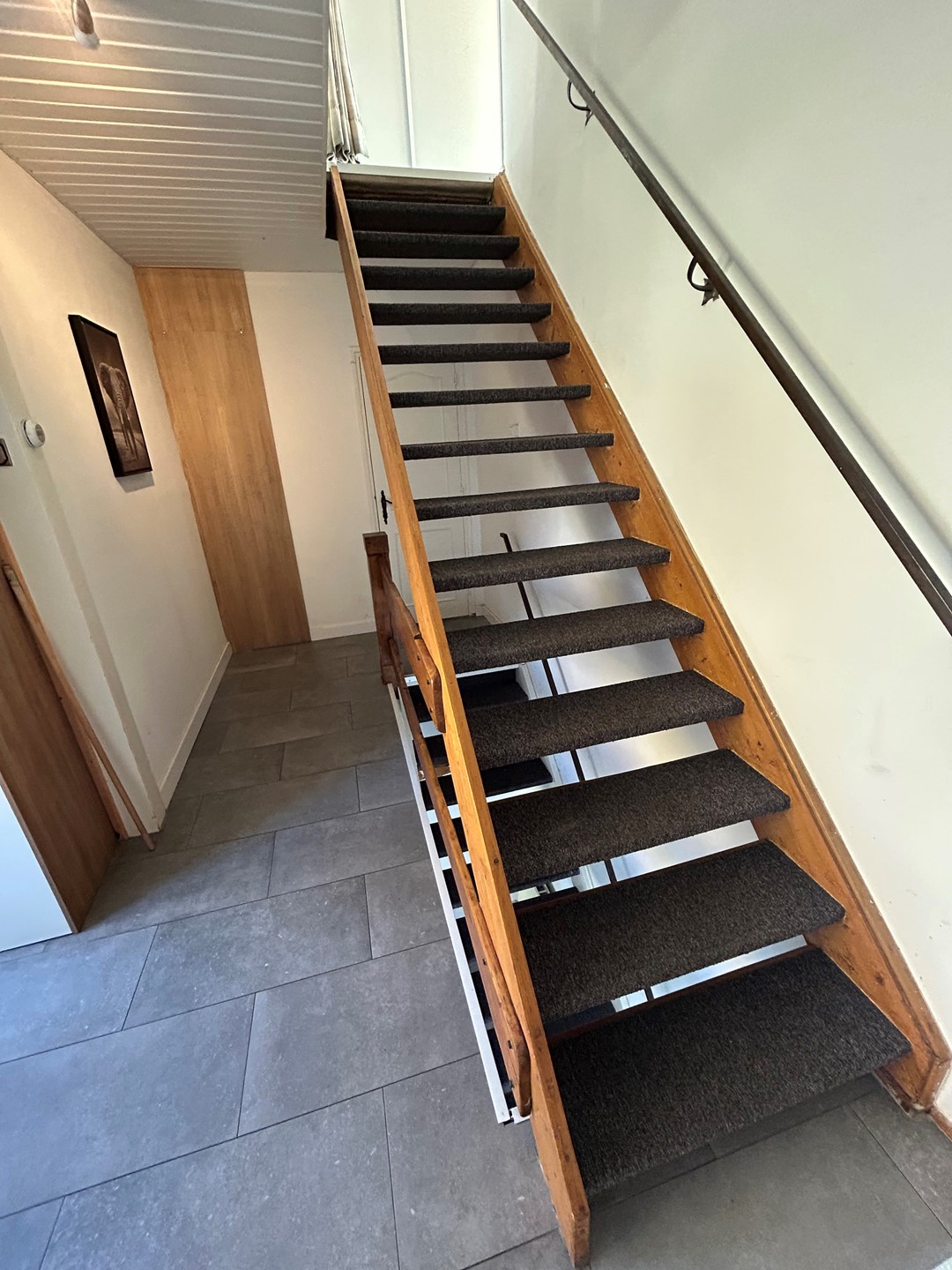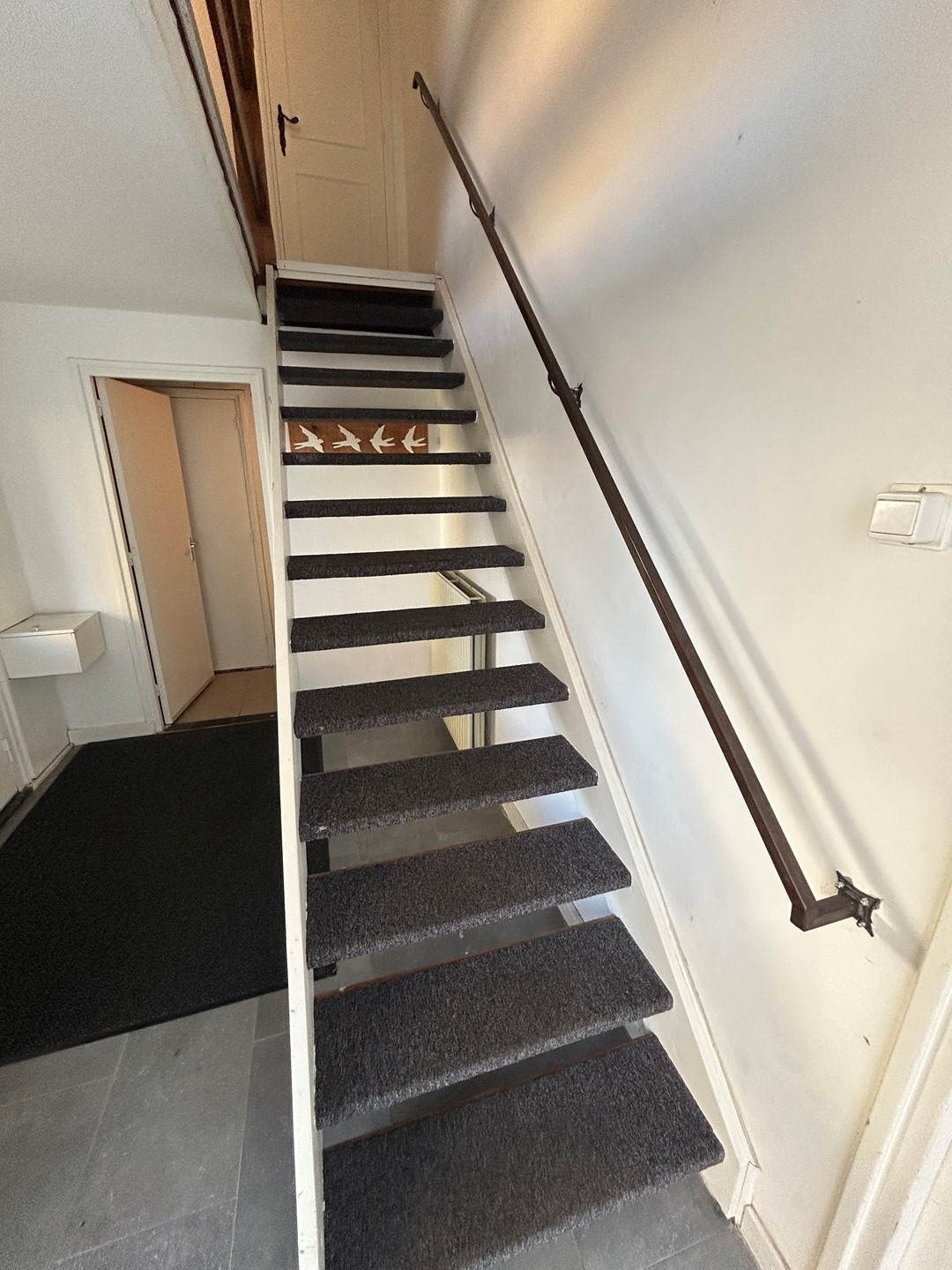 Entree/hal 3,80 x 2,20 met plavuizenvloer, deur naar slaapkamer en wasruimte en trap naar verdieping.