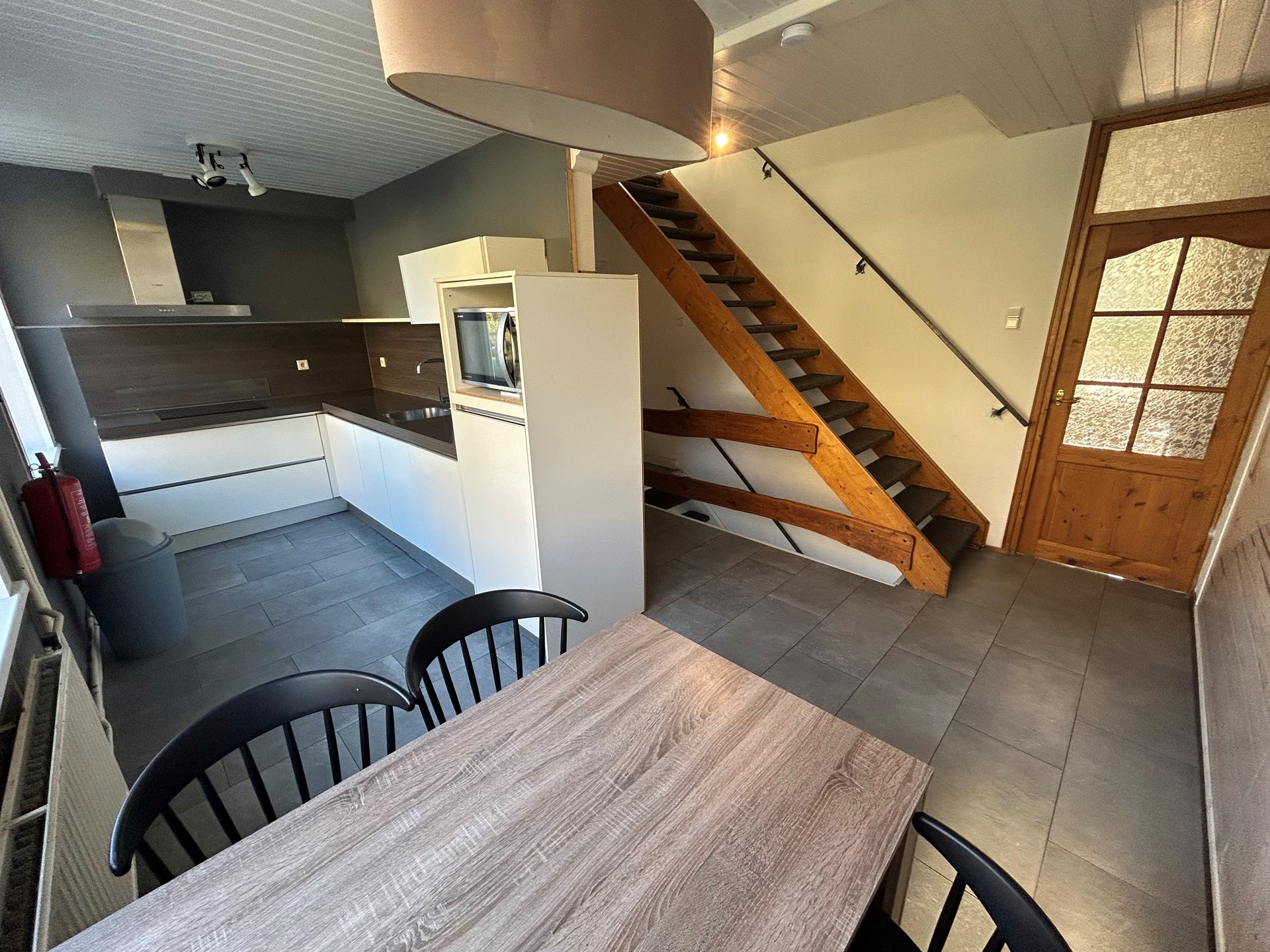 Open keuken 5,60 x 4,30/2,15 met plavuizenvloer, deur naar woonkamer en aanbouwkeuken met elektrische kookplaat met RVS-afzuigunit, vaatwasser, koelkast, magnetron en spoelbak.