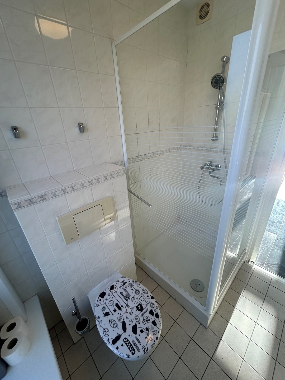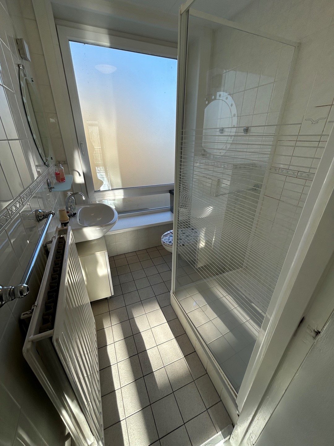 Badkamer 2: 1,90 x 1,70 met plavuizenvloer, douche met cabine, hangtoilet en wastafel.