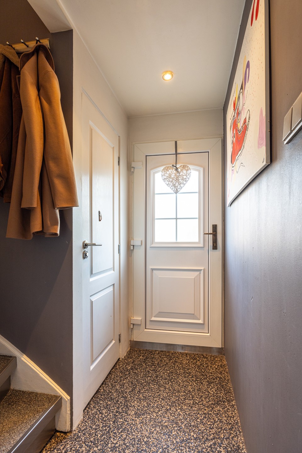 Via een trap bereikt u de onderhoudsvriendelijke voortuin. De entree leidt naar de ontvangsthal met grindvloer, garderobe, meterkast en een toilet voorzien van staand closet en fonteintje.