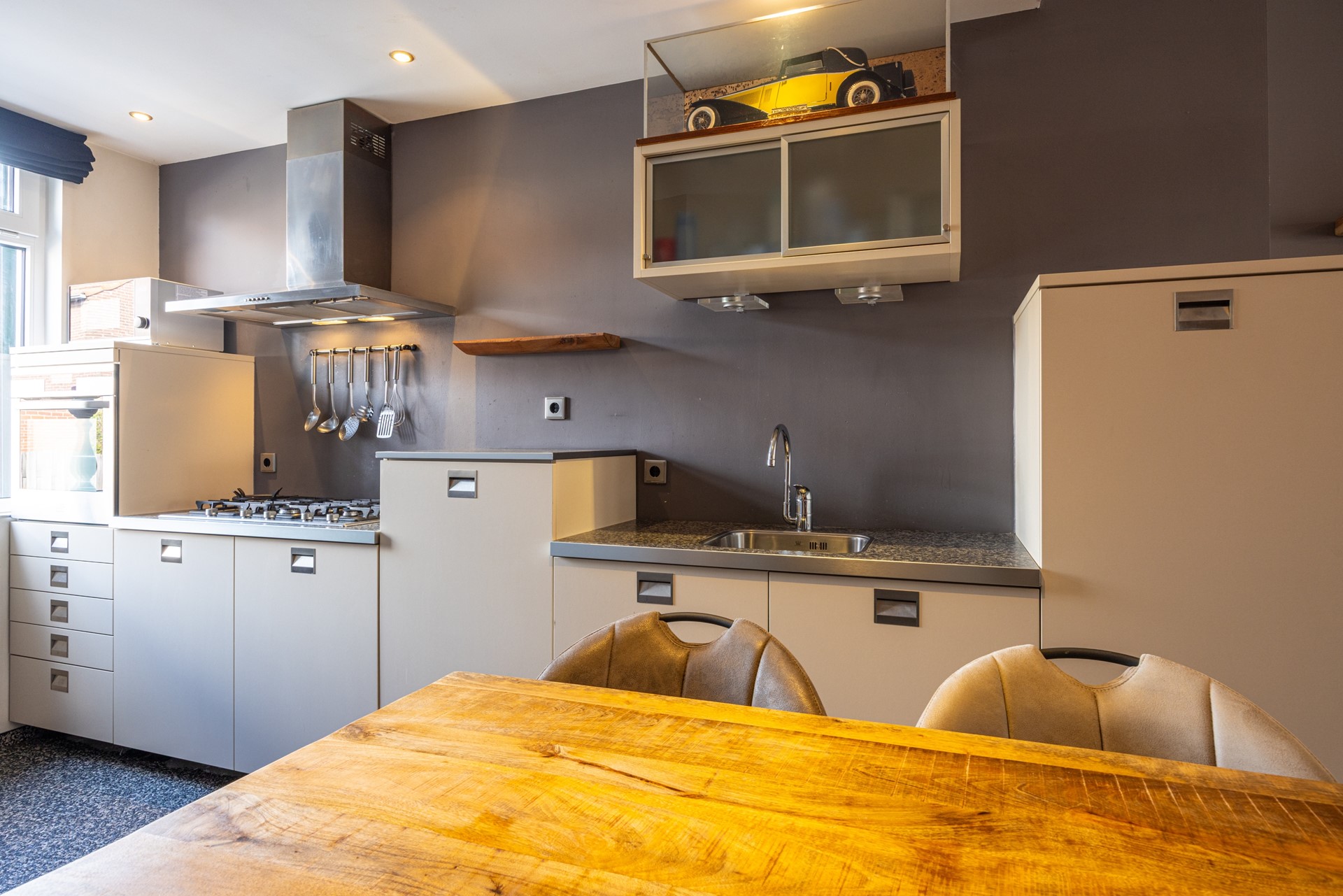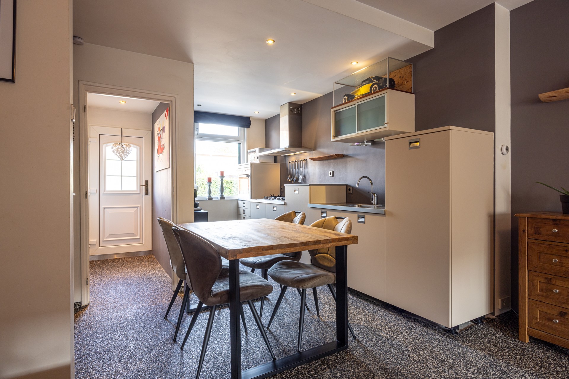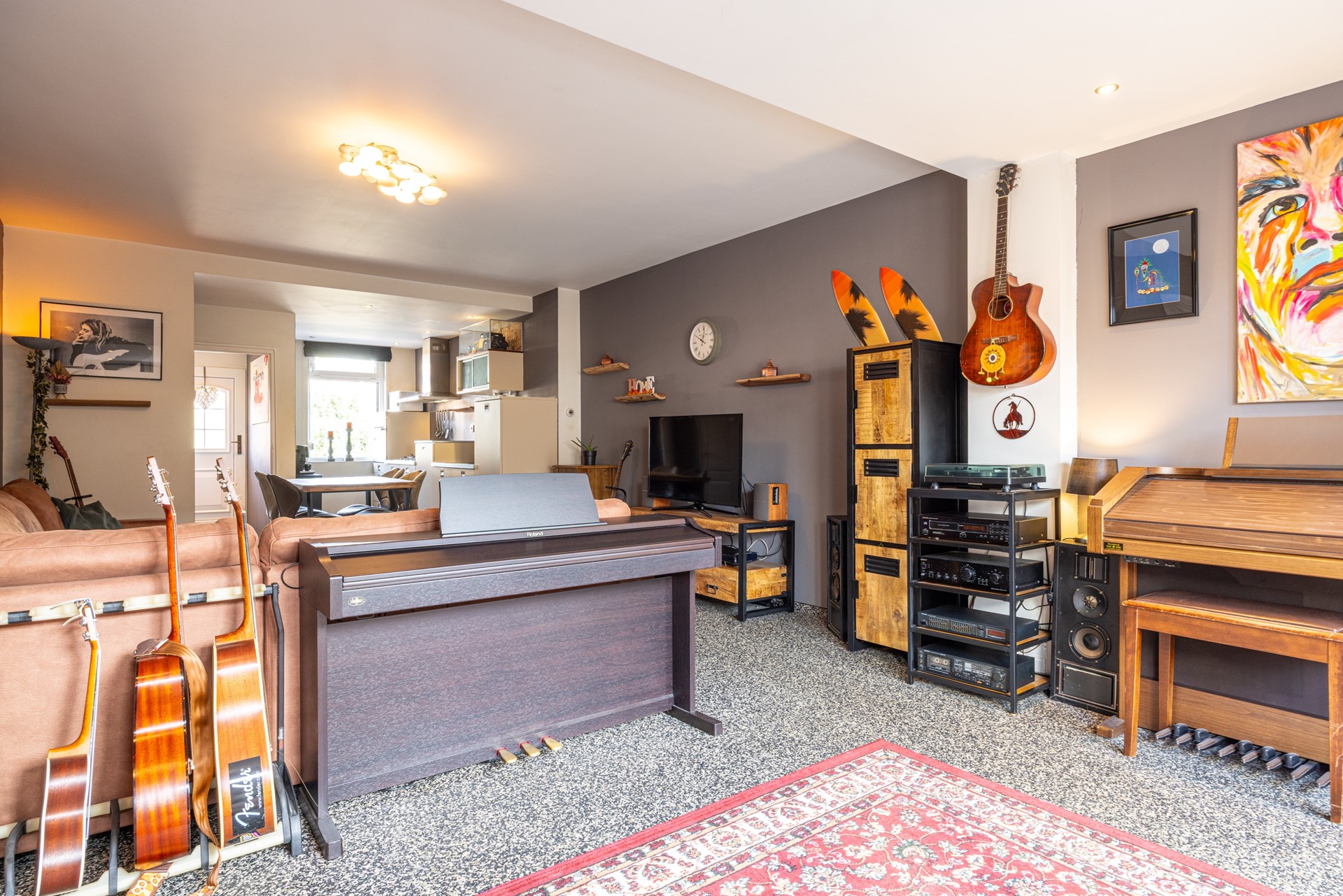 De ruime woonkamer, eveneens voorzien van een grindvloer, geniet van veel daglicht dankzij de aanbouw aan de achterzijde. Via de openslaande deuren staat de woonkamer in directe verbinding met het terras in de achtertuin. Rolluiken zorgen hier voor extra comfort en privacy. Vanuit de woonkamer is er tevens toegang tot de kelder: een royale ruimte verdeeld in twee gedeeltes, voorzien van een tegelvloer, aansluitingen voor witgoed en de cv-installatie. an de voorzijde van de woning bevindt zich de open keuken met grindvloer. Ook hier zijn rolluiken aanwezig. De keuken biedt volop kastruimte en is uitgerust met diverse inbouwapparatuur: een 5-pits gasfornuis, wandafzuigkap, oven en koelkast.