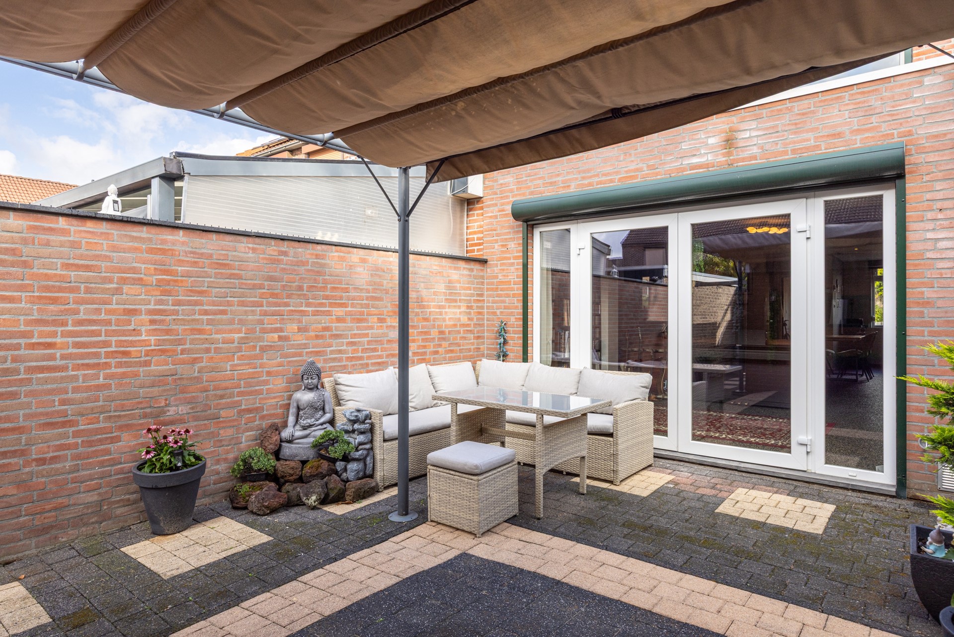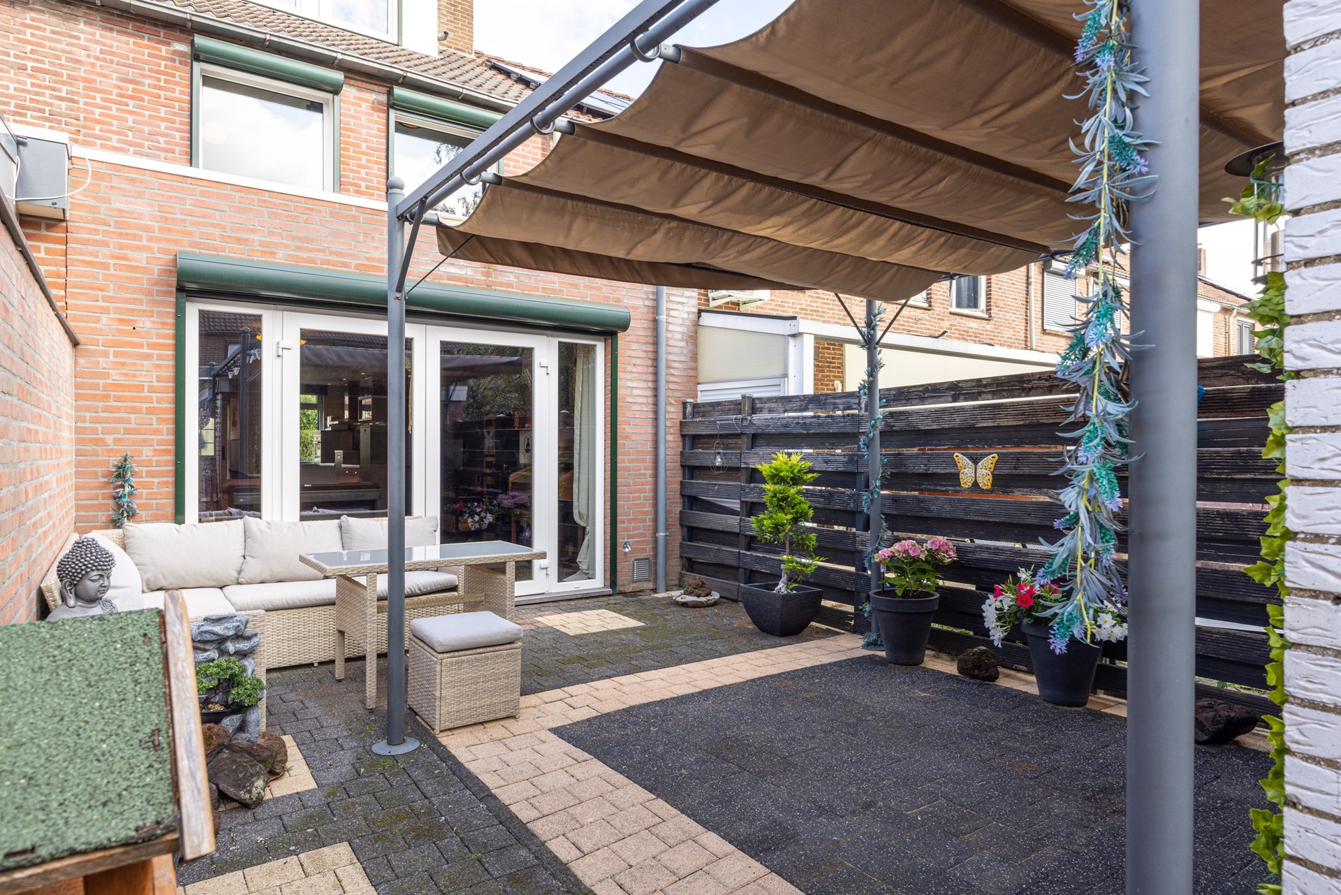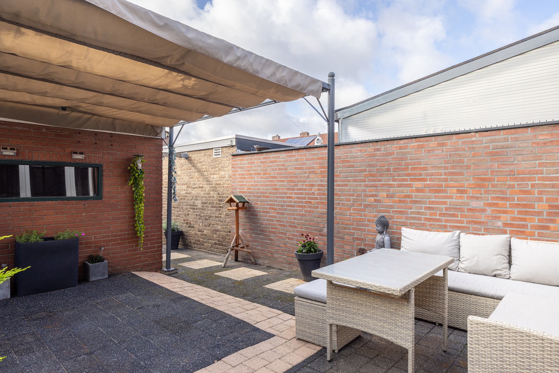 De achtertuin is verzorgd en onderhoudsvriendelijk aangelegd. Direct achter de woning ligt een terras dat ideaal is voor een zit- of eethoek. Verder is er voldoende ruimte om te genieten van het buitenleven, zonder dat er veel onderhoud nodig is. Achter in de tuin ligt de garage met kantelpoort en elektra, bereikbaar via de achterzijde én vanuit de tuin. Ook beschikt de tuin over een eigen achterom.
