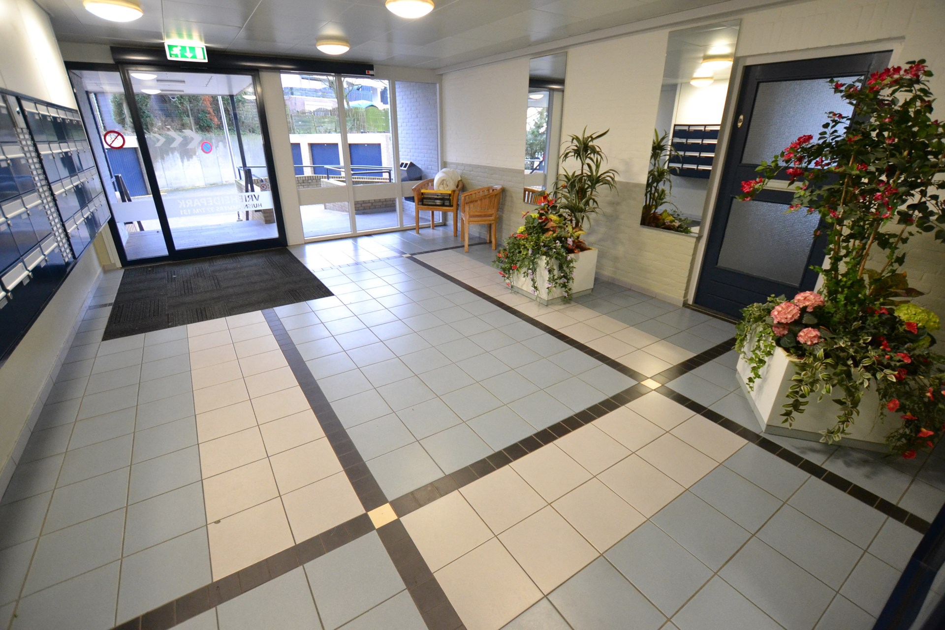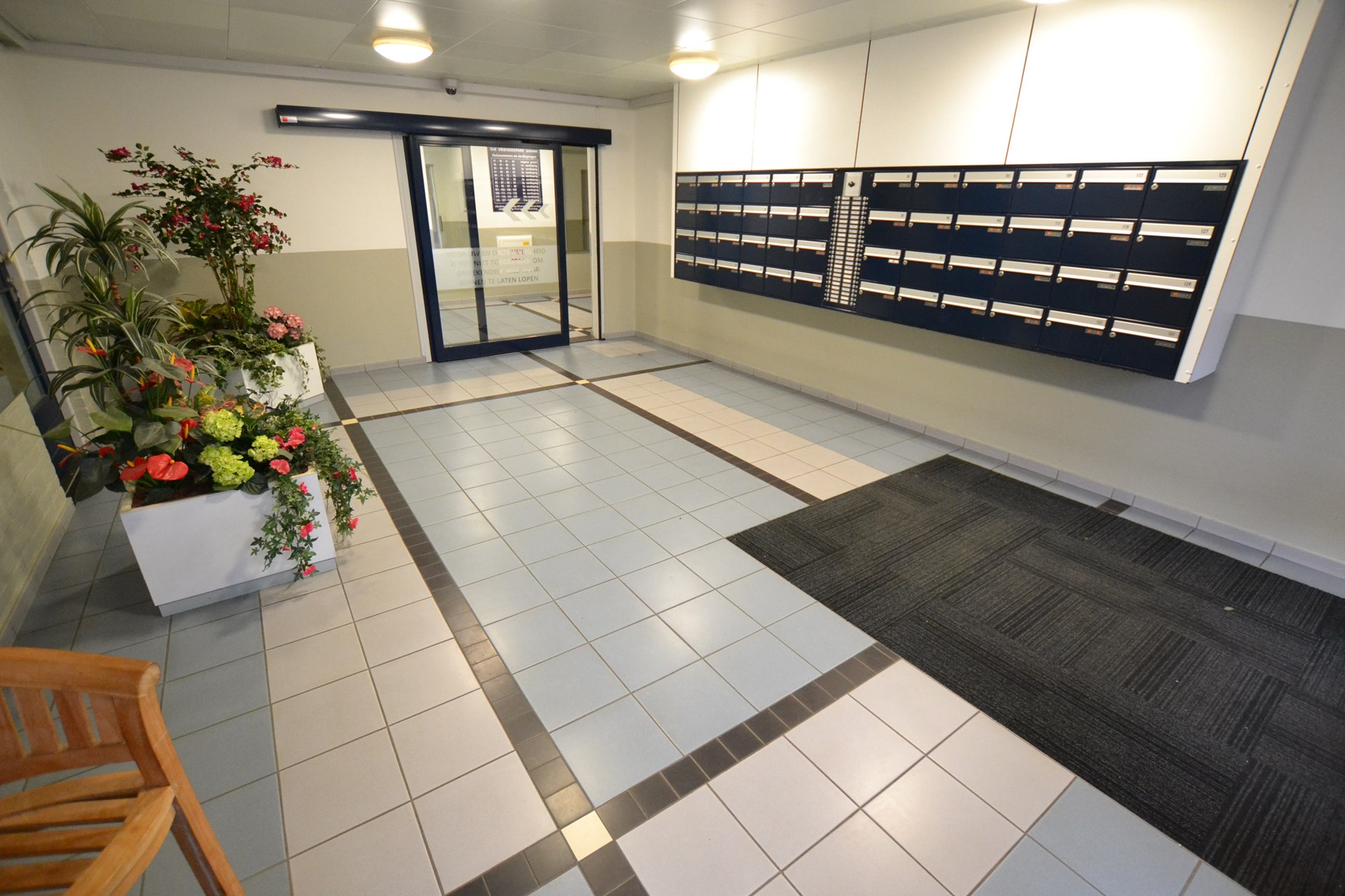 Mooie verzorgde entree/hal met brievenbussen- en bellenpaneel, intercom en elektrische schuifdeuren naar hal met liften.