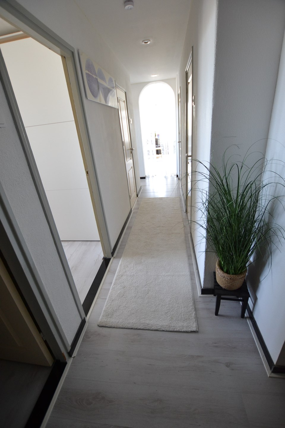 Entree/gang 5,60 x 1,00 met laminaatvloer en inbouwspots.