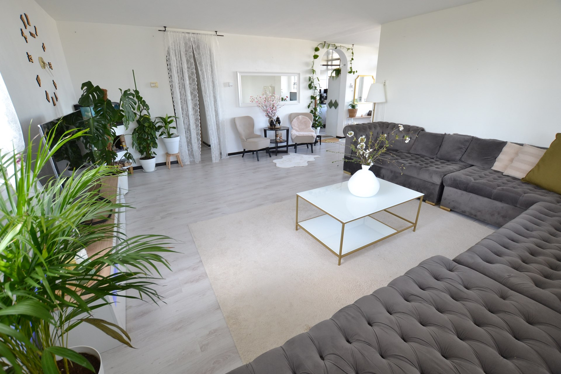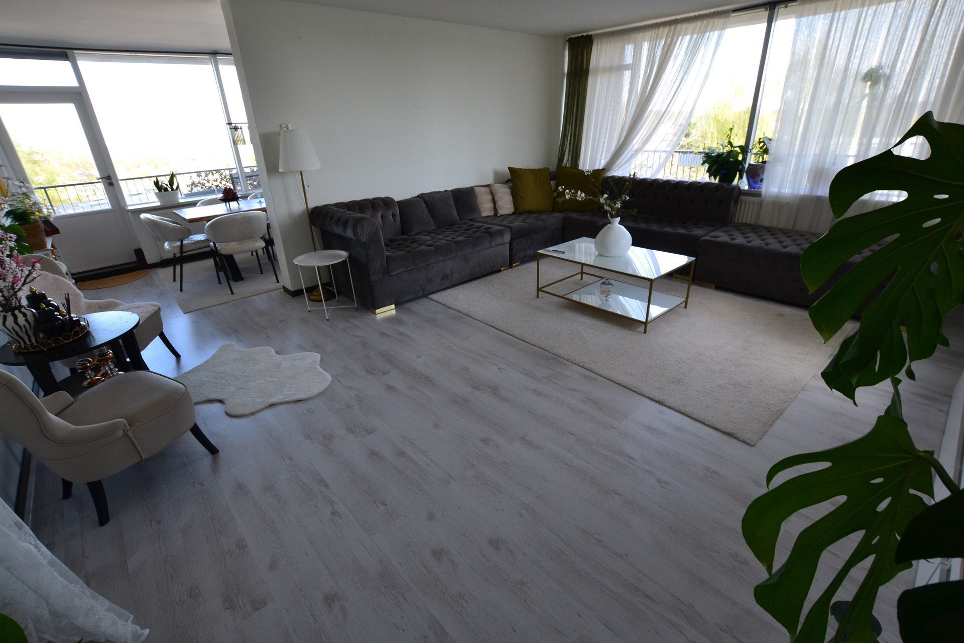 Woonkamer 7,50x 5,95/4,95 met laminaatvloer, deur naar twee balkons en half open keuken.
