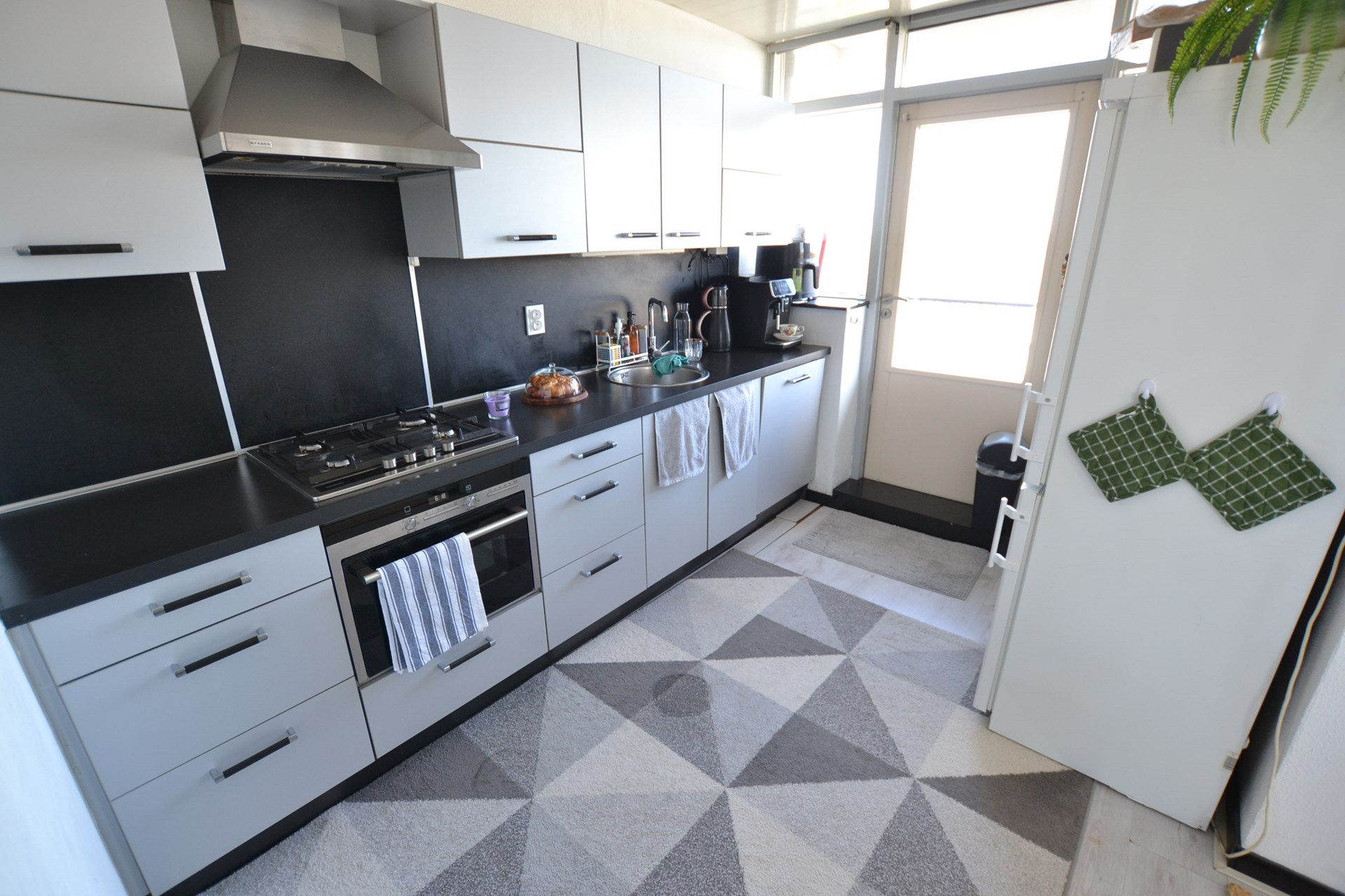 Keuken 3,10 x 2,40 met laminaatvloer, inbouwspots, deur naar balkon en mooie aanbouwkeuken met 4-pits gasfornuis met afzuigunit, bakoven, vaatwasser, koel/vriescombinatie en spoelbak.