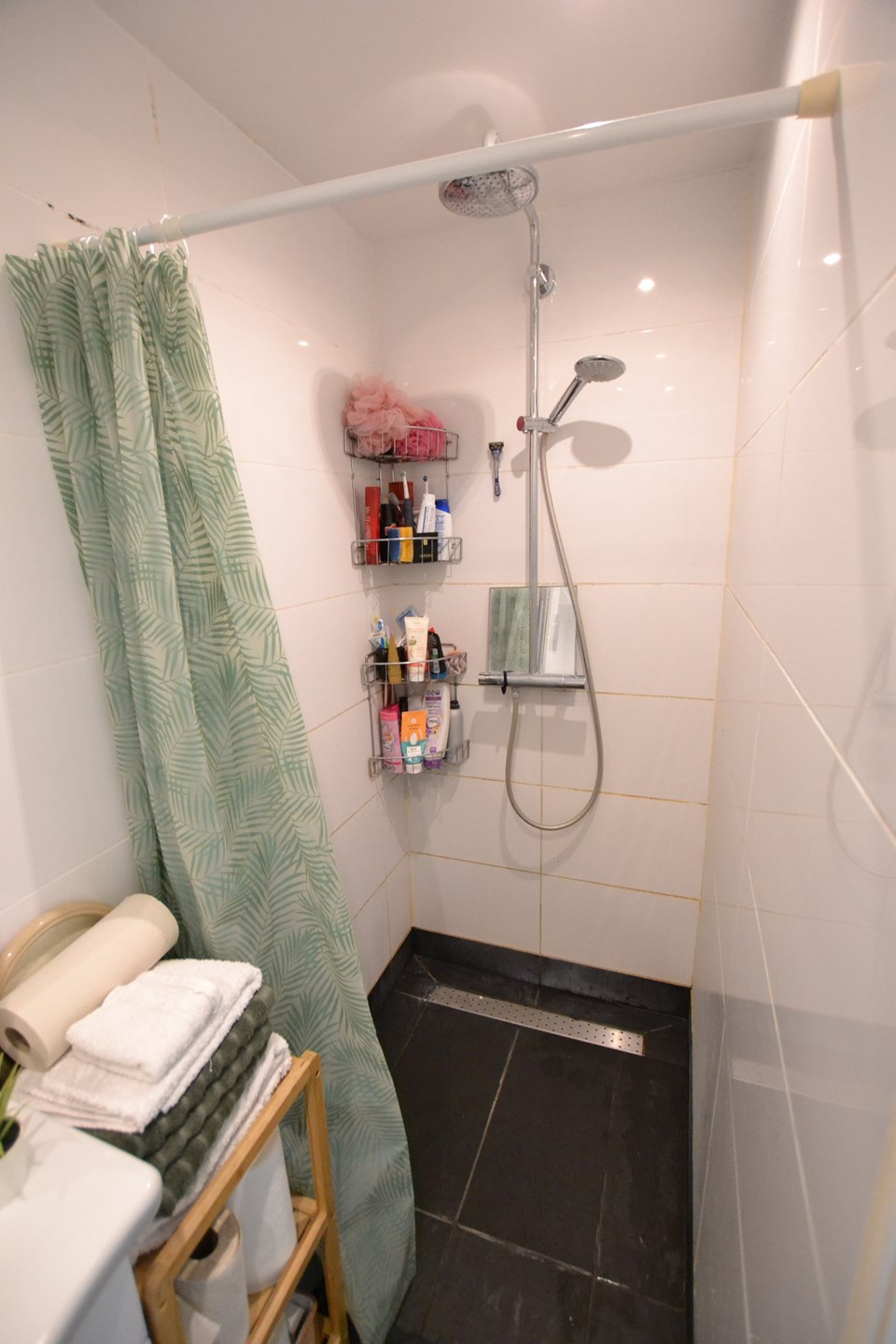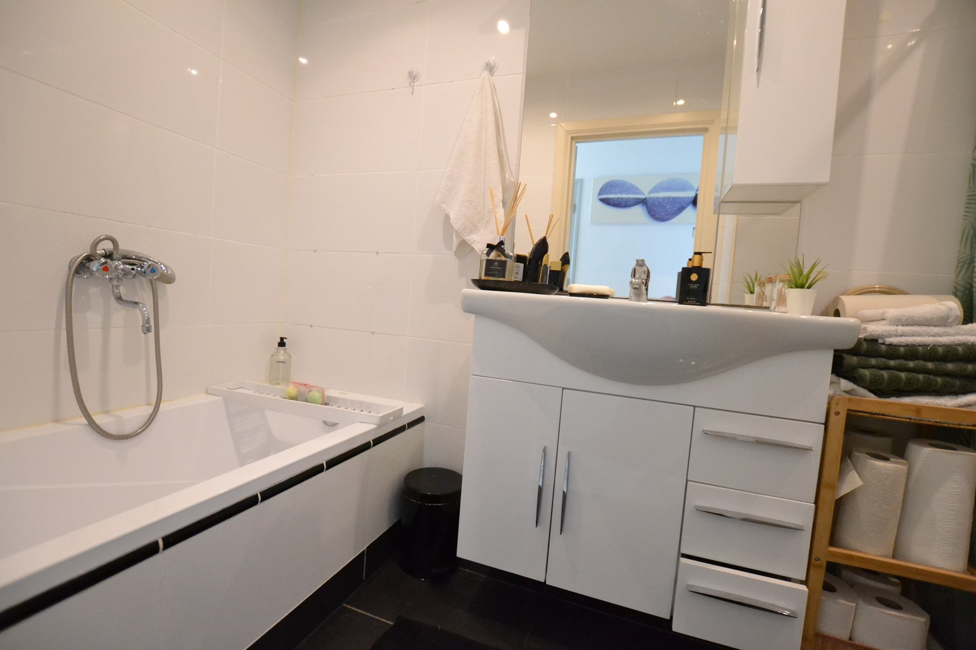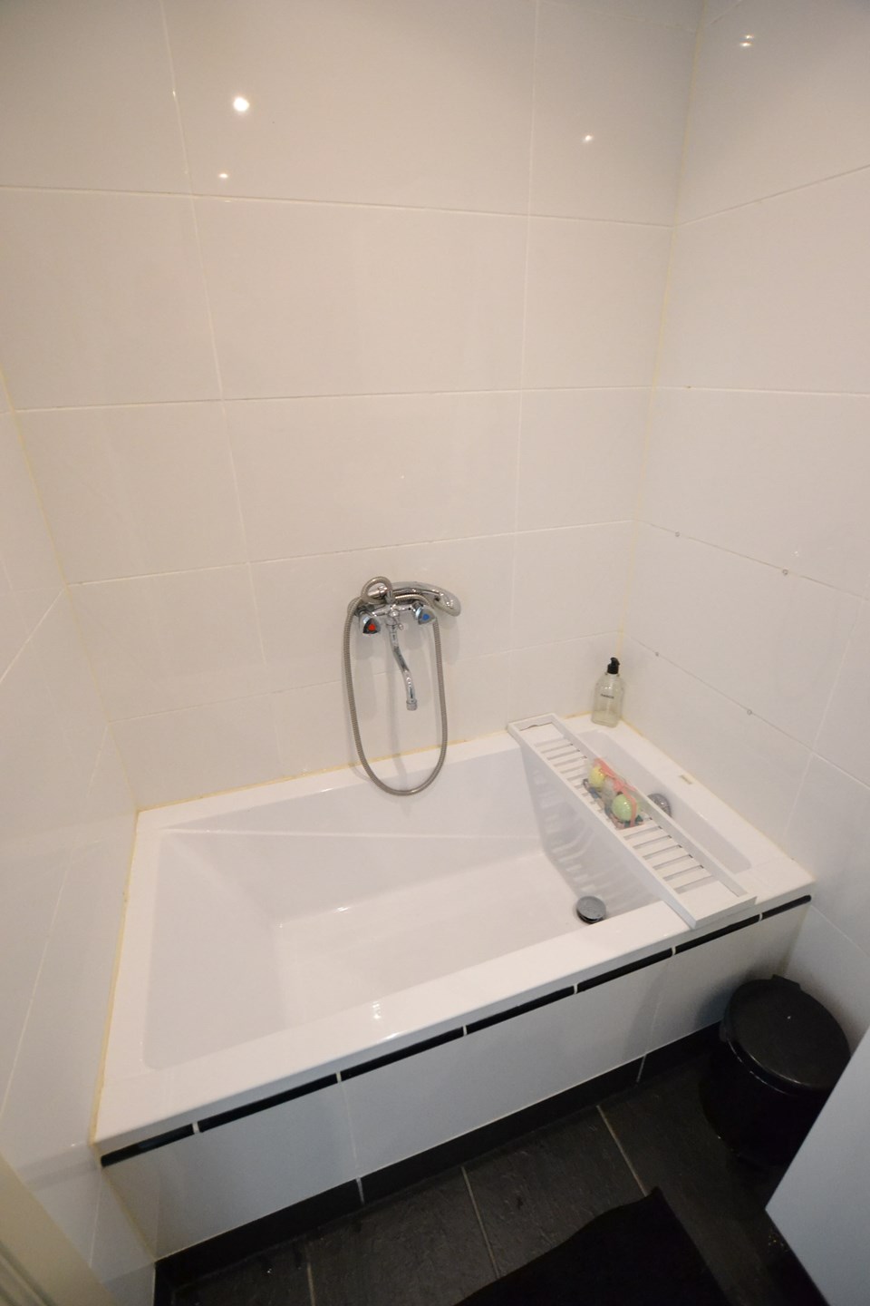 Badkamer 3,20 x 1,30/0,95 met plavuizenvloer, inbouwspots, inloopdouche, ligbad en badkamermeubel met wastafel.