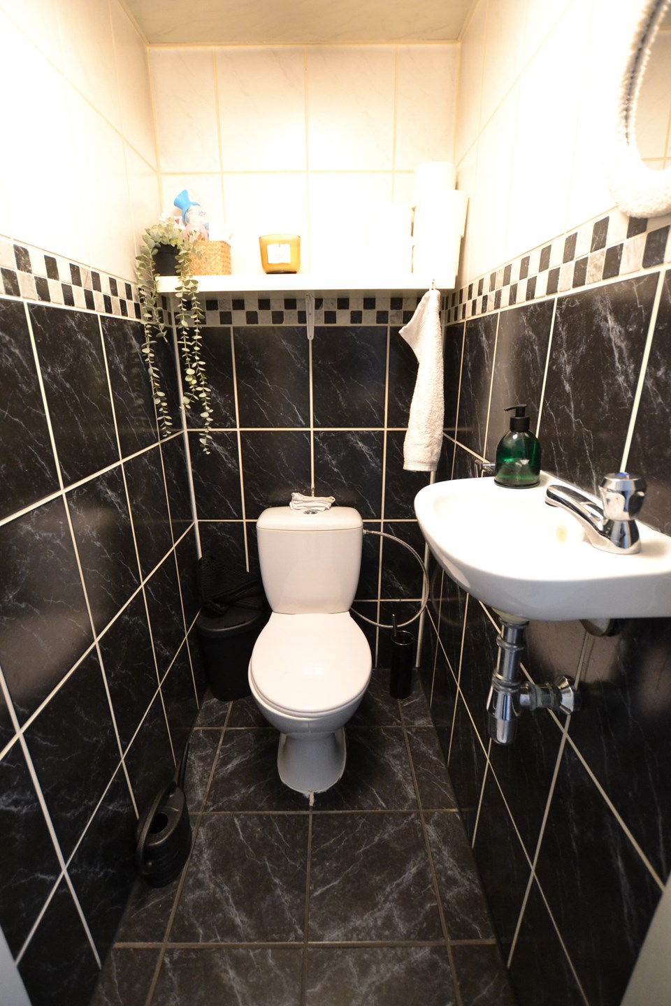 Mooie toiletruimte 1,25 x 0,90 met plavuizenvloer, inbouwspot, duoblok en fonteintje.