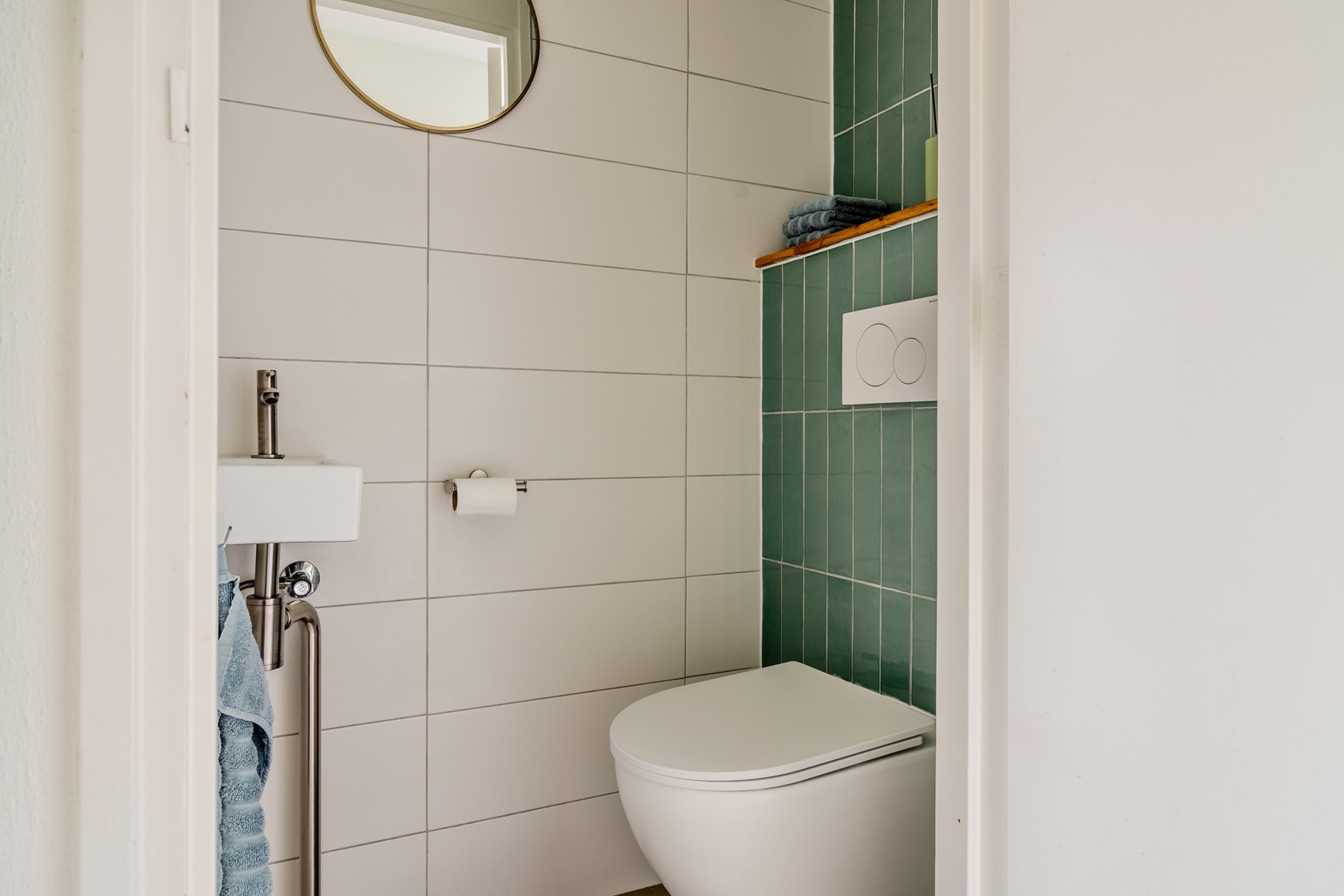 met een doorgelegde linoleumvloer en vloerverwarming. Hal met meterkast. Toiletruimte (vernieuwd 2024) met wandcloset en fontein.