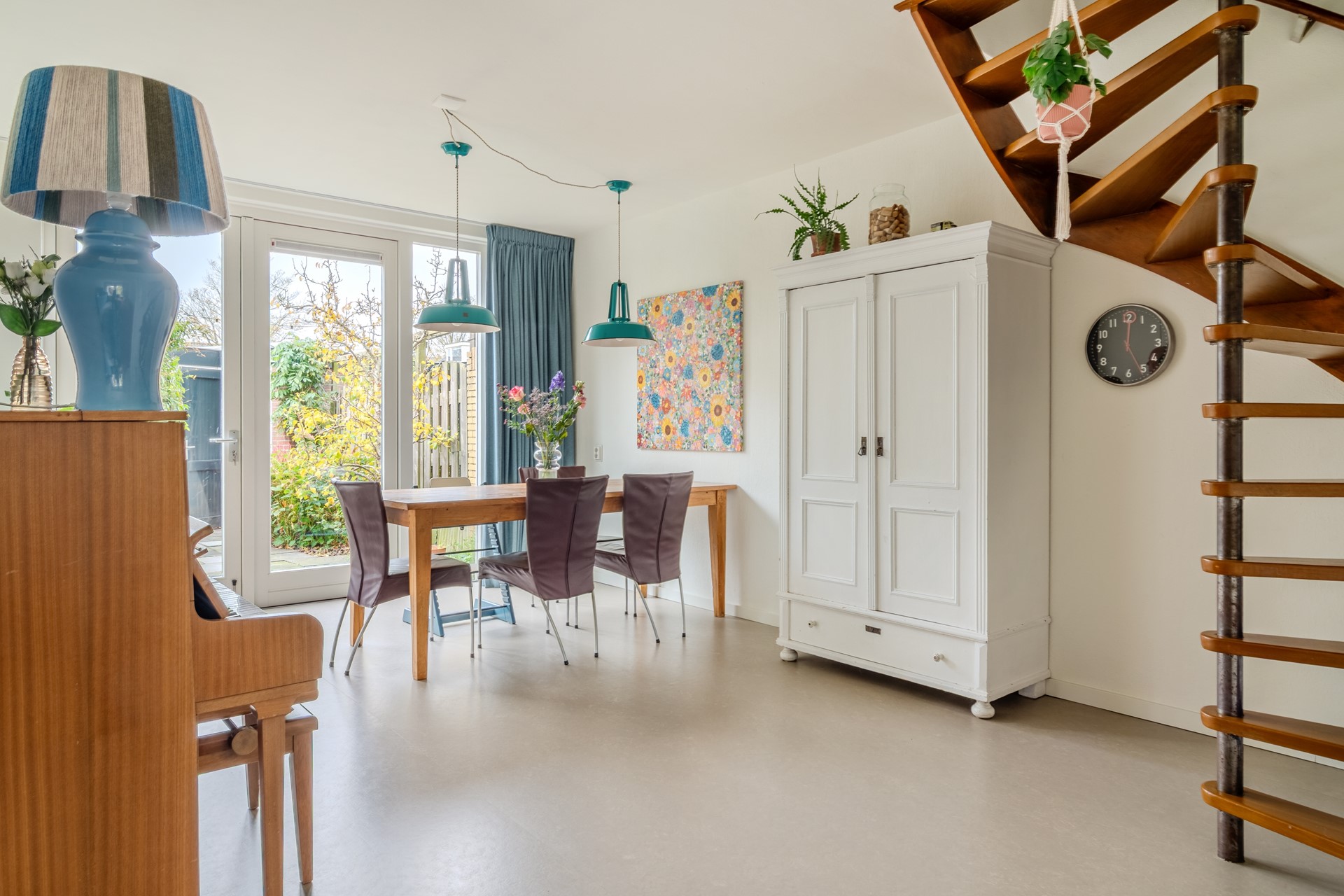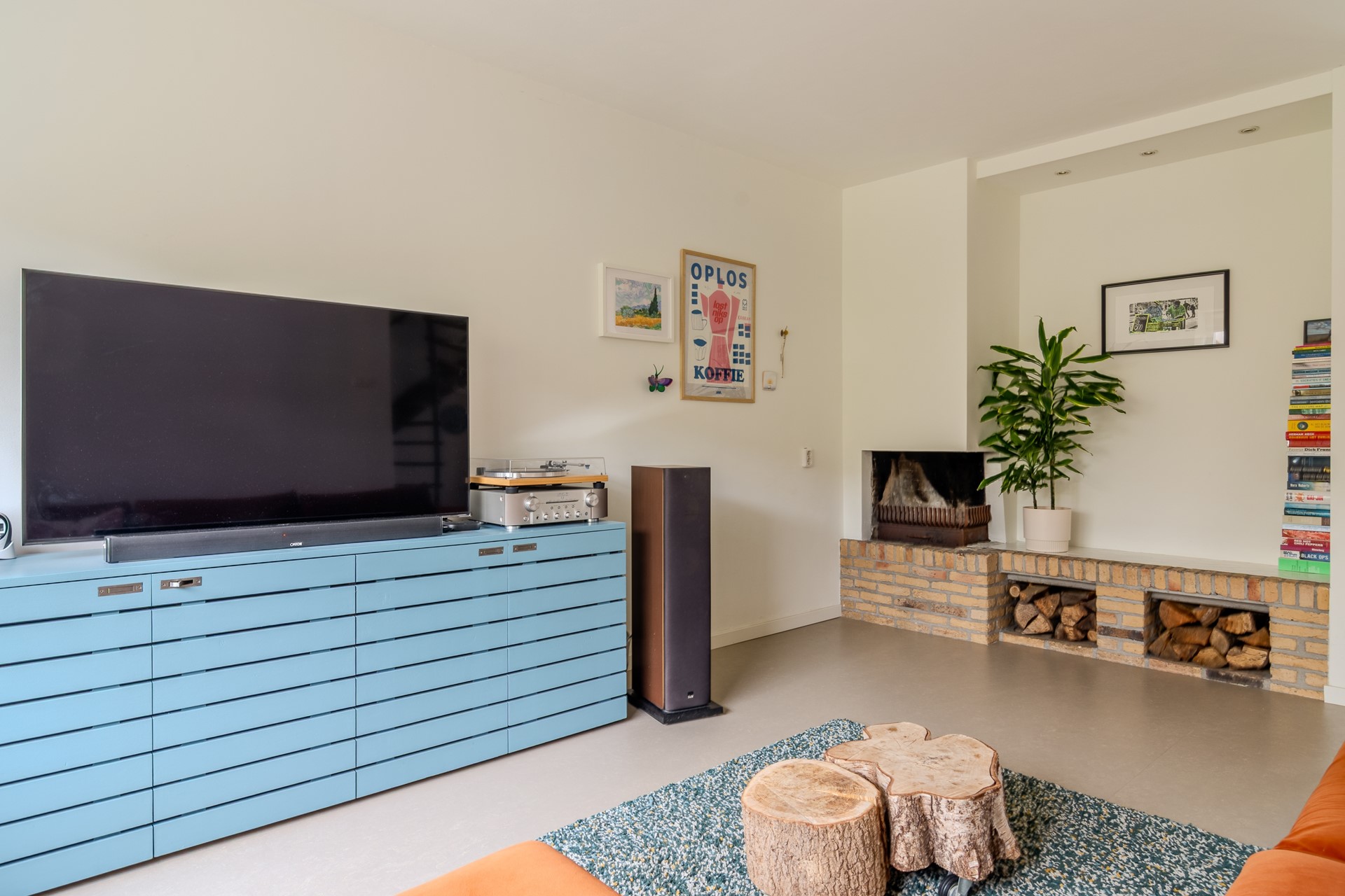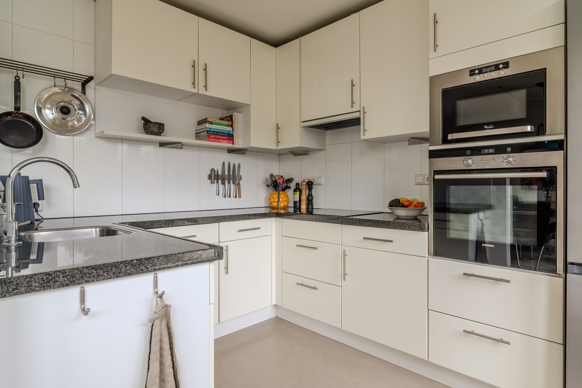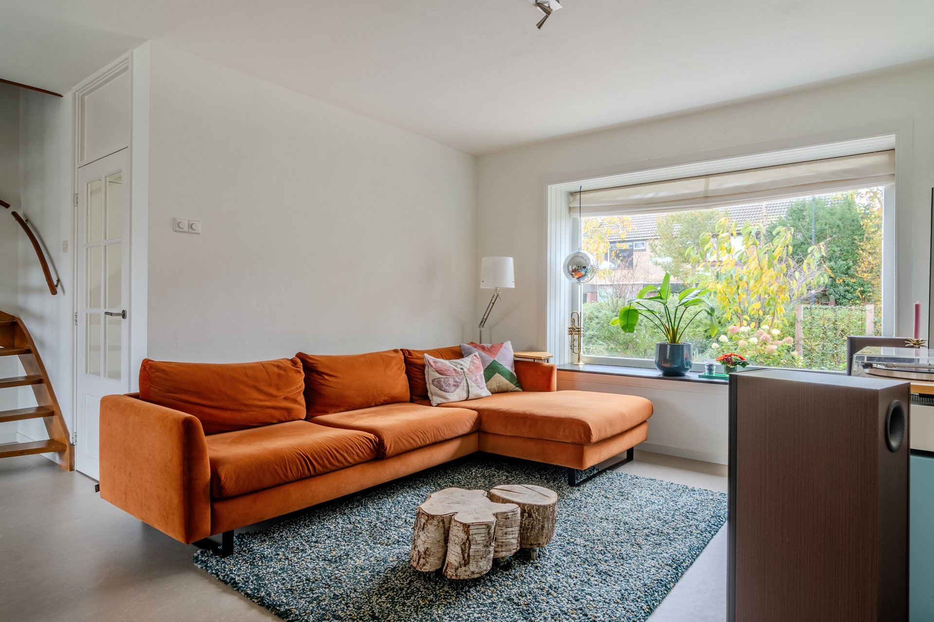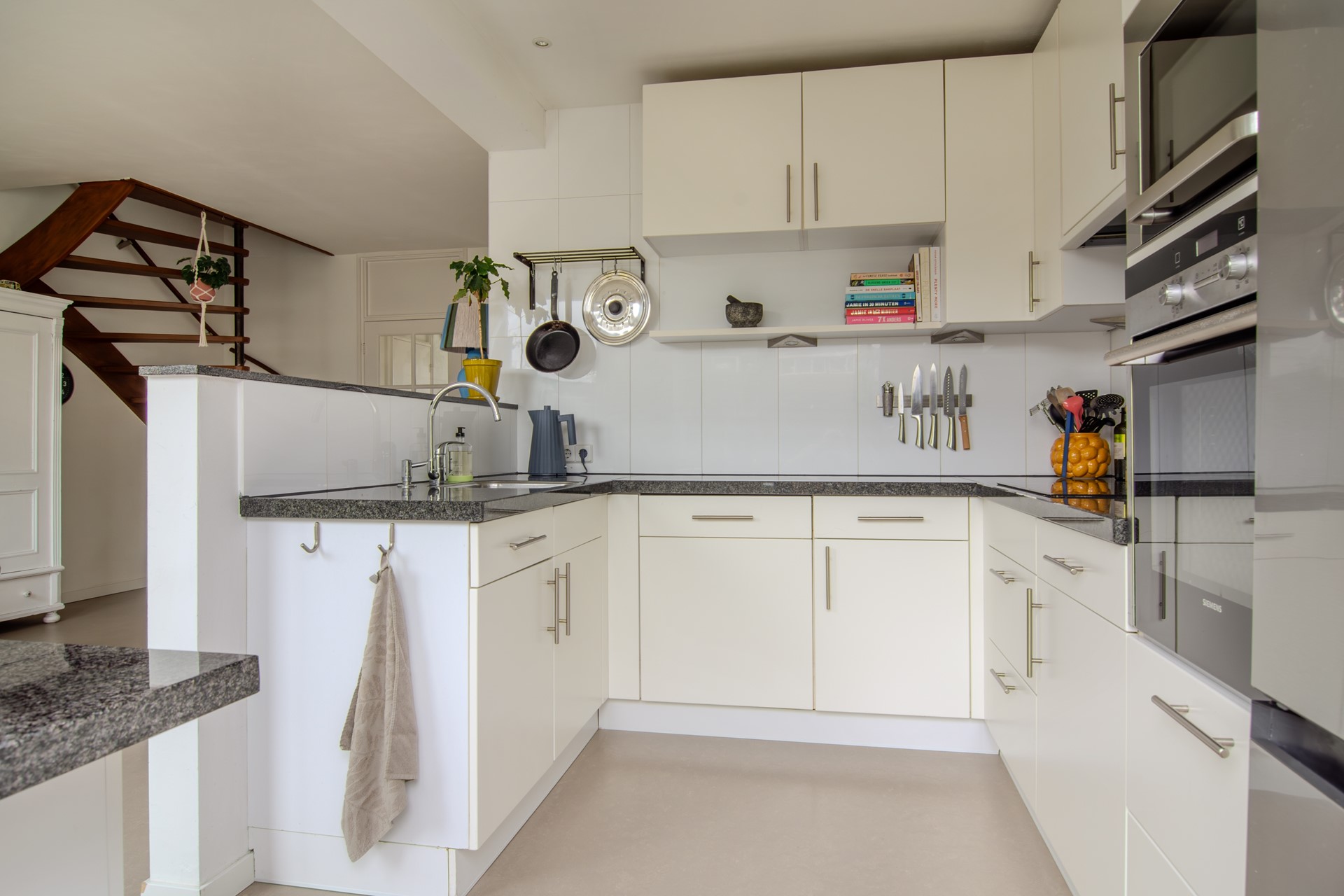 Bij binnenkomst in de woonkamer wordt uw oog direct naar de grote openslaande deuren getrokken. Hierdoor wordt de buitenruimte als het ware naar binnen gehaald: een heerlijke verlenging van de woonkamer. Samen met het grote raam aan de voorzijde ontstaat een fijne, lichte ruimte. De open keuken met inbouwapparatuur versterkt dit effect. De woonkamer is voorzien van een houthaard voor warme en knusse avonden. De open wenteltrap leidt naar de