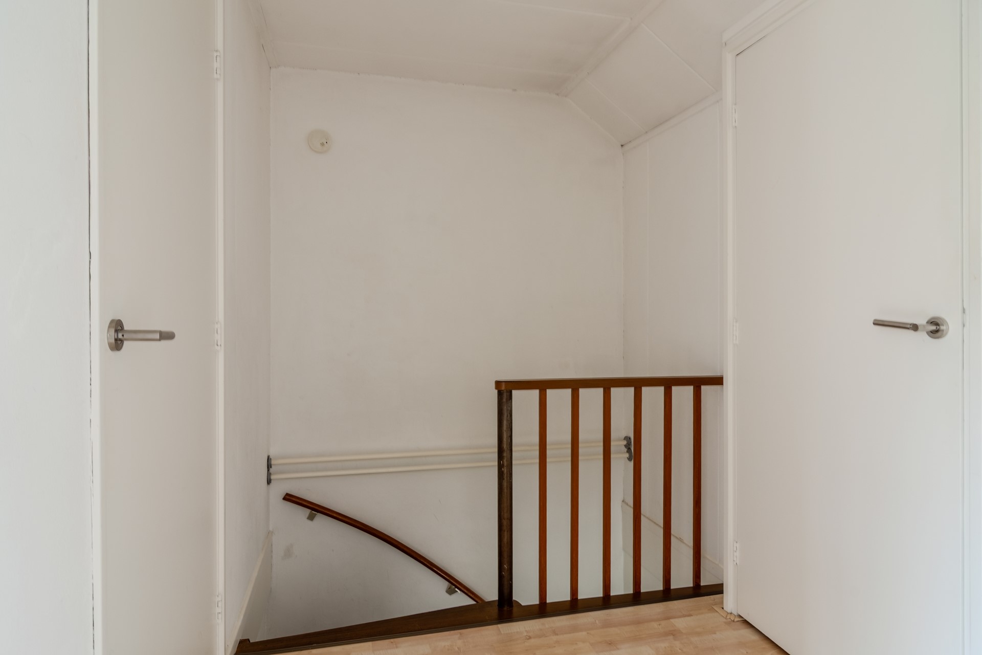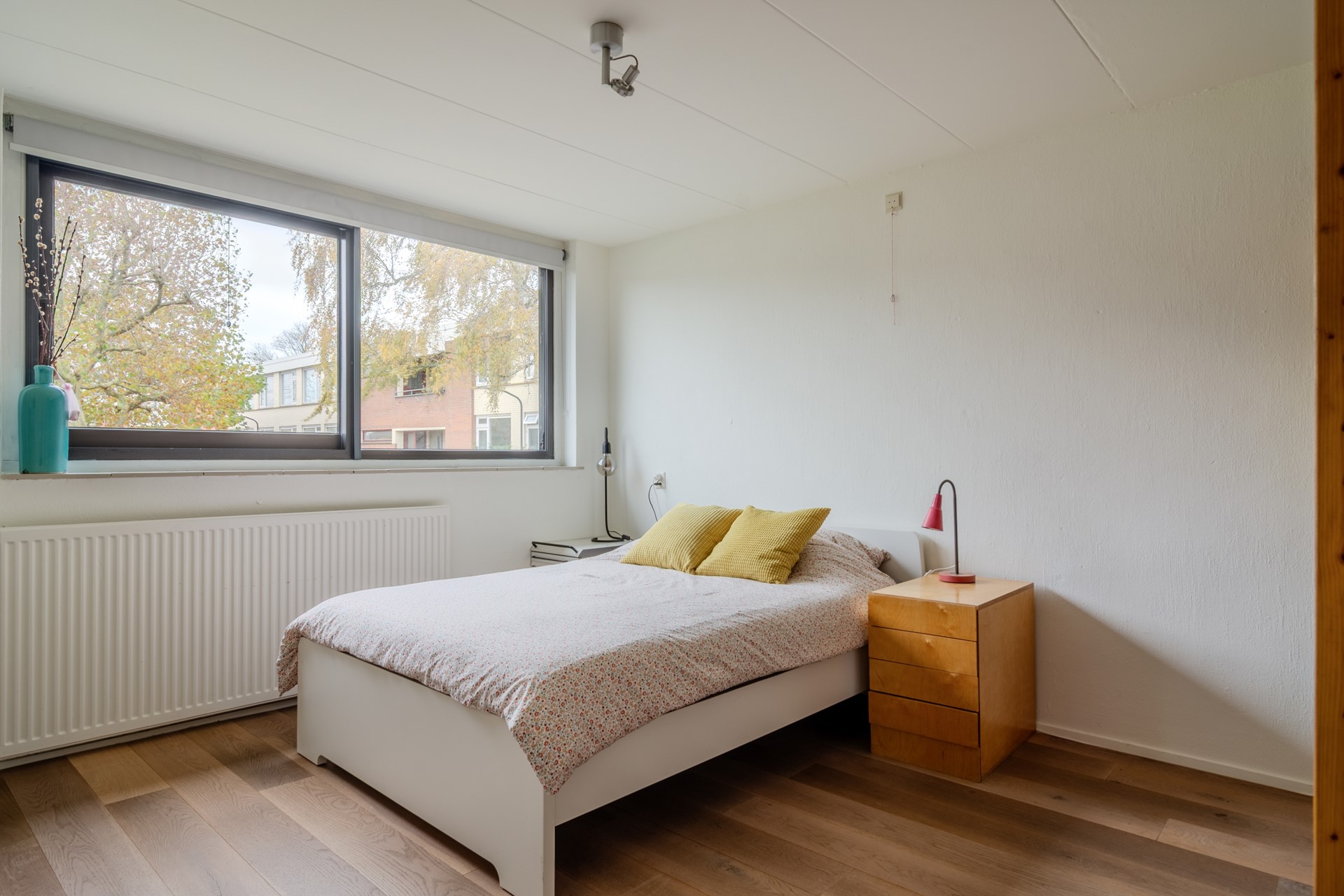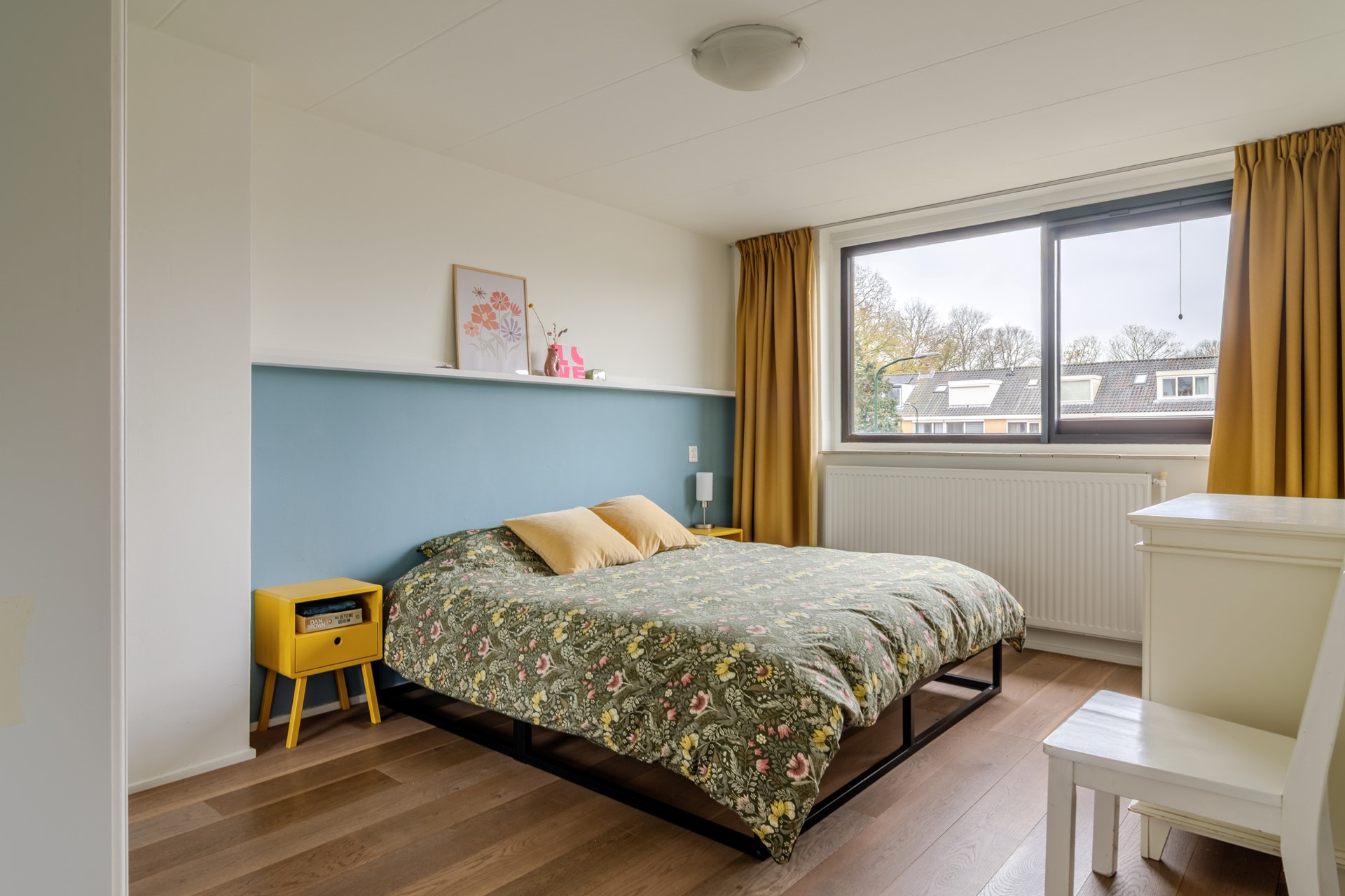 Hier bevinden zich drie ruime slaapkamers met een doorgelegde houten vloer, waarvan twee aan de tuinzijde op het westen. De luxe badkamer met vloerverwarming is uitgerust met een ligbad met douche, een dubbel wastafelmeubel en een toilet (vernieuwd 2023). De derde slaapkamer en de badkamer bevinden zich aan de voorzijde van de woning, op het oosten. Overloop met vaste trap naar de zolderverdieping.