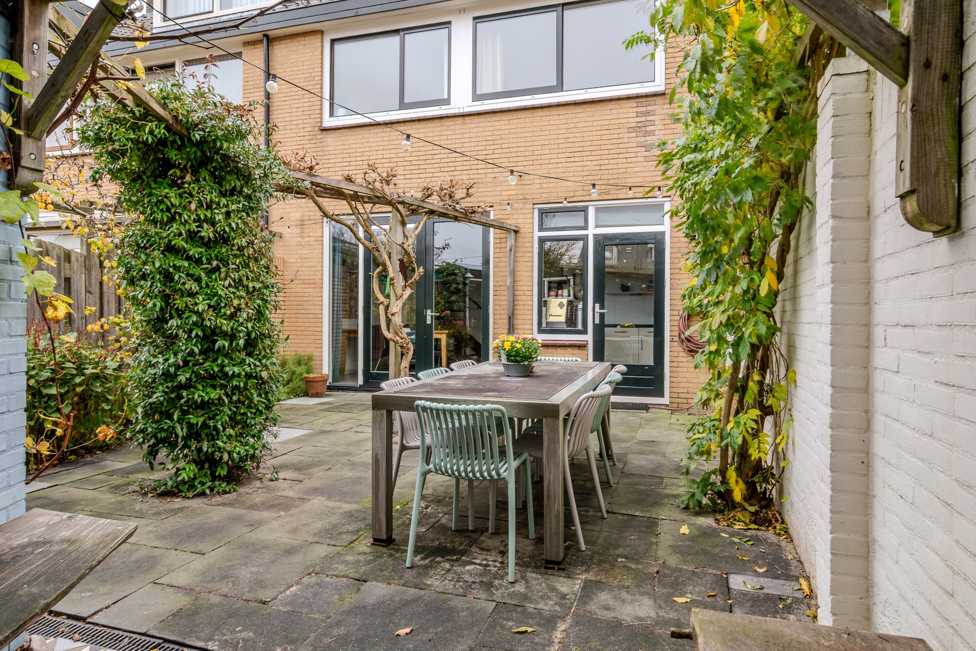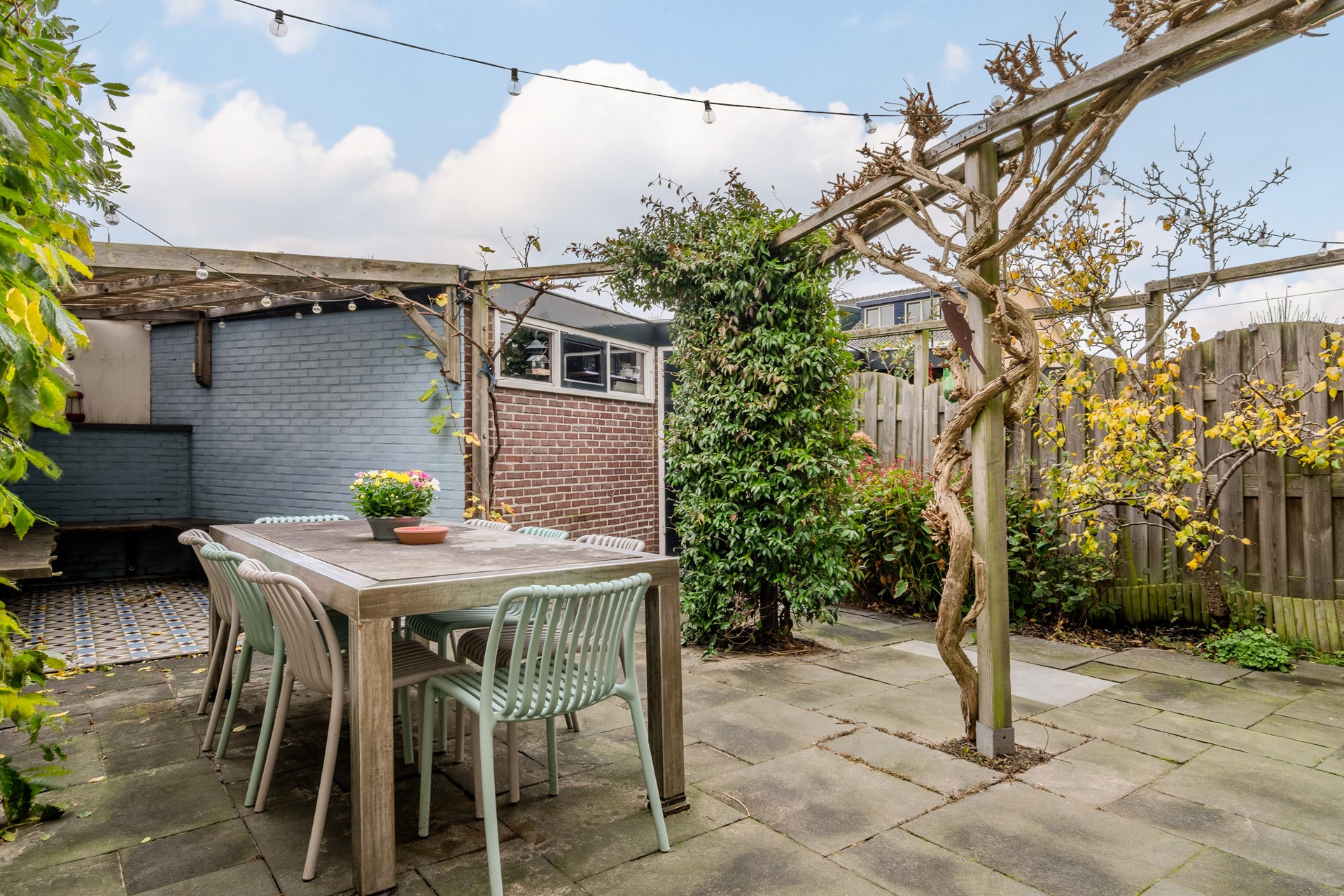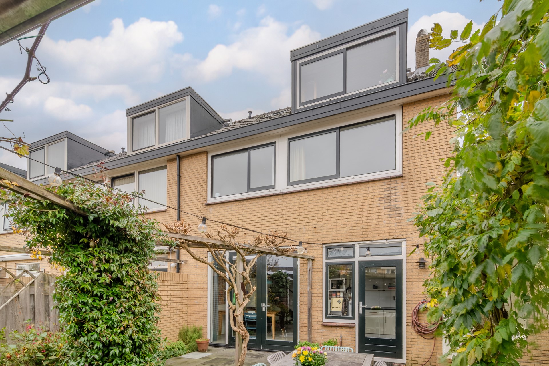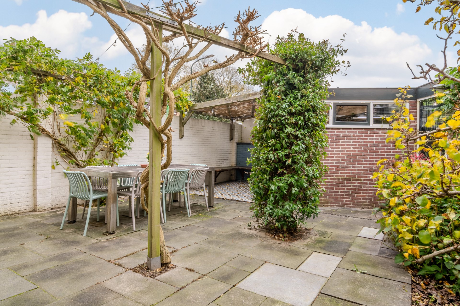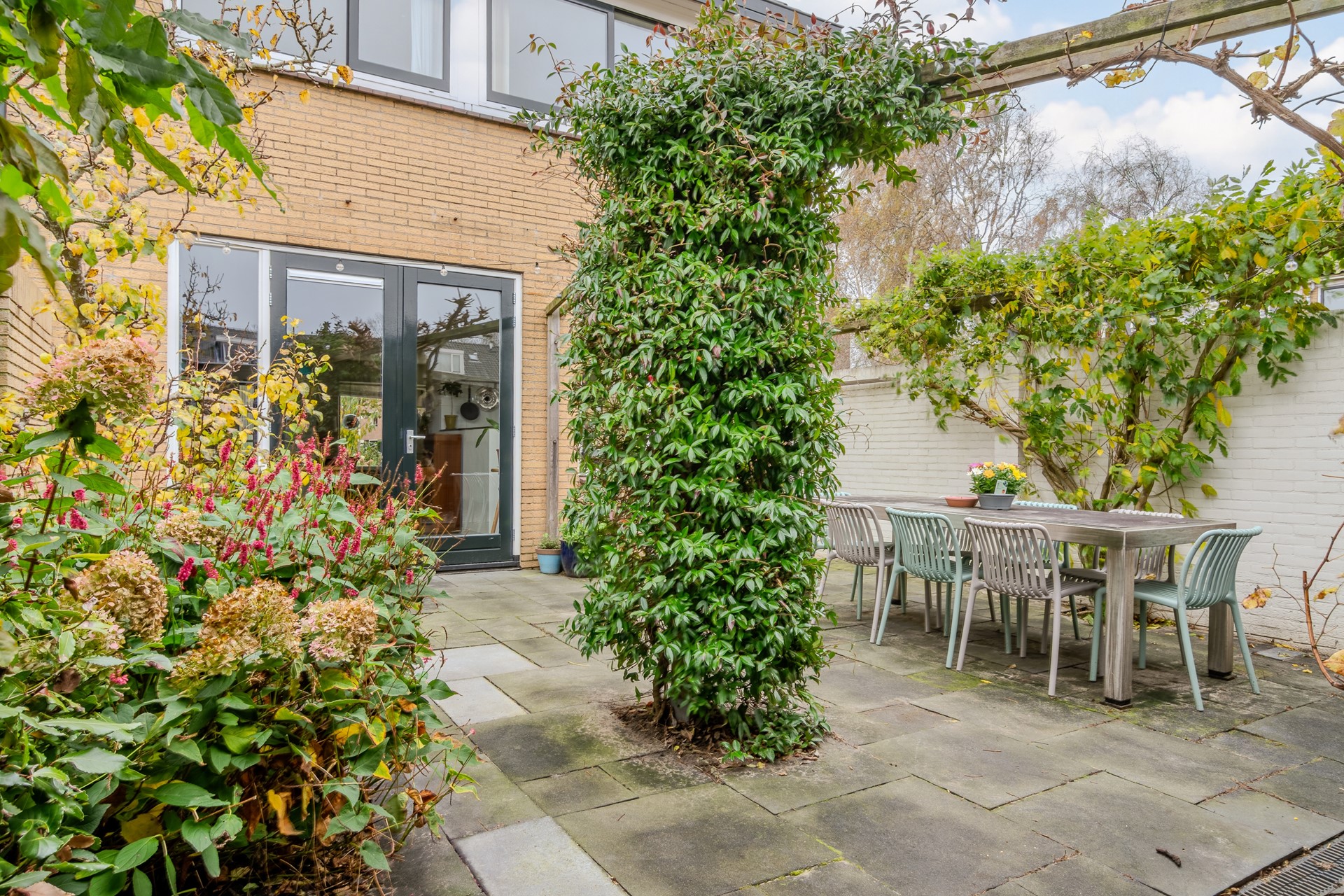 De woning beschikt over een fraai aangelegde voortuin op het oosten en een beschutte achtertuin op het westen met dubbele garage, wat het unieke verkoopargument van deze woning vormt. De tuin is onderhoudsarm ingericht, maar straalt toch weelderigheid uit. Hier kunt u heerlijk ontspannen in de gezellige tuinveranda en genieten van verse peren uit eigen tuin!