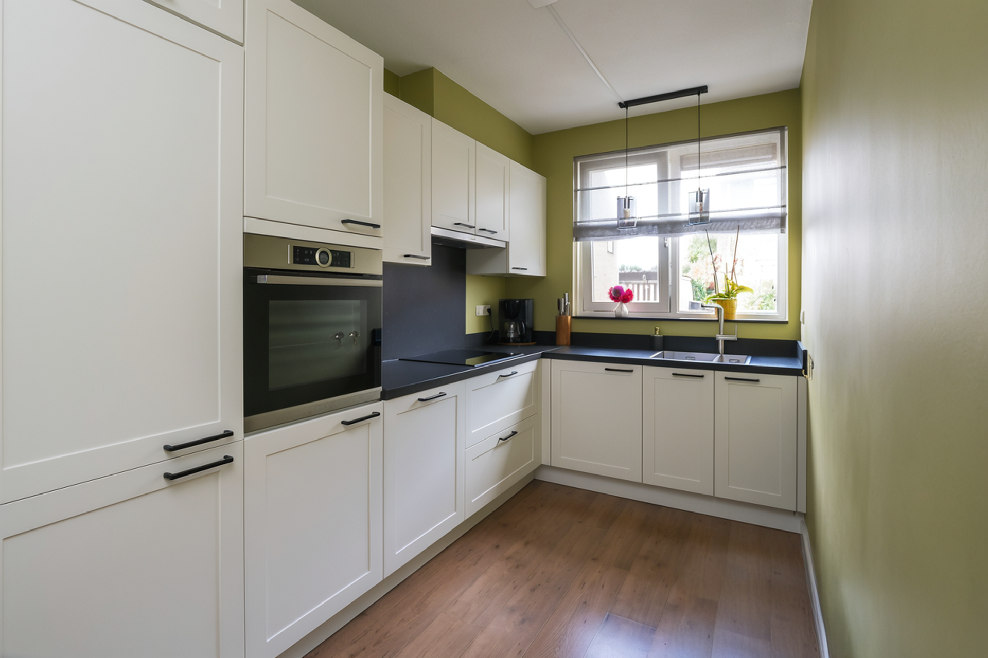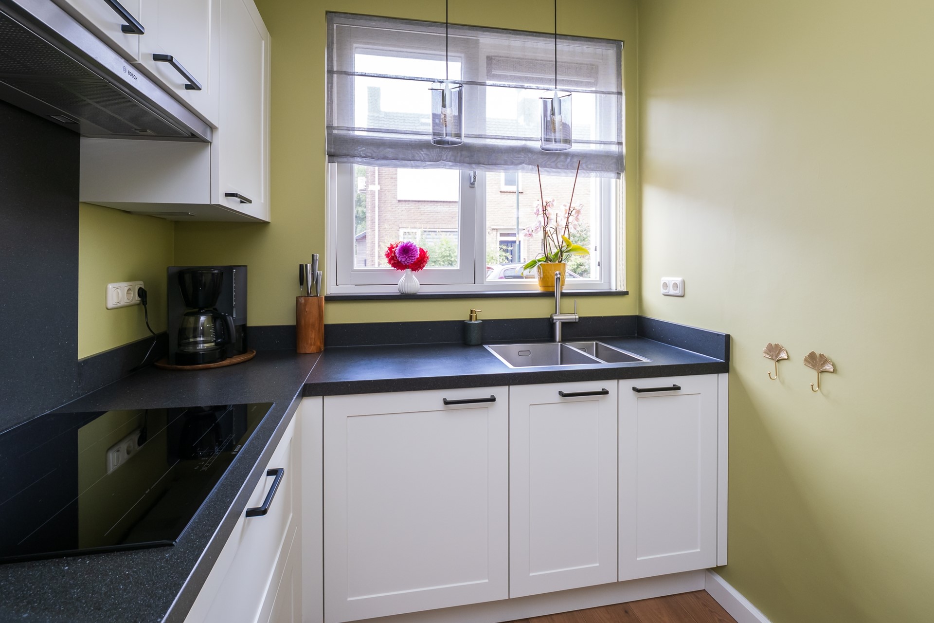 De keuken staat in open verbinding met de woonkamer en is gelegen aan de voorzijde. De keuken is in 2022 nieuw geïnstalleerd en heeft strakke kaderdeurtjes met zwarte grepen. Het werkblad, de plint, de spatwand achter het kookgedeelte en de vensterbank zijn allen uitgevoerd in duurzaam composiet. Je beschikt over een 1,5 spoelbak, inductiekookplaat, afzuigkap, heteluchtoven (met grill en ontdooifunctie), koel-/vriescombinatie, vaatwasmachine, een Le Mans carrouselkast, laden en diverse overige kastruimten. De apparaten zijn van de topmerken Bosch en Siemens. Terwijl je kookt, heb je heerlijk vrij zicht naar buiten.