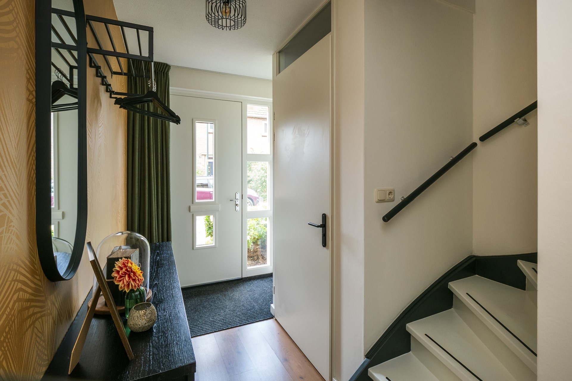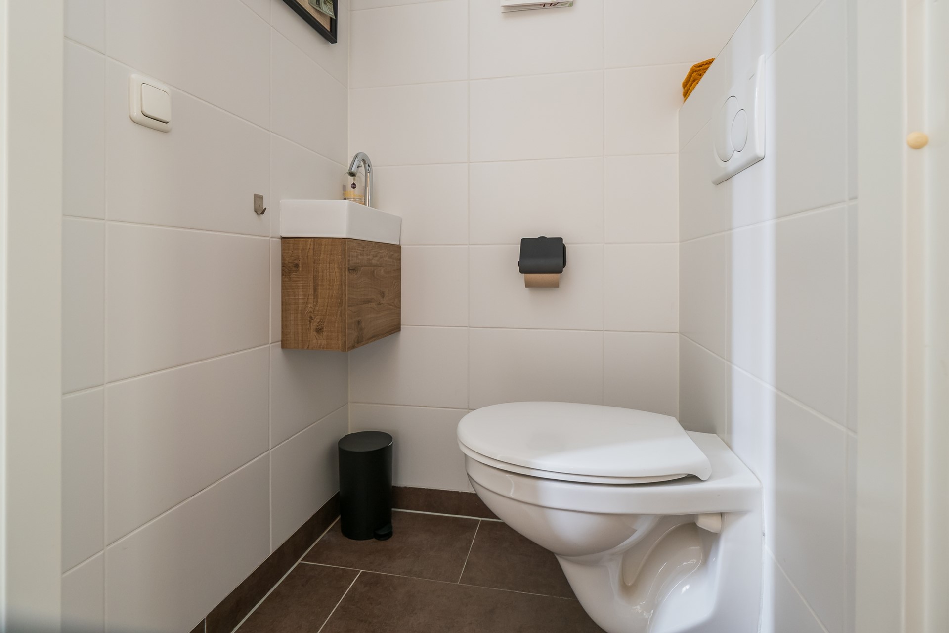 De hal is verzorgd en praktisch ingericht, met aangrenzend meterkast, moderne toiletruimte en de trapopgang naar boven. Het vele glas in de voordeurpui zorgt voor extra lichtinval. De toiletruimte is uitgerust met een wandcloset, een nieuw eikenlook fonteinmeubel en mechanische ventilatie.