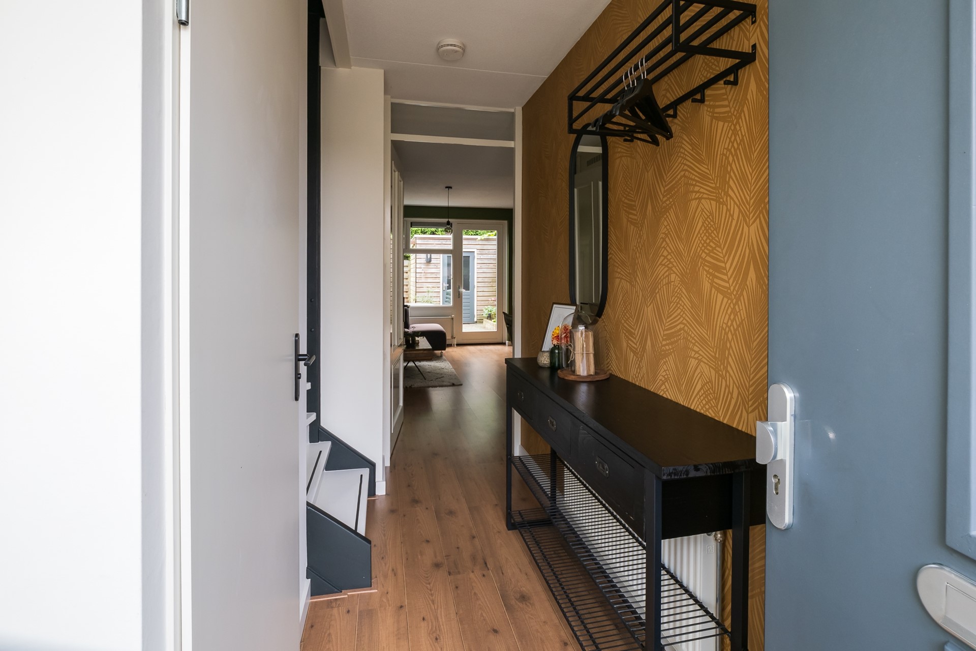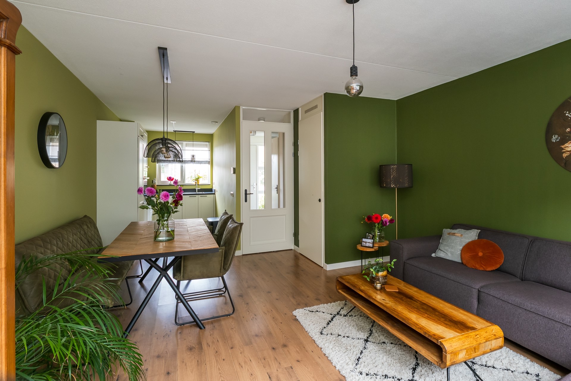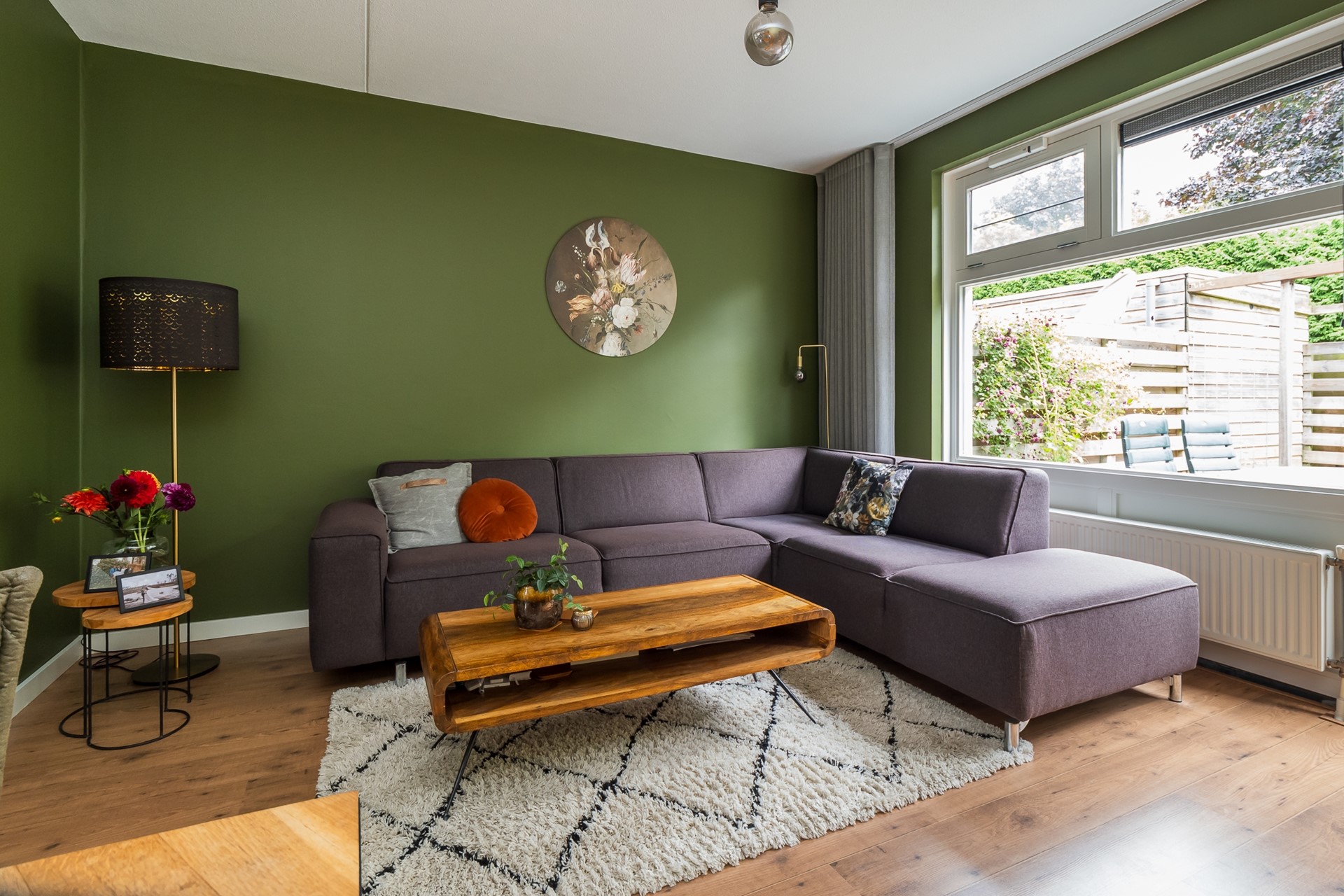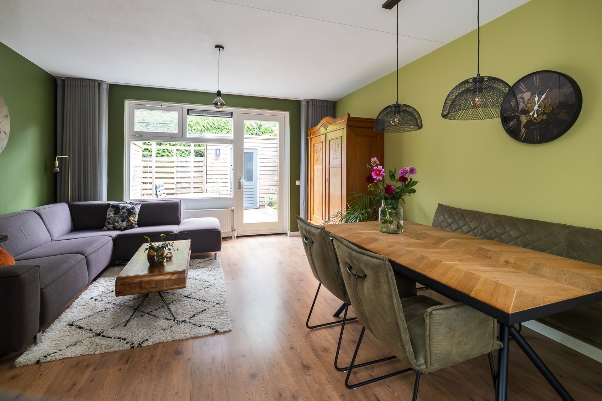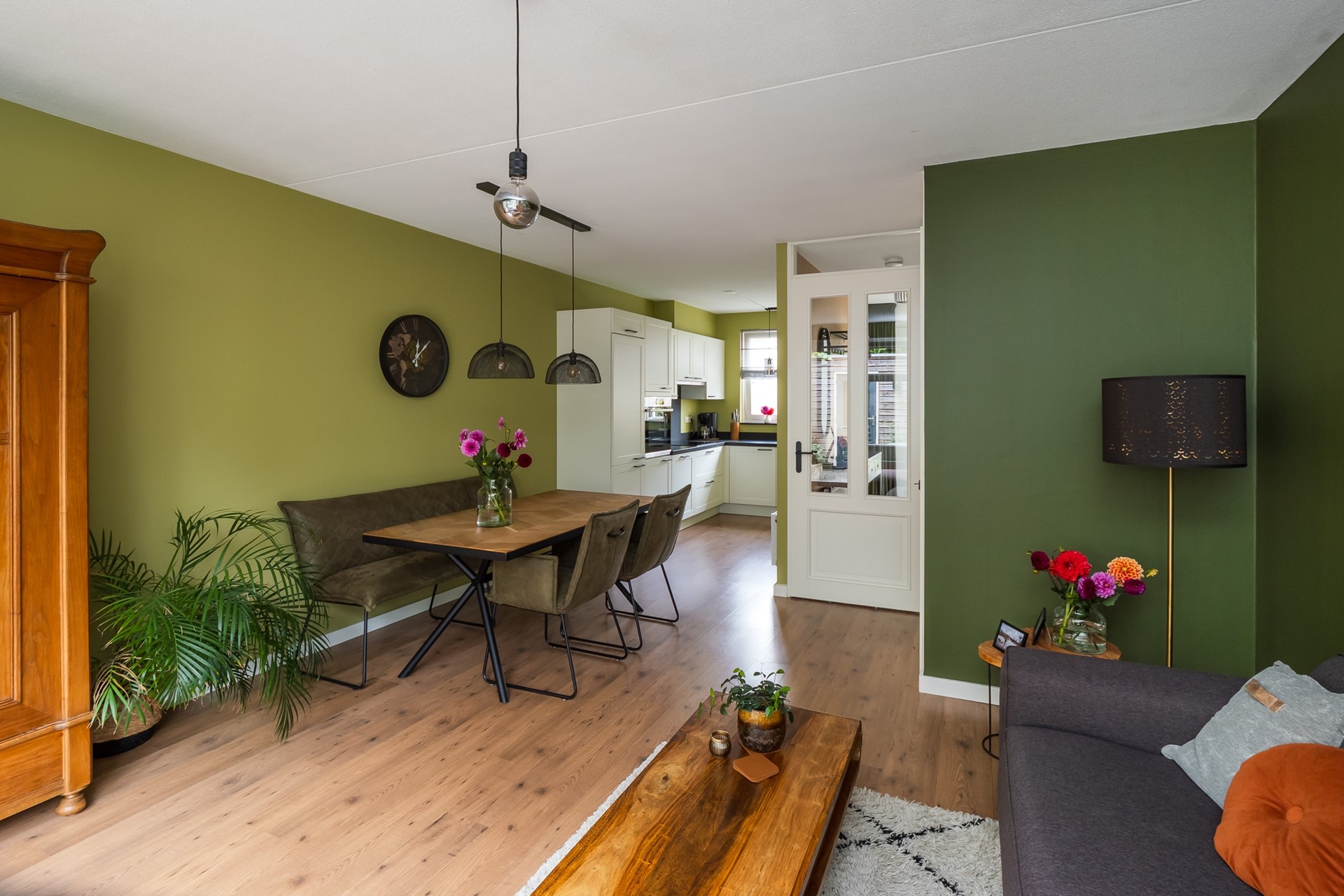 In 2022/23 kregen de begane grond en eerste verdieping een elegante restyling. Overal ligt eikenlook laminaat, dat warmte en eenheid in het interieur brengt. De wanden zijn afgewerkt met Renovlies behang, en geschilderd in aansprekende tinten, afgewisseld door enkele accentwanden met botanisch behang. Ook de plafonds en het houtwerk zijn opnieuw geschilderd. Een mooi detail dat overal terugkomt, is het zwarte beslag op de binnendeuren, wat het interieur een eigentijdse en luxe uitstraling geeft.