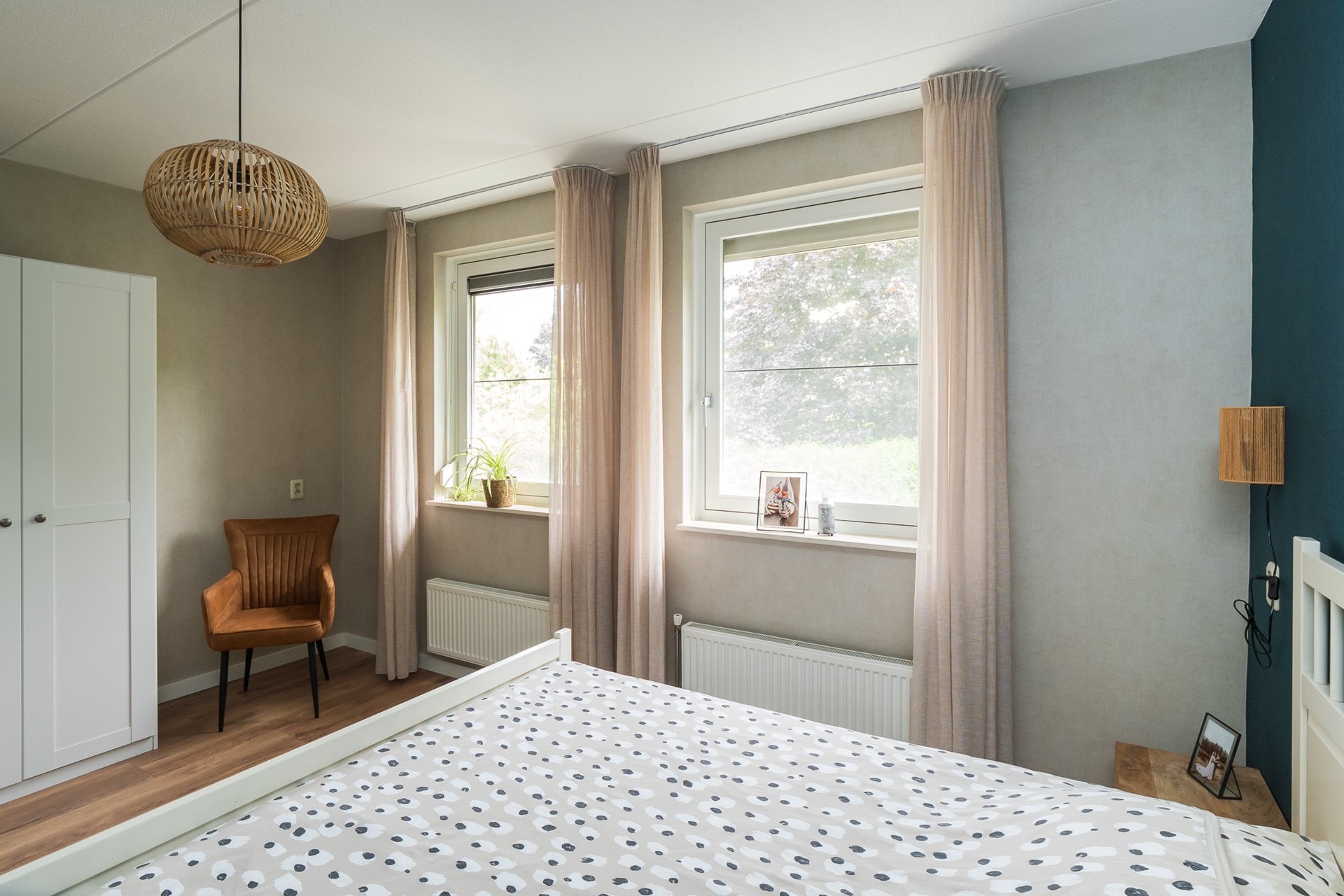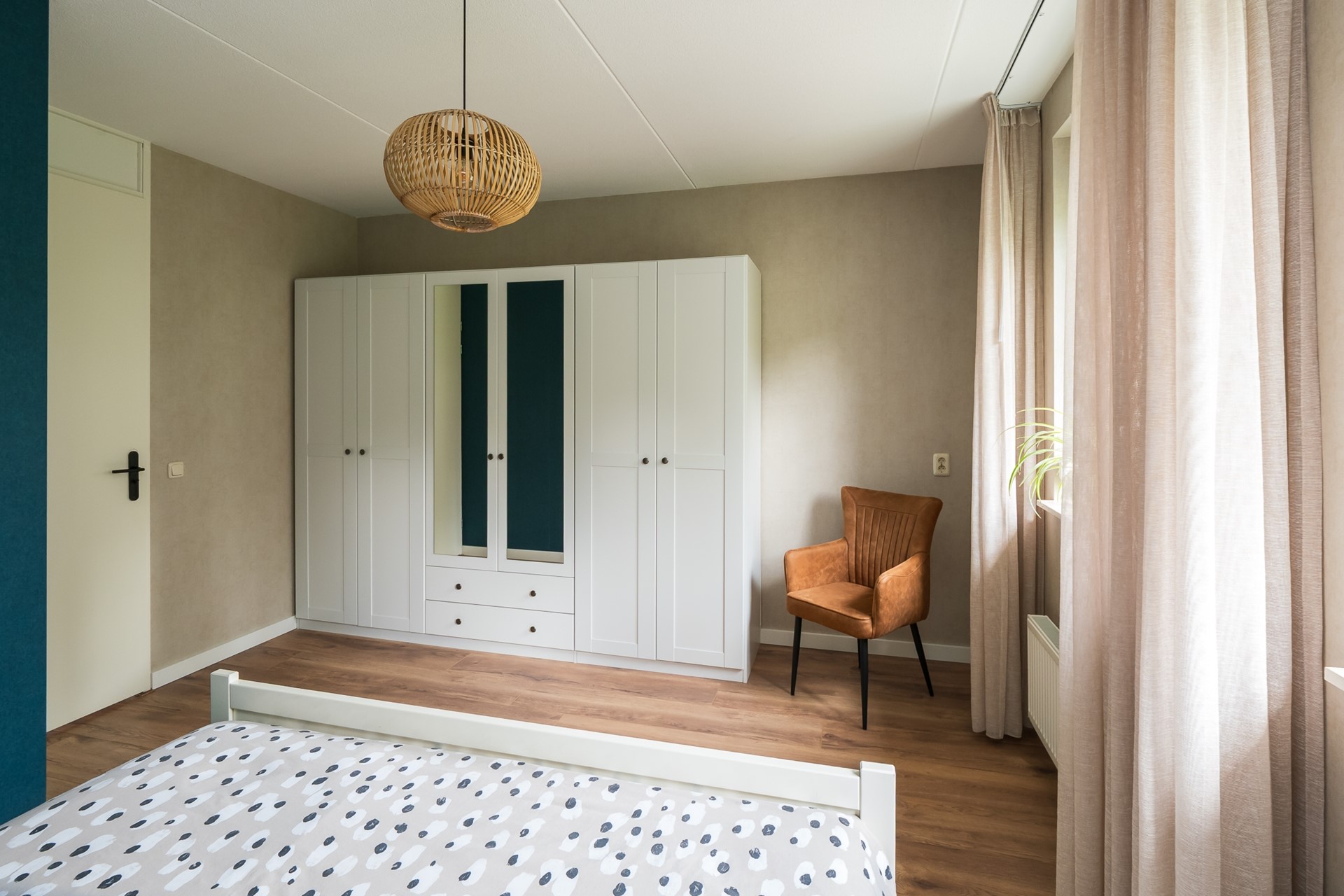 De masterbedroom is bijzonder ruim en strekt zich uit over de volledige breedte van het huis. De ruimte is uitermate geschikt om een royale boxspring te plaatsen. De royale garderobekast met hang- en leggedeelten is inclusief. In de achtergevel bevinden zich twee draai-/kiepvensters. Wanneer je naar buiten kijkt, valt direct de grote mate van privacy op. Geen bebouwing achter je perceel, maar een groene haag en bomen van een aangrenzende tuin.