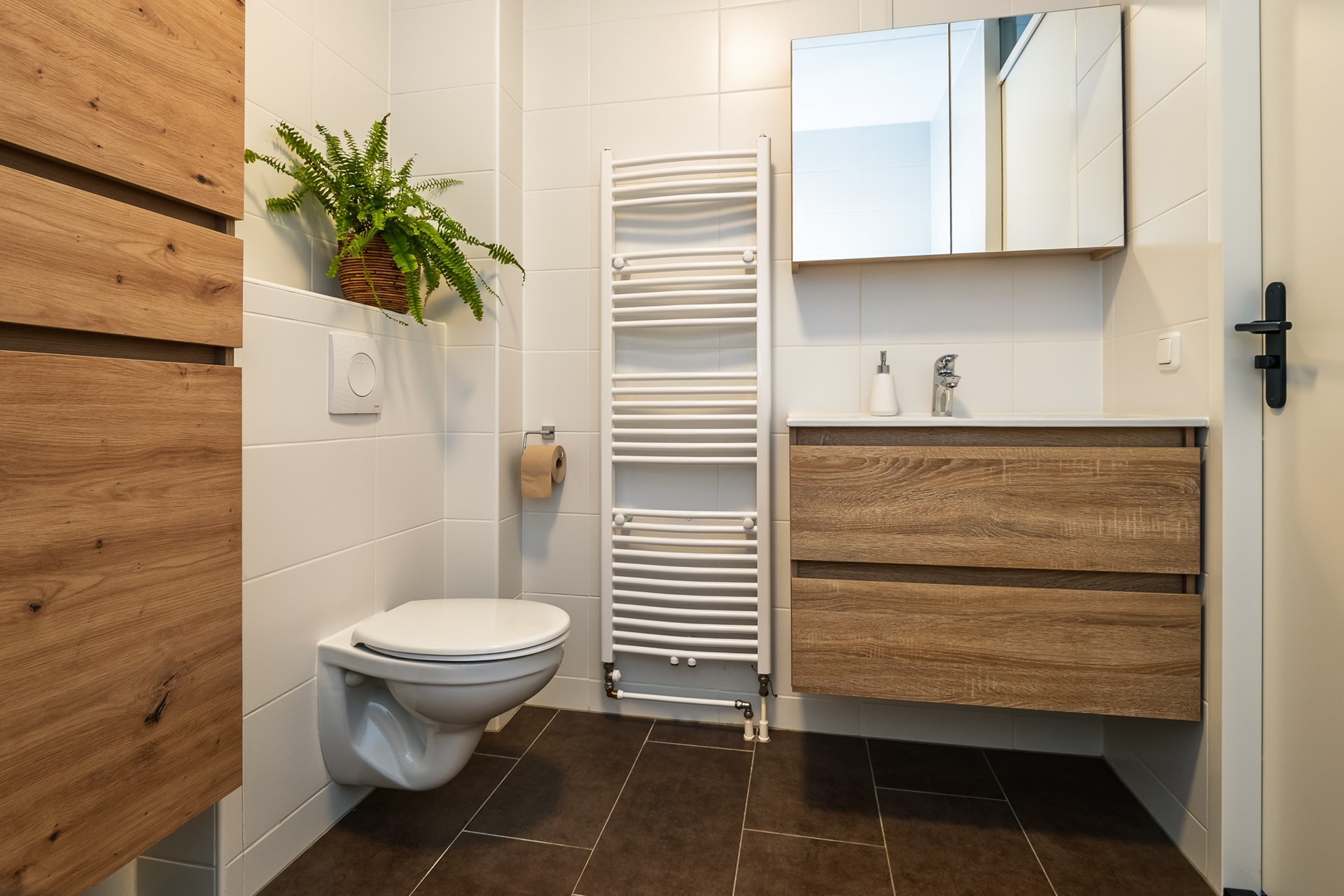 De badkamer combineert luxe en functionaliteit. Je kunt heerlijk douchen in de douchecabine met thermostaatkraan. Verfris jezelf aan het eikenlook wastafelmeubel met spiegelkast. De bijpassende hoge kast biedt extra opbergruimte. Zowel het wastafelmeubel als de hoge kast zijn in 2023 nieuw geïnstalleerd. Het wandcloset maakt het sanitair compleet. De designradiator en de mechanische ventilatie zorgen tenslotte voor een aangename temperatuur en een frisse atmosfeer.