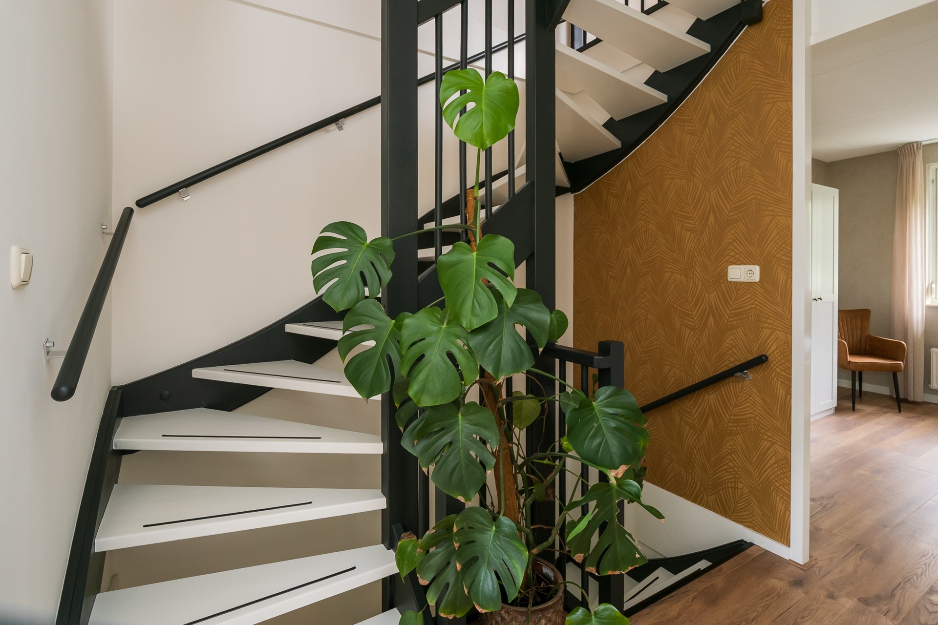 De stijlvolle trapopgang, die begin 2023 opnieuw is geschilderd, brengt je naar de overloop van de eerste verdieping.