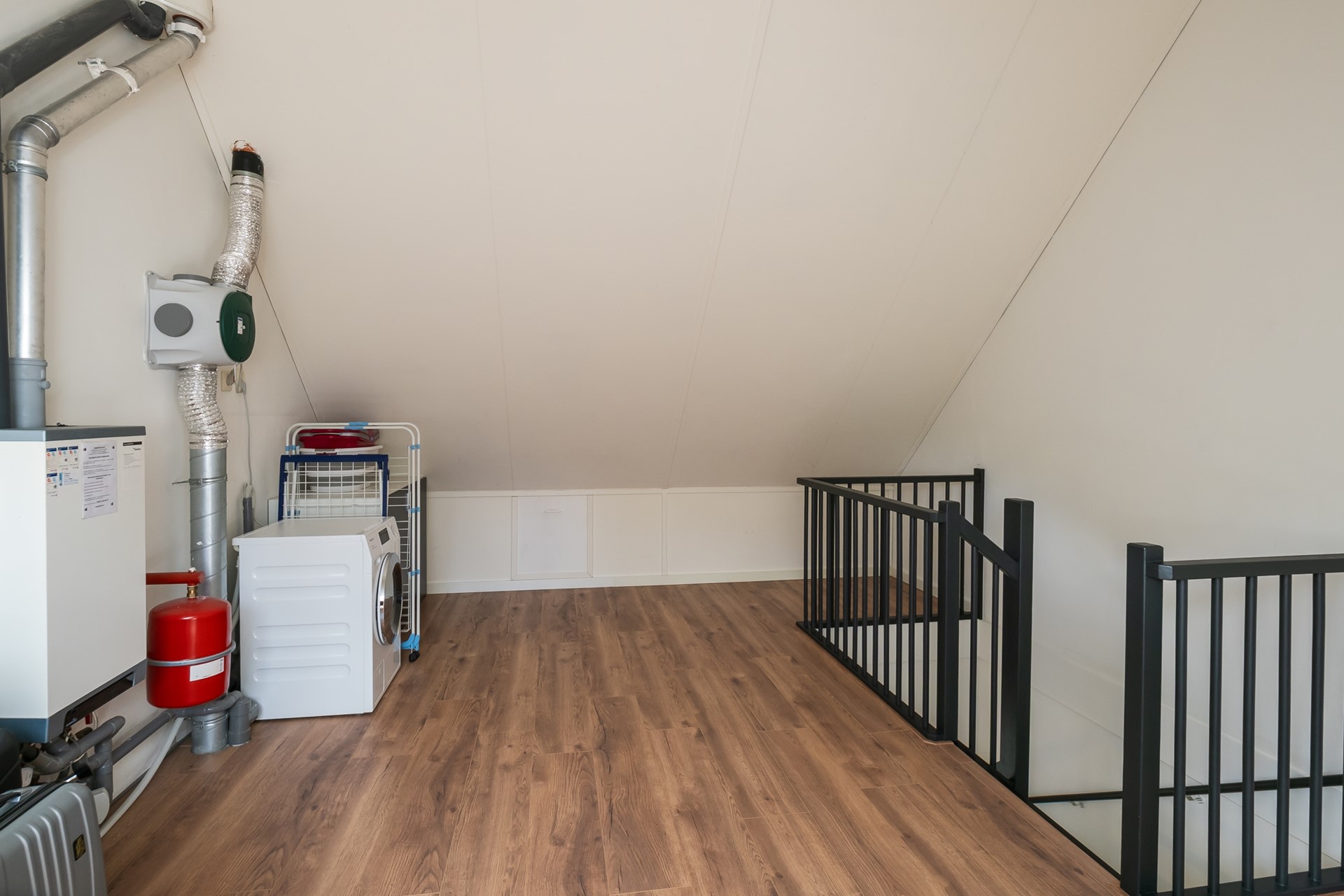 Je vindt hier de omvormer van de zonnepanelen. In het ontwerp is zelfs al rekening gehouden met uitbreiding voor een eventuele thuisaccu. Tevens bevindt hier de CV-ketel, de mechanische ventilatiebox en de wasmachine-/drogeraansluiting.