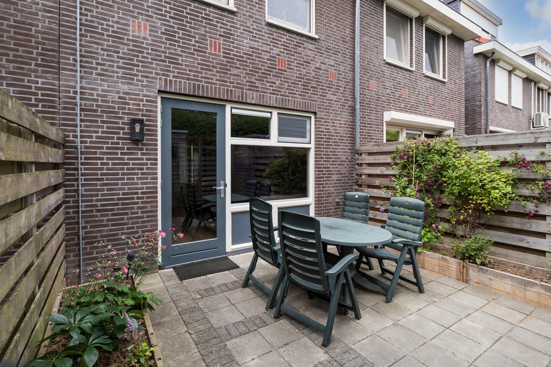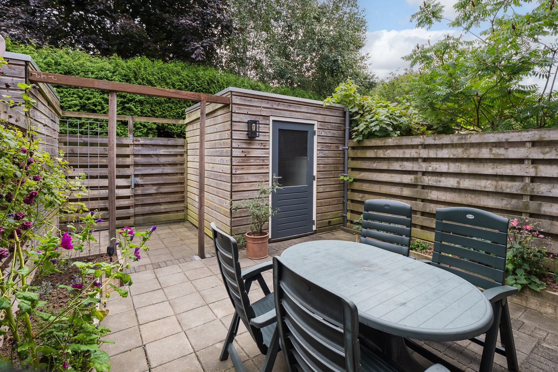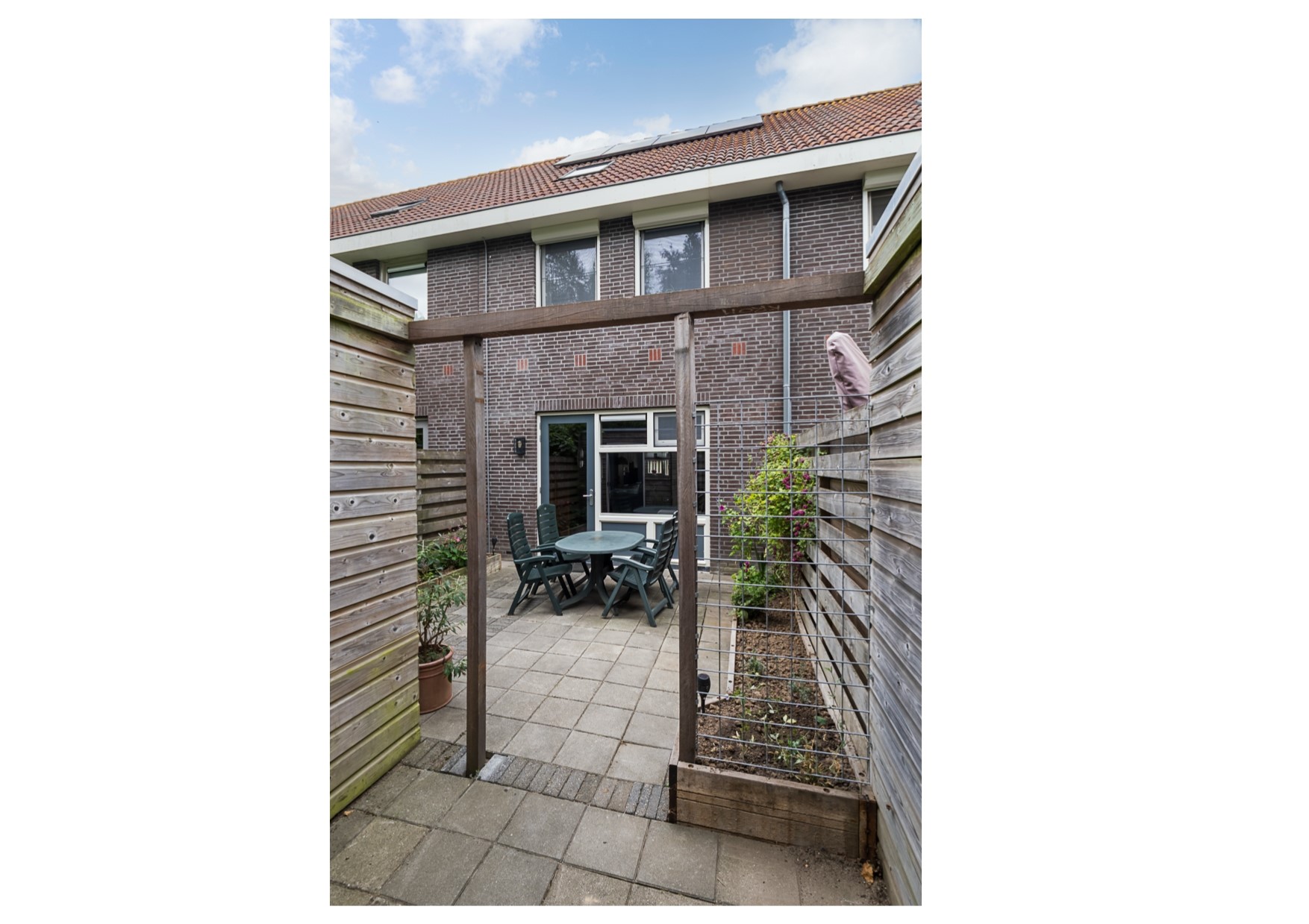 Ook achter het huis is het genieten. De achtertuin is onderhoudsvriendelijk ingericht met sierbestrating en biedt ruimte om leuke tuinset te plaatsen. De borders brengen levendigheid en kleur, terwijl de pergola zich bij uitstek leent om bijvoorbeeld een blauweregen te laten groeien voor een weelderige entourage. Privacy wordt gegarandeerd door de houten erfafscheiding. Doordat je geen directe achterburen hebt, ervaar je optimale privacy en geniet je van een horizon met groen, bomen en blauwe luchten. De houten berging met elektra biedt praktische opbergruimte. De achterom zorgt voor een handige ontsluiting op de Karel Doormanstraat.