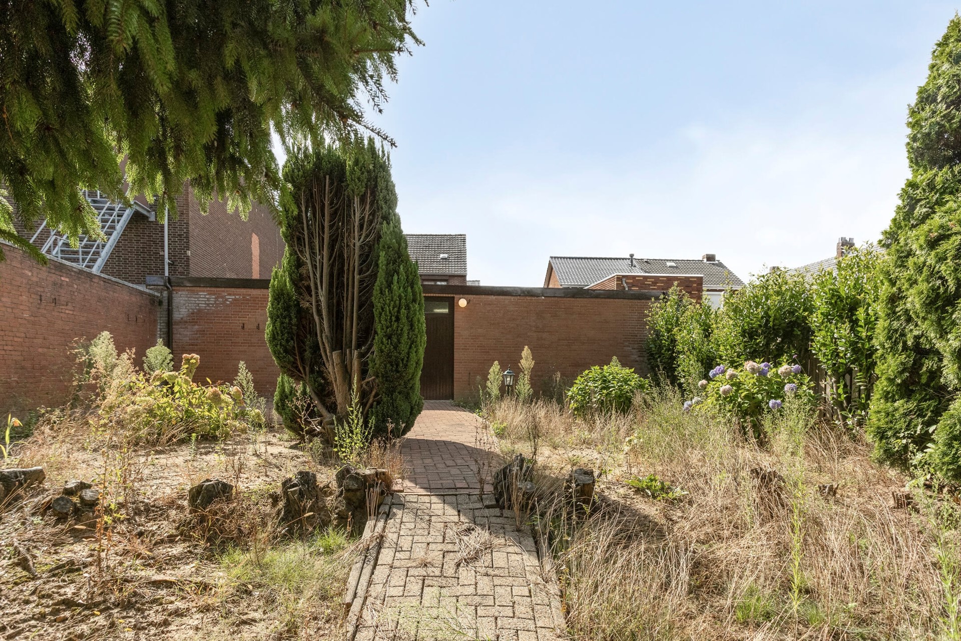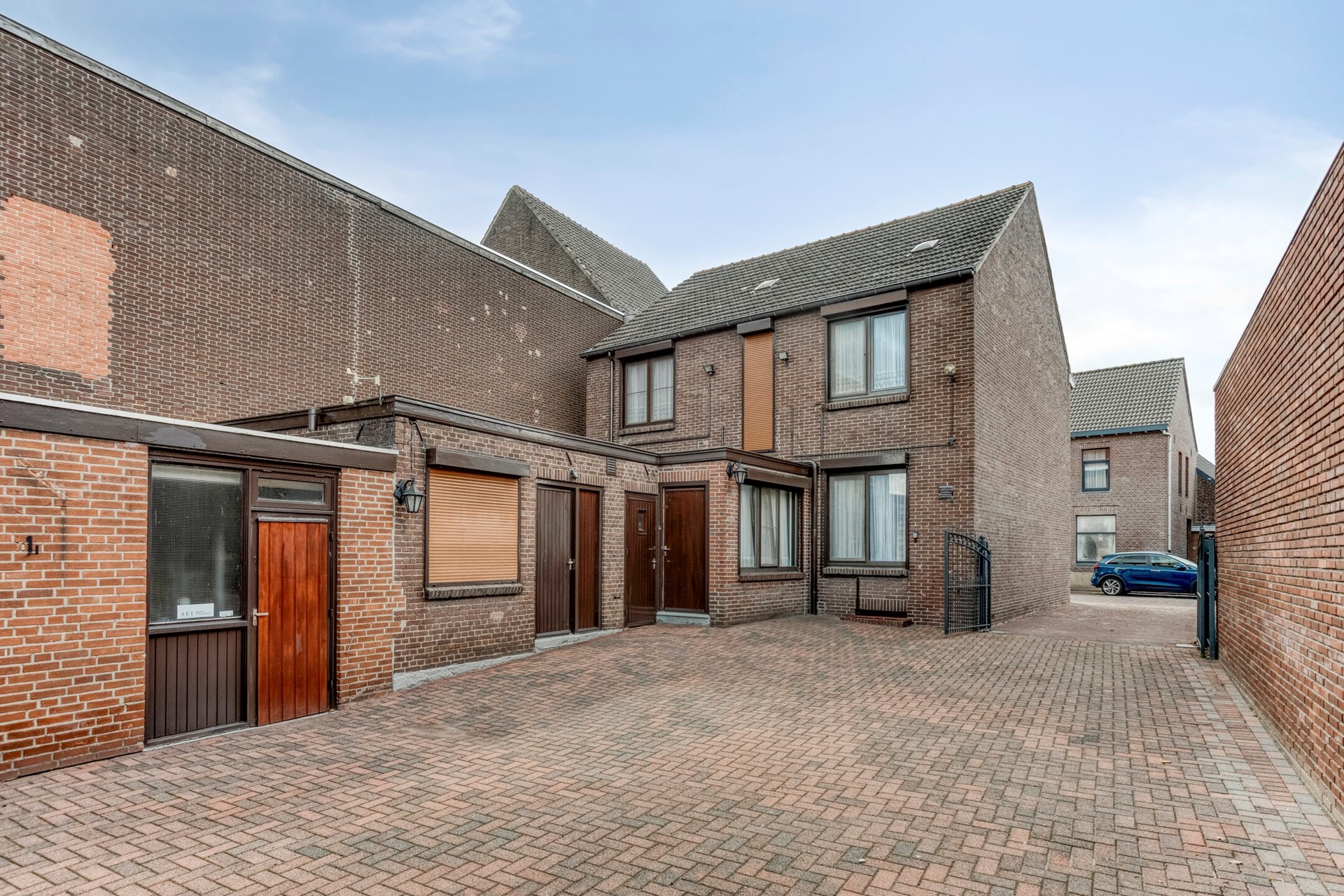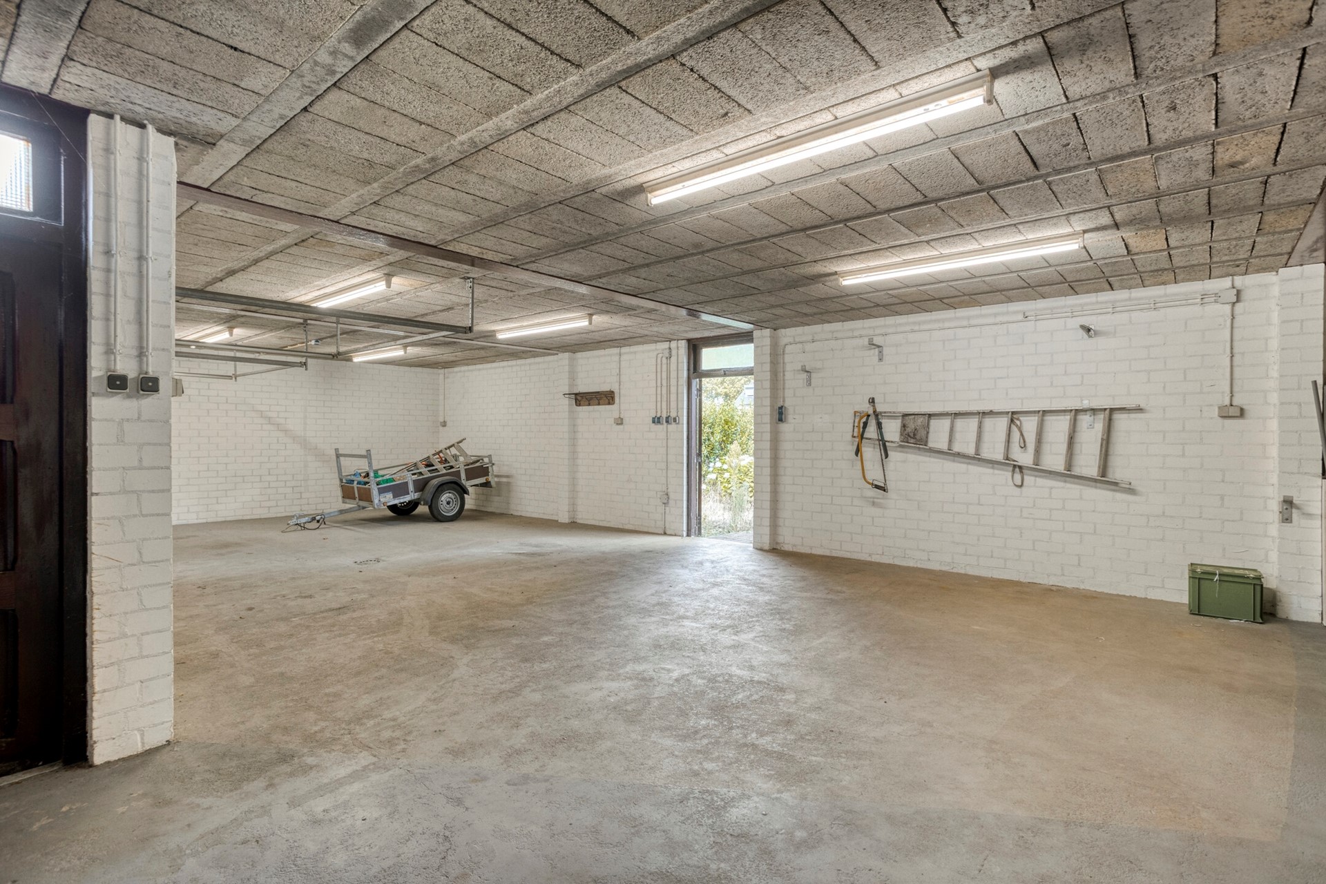 De oprit naast de woning geeft toegang tot de middels een poort afsluitbare binnenplaats, de garage en de berging met c.v.-opstelling. De garage is ca. 80 m² groot en is voorzien van twee poorten en deuren naar de binnenplaats en de tuin.