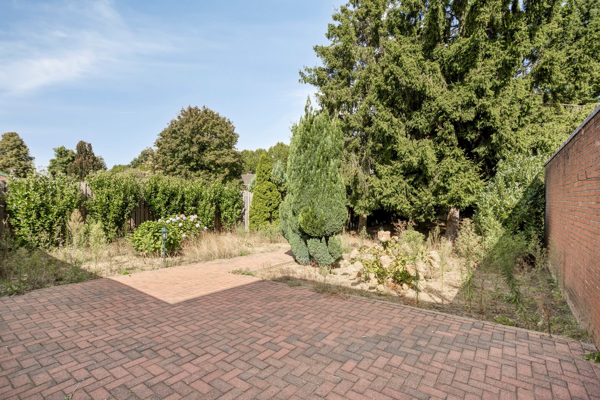 De ruim 600 m² grote tuin ligt verscholen achter de garage en biedt veel privacy. De tuin is voorzien van een terras, bomen en beplanting.