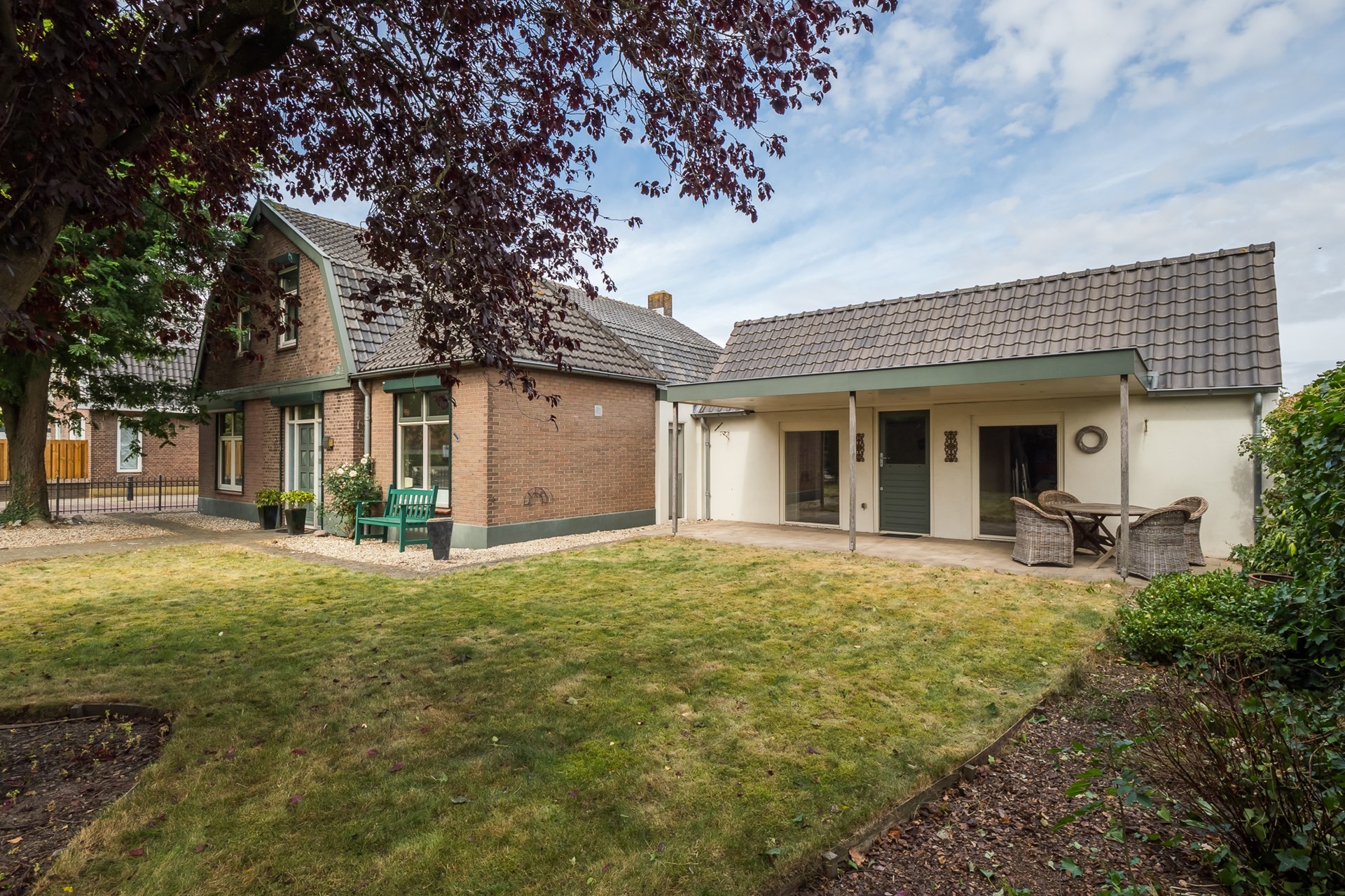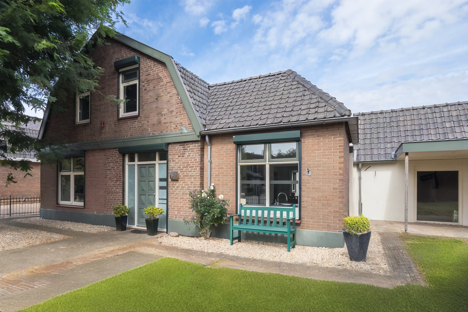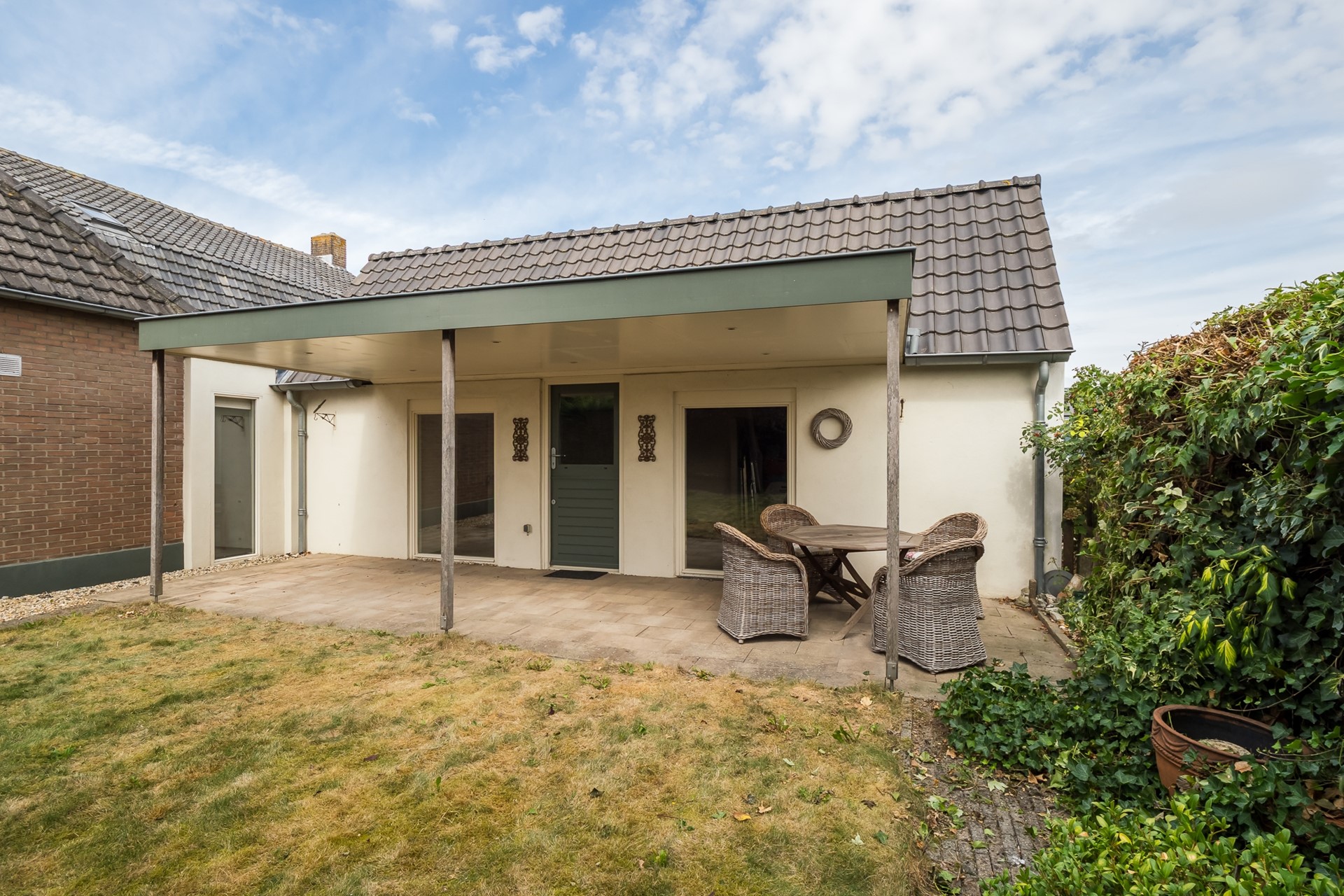 De klinkerbestrating loopt vanaf de oprit door naar een besloten plaats tussen drie gevels; ideaal om een intieme, beschutte zitplek te creëren. Hier vind je ook de overdekte entree naar de woonkeuken, een fijne overgang tussen binnen en buiten.
