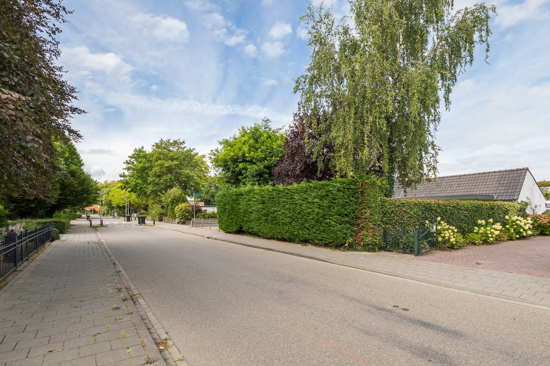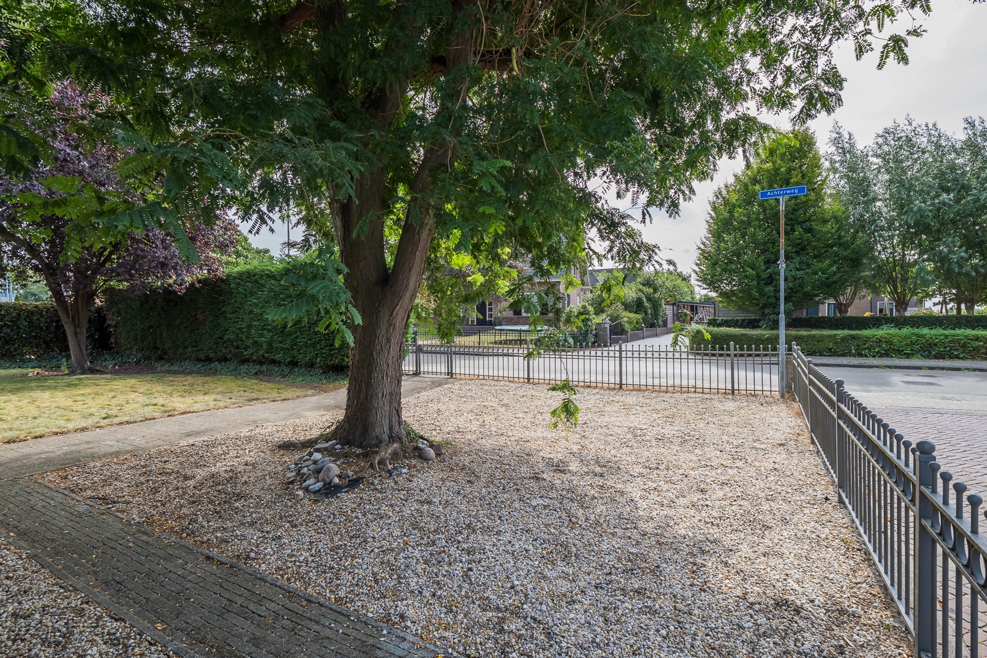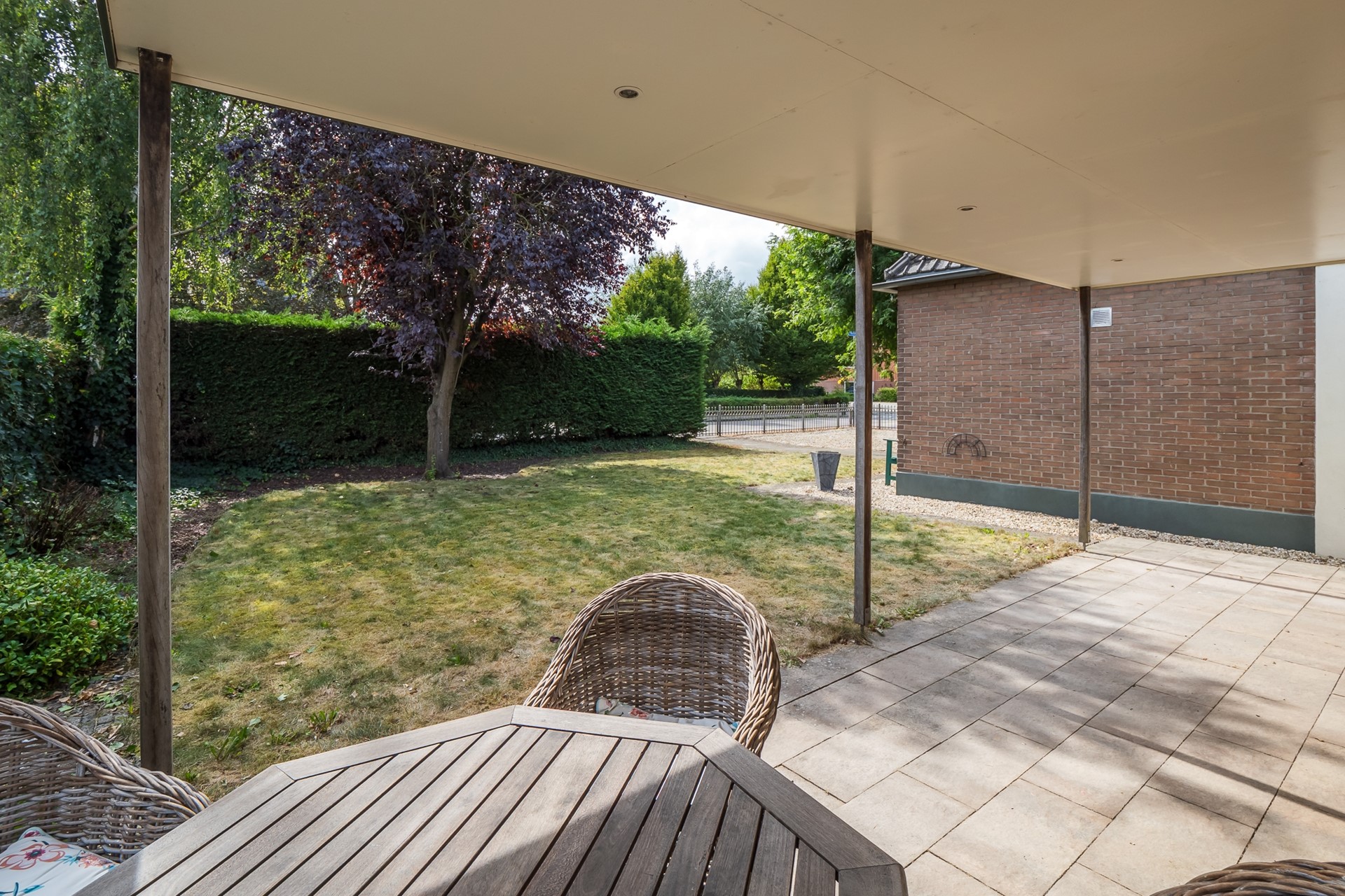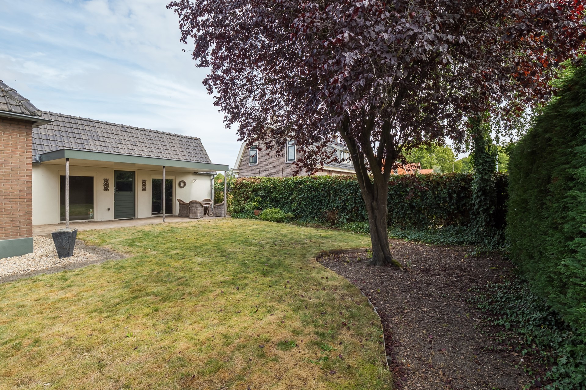 De tuin is aangelegd om in alle privacy van te genieten. De ruime veranda, georiënteerd op de zuidzijde, is een uitnodigend verlengstuk van je woning. Met een verharding van tegels, stopcontacten en dimbare inbouwspots is dit dé plek voor een ontspannen ochtend met koffie of voor lange zomeravonden. Vanaf hier kijk je mooi uit over het groene gazon en de markante rode beuk. De natuurlijke erfafscheiding van hedera en coniferen zorgt voor privacy. Het tweede deel van de tuin is georiënteerd op de straatzijde en heeft een ander karakter. De royale grindborder, het indrukwekkende silhouet van de acaciaboom en het lage sierhekwerk langs de erfafscheiding geven het geheel een fraai aanzicht.