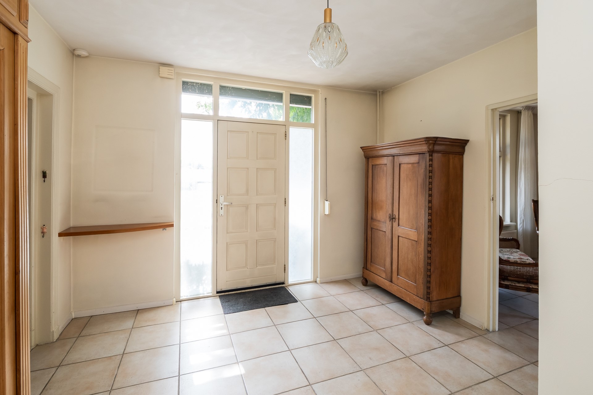 De ontvangsthal heet je welkom in dit geweldig ruime huis. De plavuizenvloer en de strakke finish op wanden en plafond zetten meteen de toon van dit huis: licht, ruim en verzorgd. Deze afwerking ademt ook door in de overige vertrekken. Je vindt in deze hal de garderobe, een toiletruimte en de toegang tot de living en het kantoor.