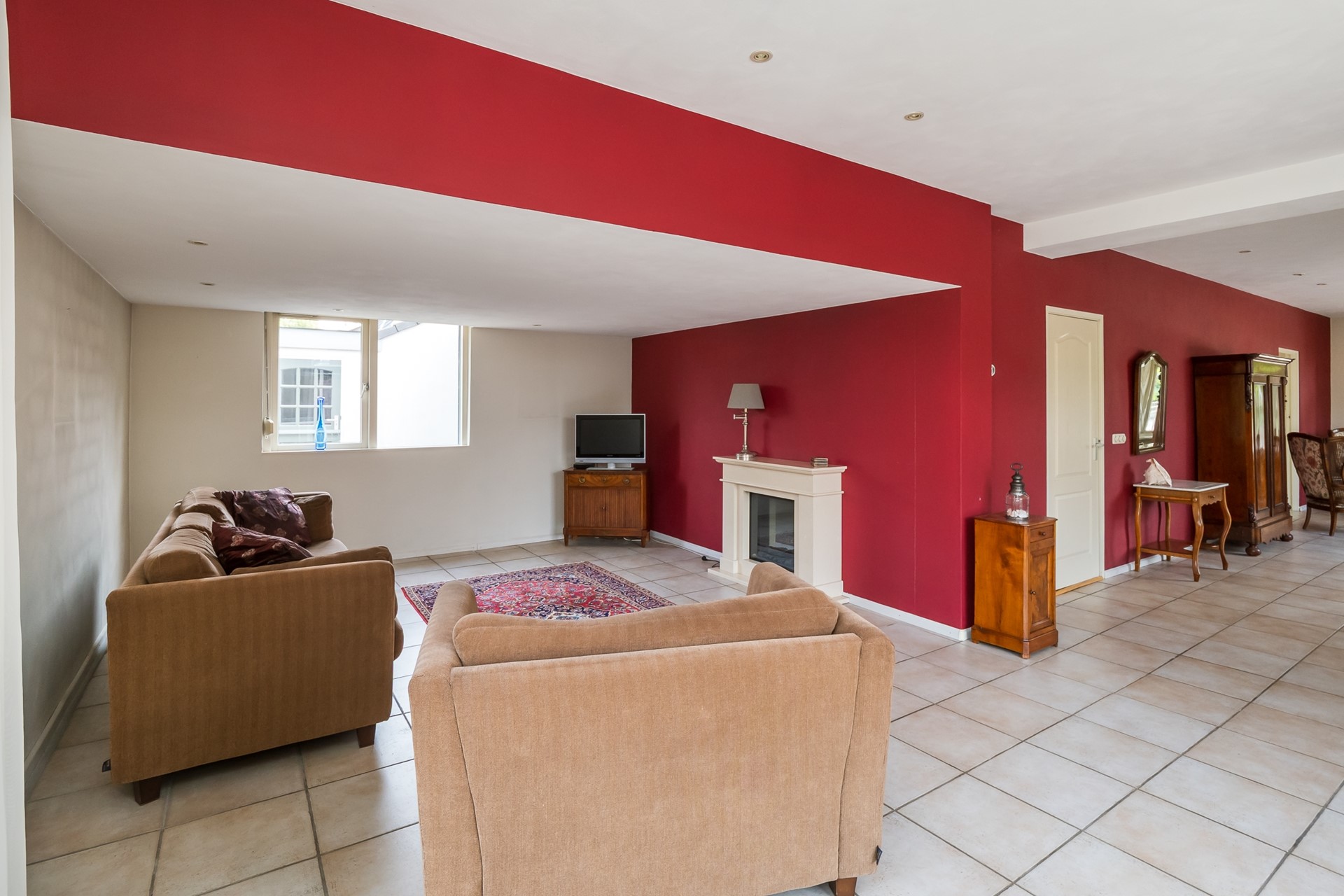 De L-vormige living is opvallend ruim en biedt mogelijkheden. Dankzij de vele ramen geniet je van een aangename lichtinval en een optimale verbondenheid met buiten. Als de avond valt verspreiden de inbouwspots in het plafond een sfeervolle verlichting. Het zitgedeelte heeft een verlaagd plafond en een natuurstenen schouw met elektrische sfeerhaard. Met maar liefst 64 m² biedt deze living de mogelijkheid een gedeelte af te splitsen, waardoor je eenvoudig een extra kamer kunt creëren.
