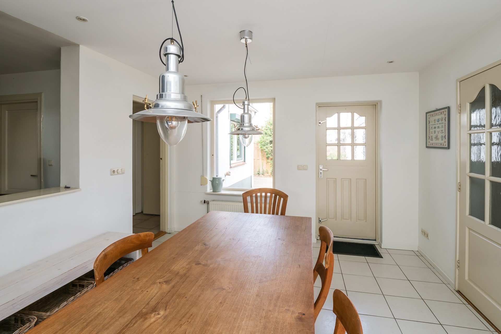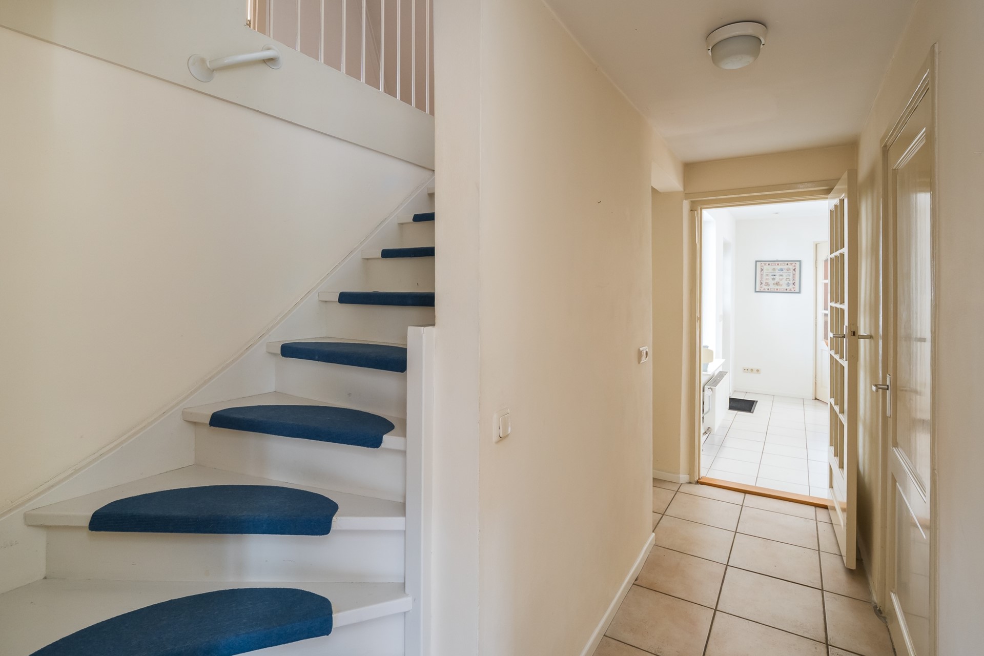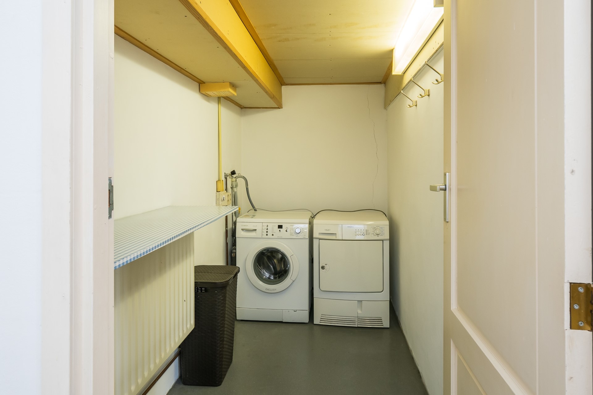 Aan de keuken grenst een tweede portaal met vaste kasten, dat toegang biedt tot de wasruimte en de atelierruimte.