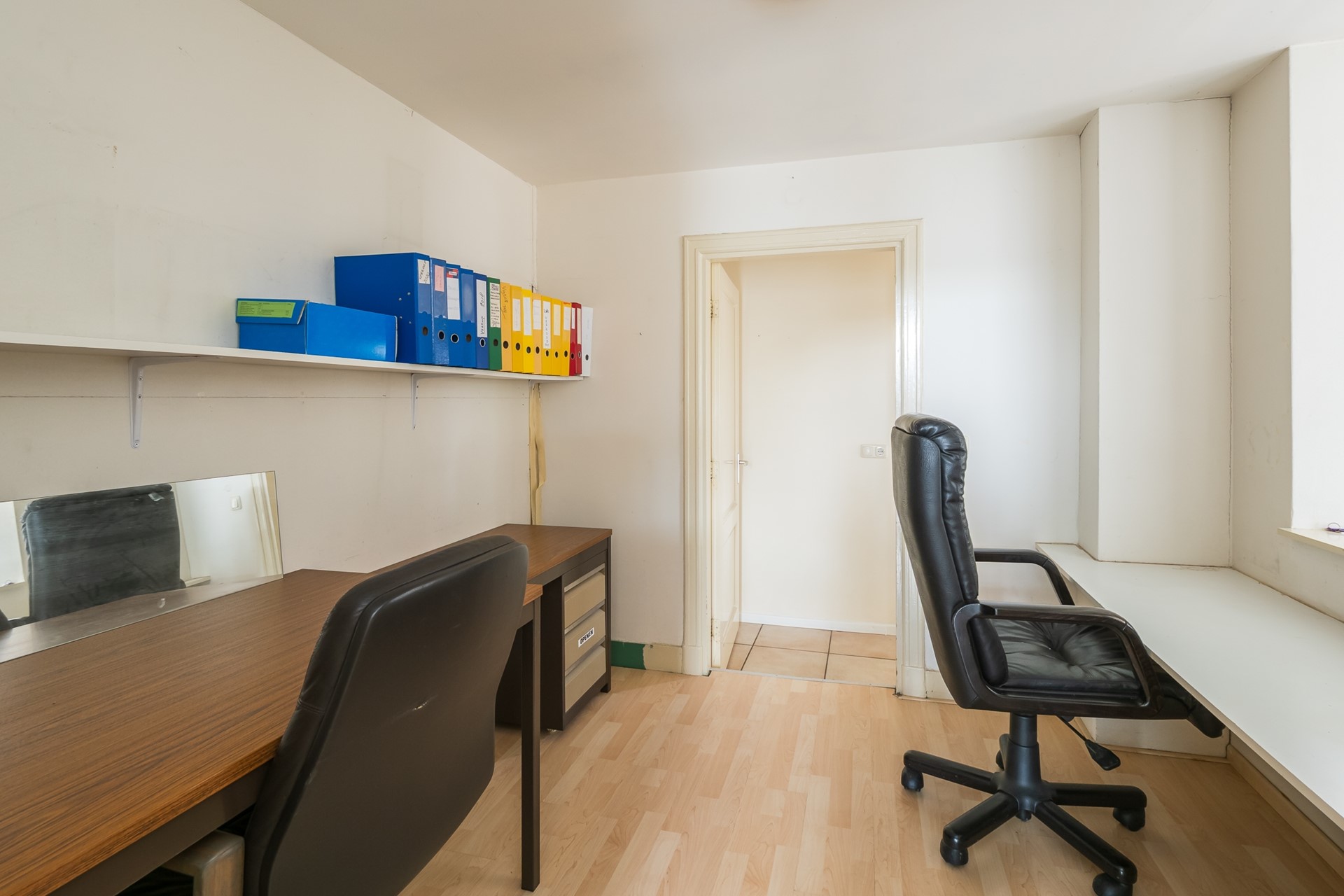 De kantoorruimte biedt een fijne werkplek. Dankzij de uitsparing in de wand is er een open verbinding met de woonkeuken, wat zorgt voor een leuke dynamiek.