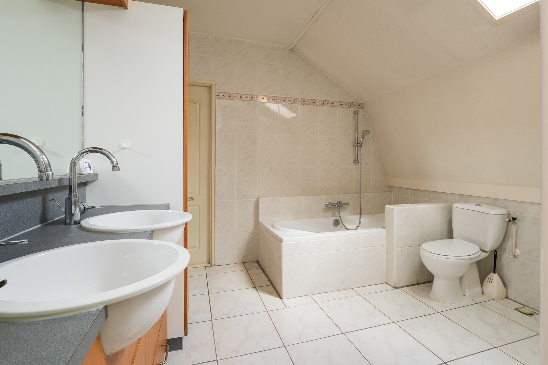 De royale badkamer is zeer compleet ingericht met een ligbad, douchecabine, toilet en een duo-wastafelmeubel met spiegel en verlichting. Het Velux-dakvenster zorgt voor daglicht en ventilatie. Gezien de royale opzet biedt deze badkamer ook alle ruimte om naar eigen smaak te moderniseren.