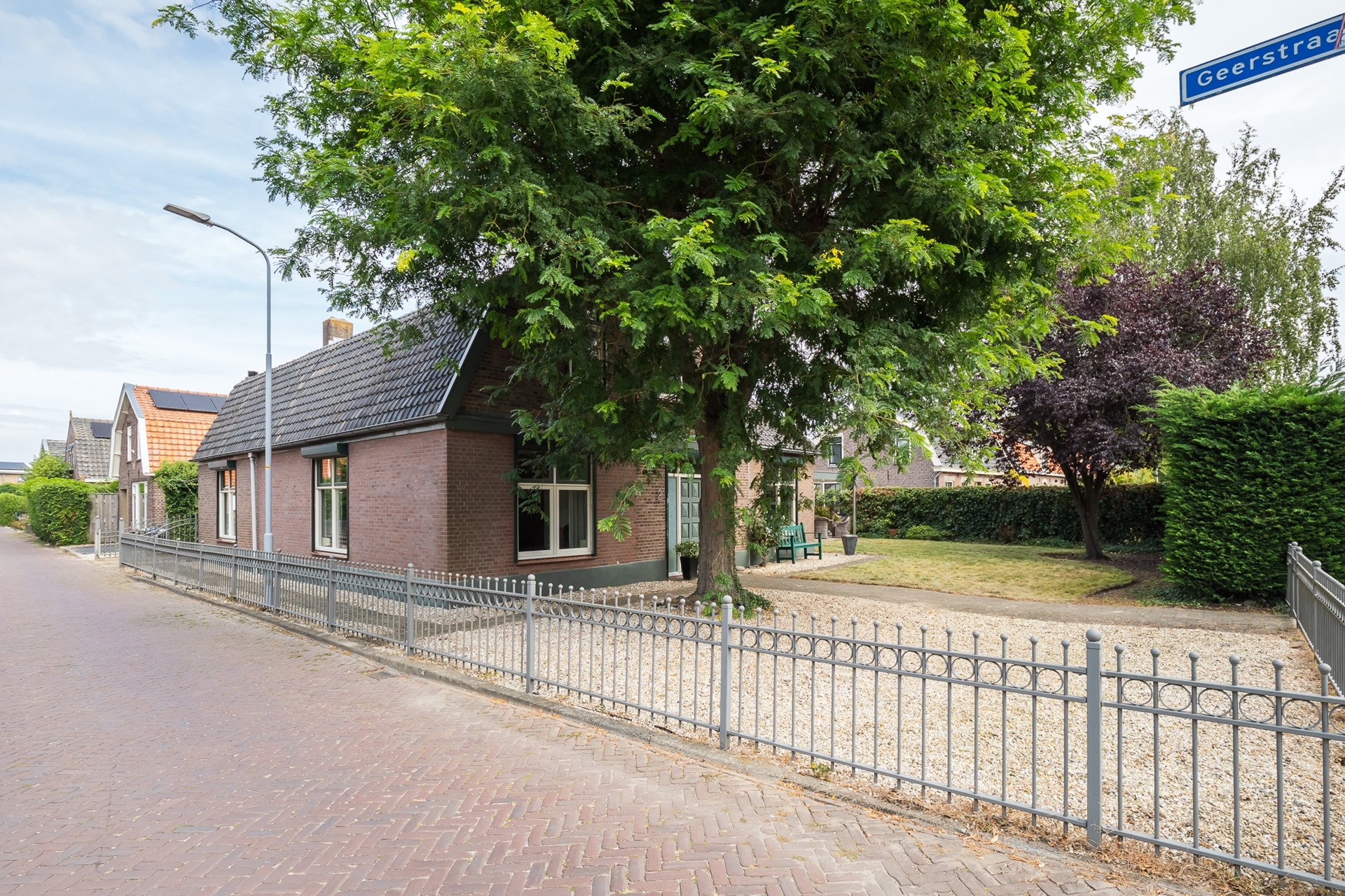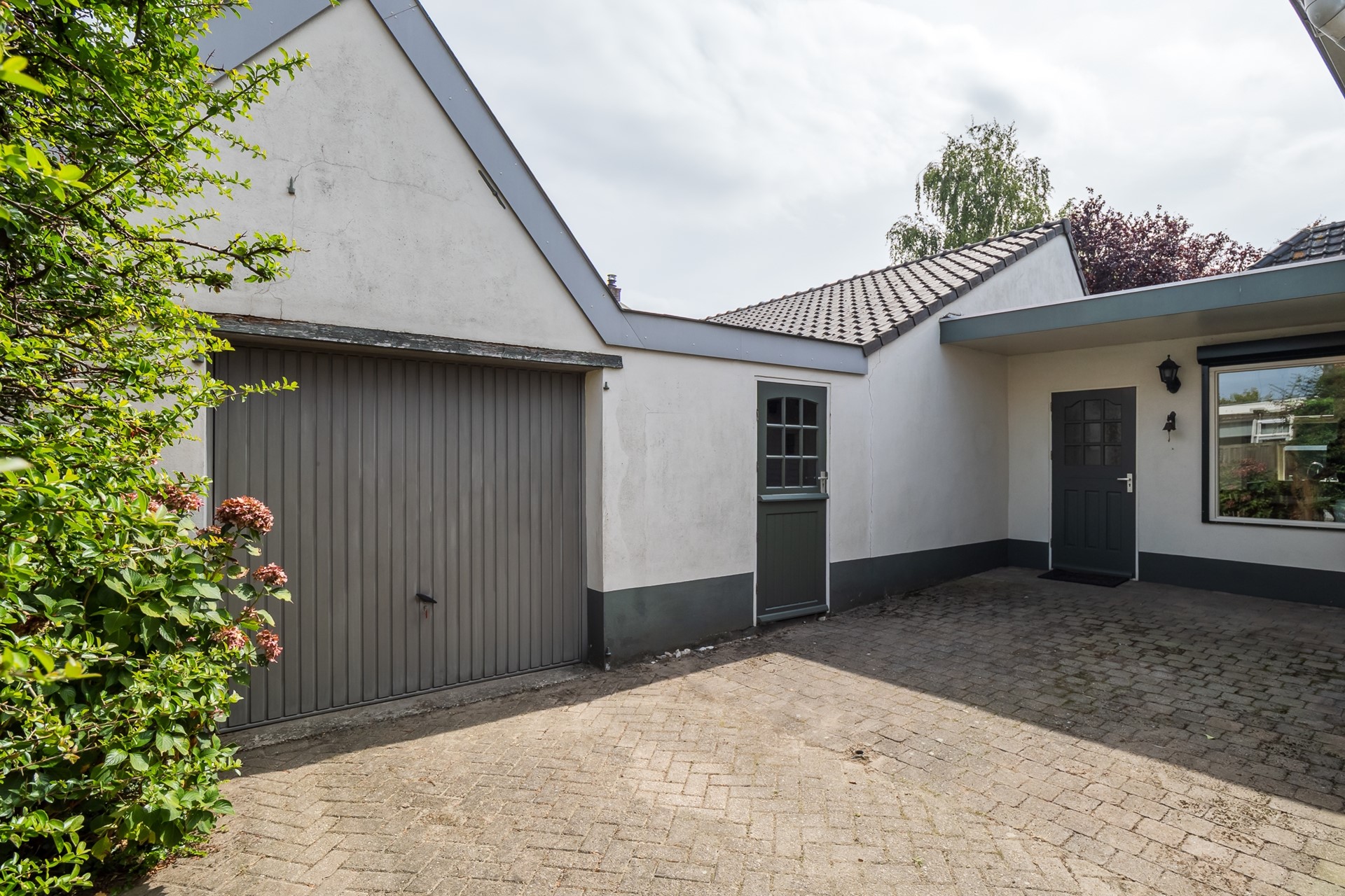 De oprit van klinkerbestrating brengt je langs het huis naar de garage.