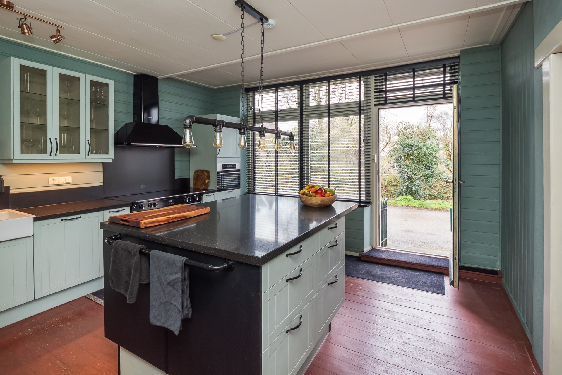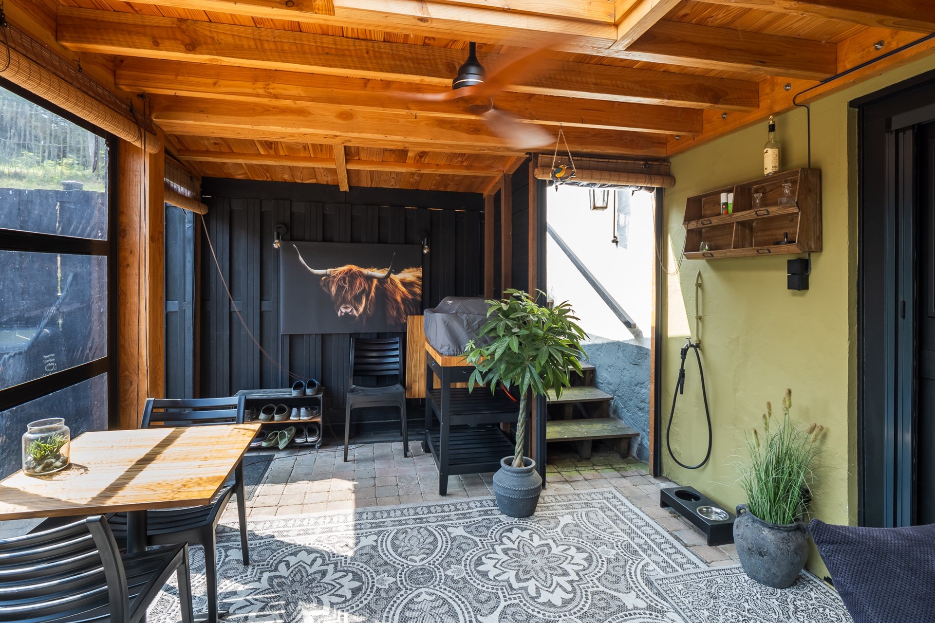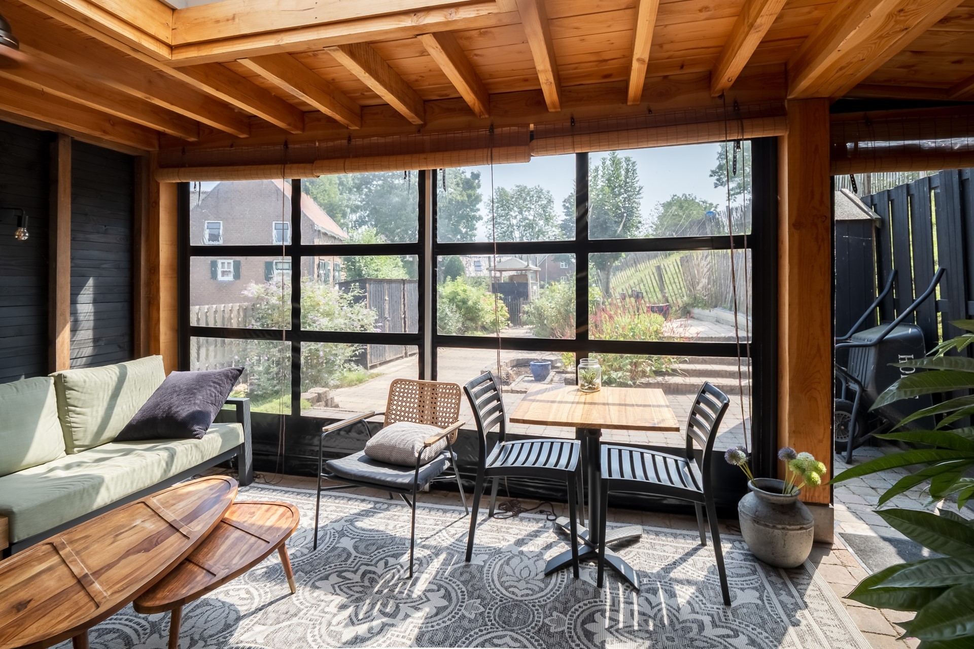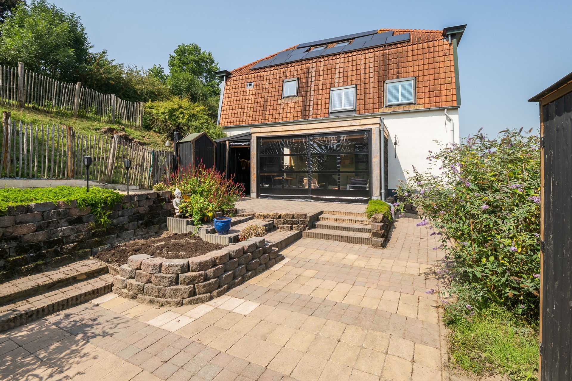 De royale veranda is een plek waar je het hele jaar door kunt zitten: lange zomeravonden, rustige herfstdagen en zelfs beschut in de winter. De tuin is speels aangelegd met verschillende niveaus, waardoor er altijd een fijne plek te vinden is.