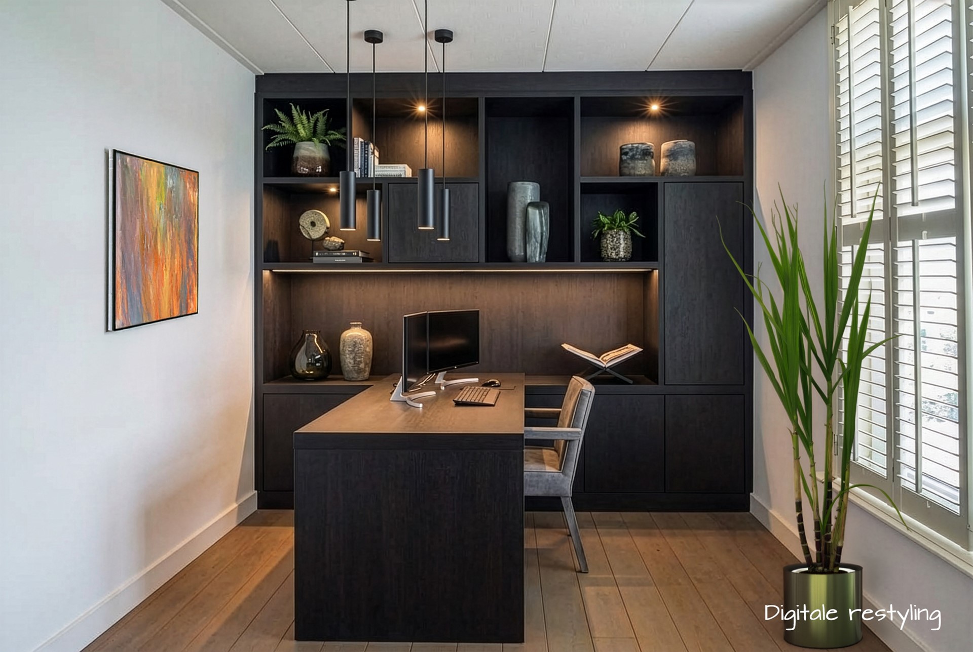 Werkkamer: Met het terugbrengen van spullen, het creëren van rust en het toevoegen van sfeerlicht verandert een volle opslagruimte in een hoogwaardige werk- of studeerkamer. We laten je hiermee overtuigend zien dat dit kan zonder dat er ook maar één muur is verplaatst.