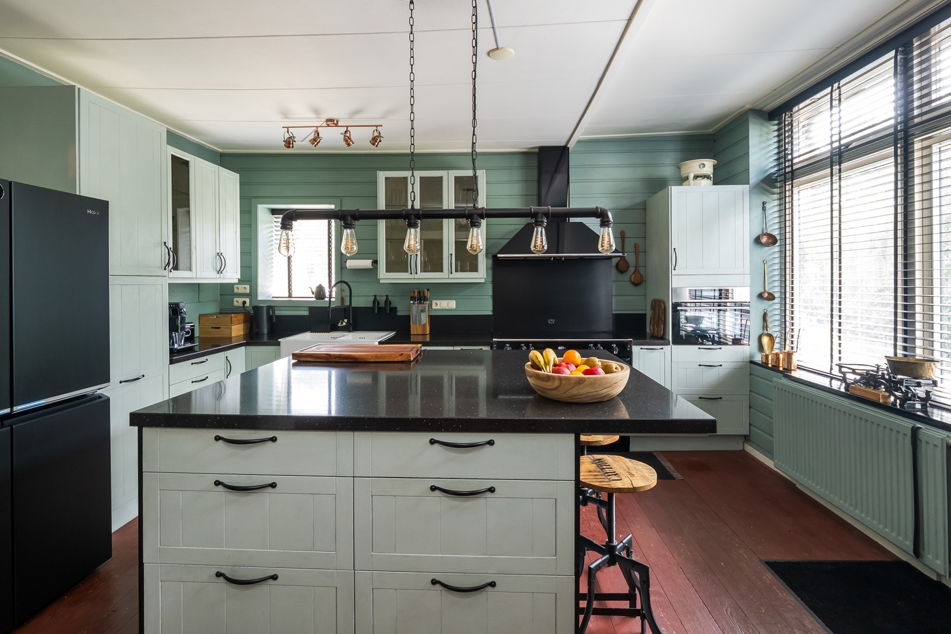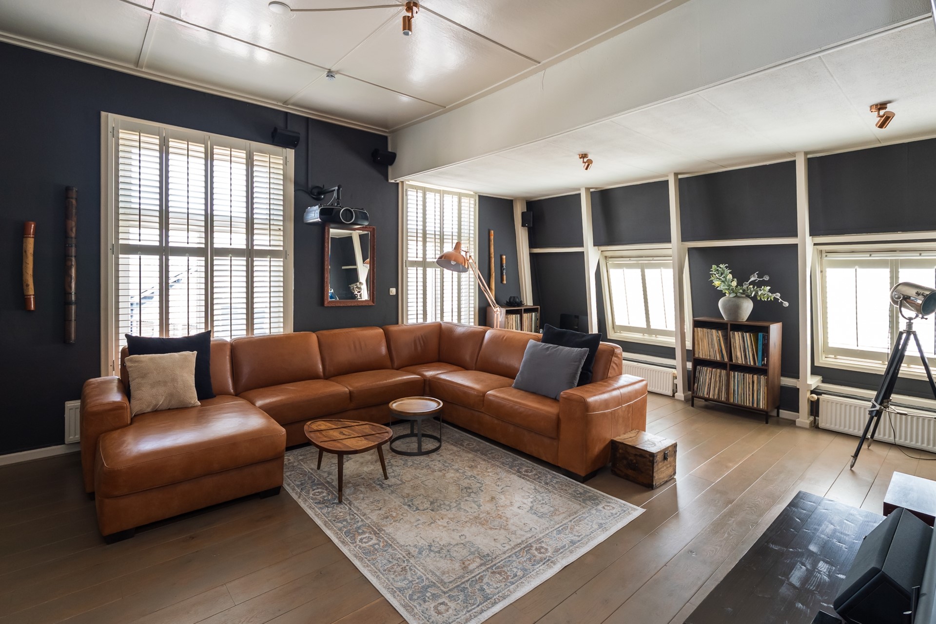 De royale living ademt sfeer. De eiken vloerdelen, de zichtbare balken van de dakconstructie en het authentieke plafond met latverdeling zijn elementen die nooit gaan vervelen. De roederamen in de gevel en de dakvensters zijn voorzien van shutters, wat een gevoel van luxe creëert en je kunt spelen met het licht. Dankzij de verhoogde positie ten opzichte van de straat geniet je hier van een uniek uitzicht over de Rij-en Uitweg met haar statige herenboerderijen.