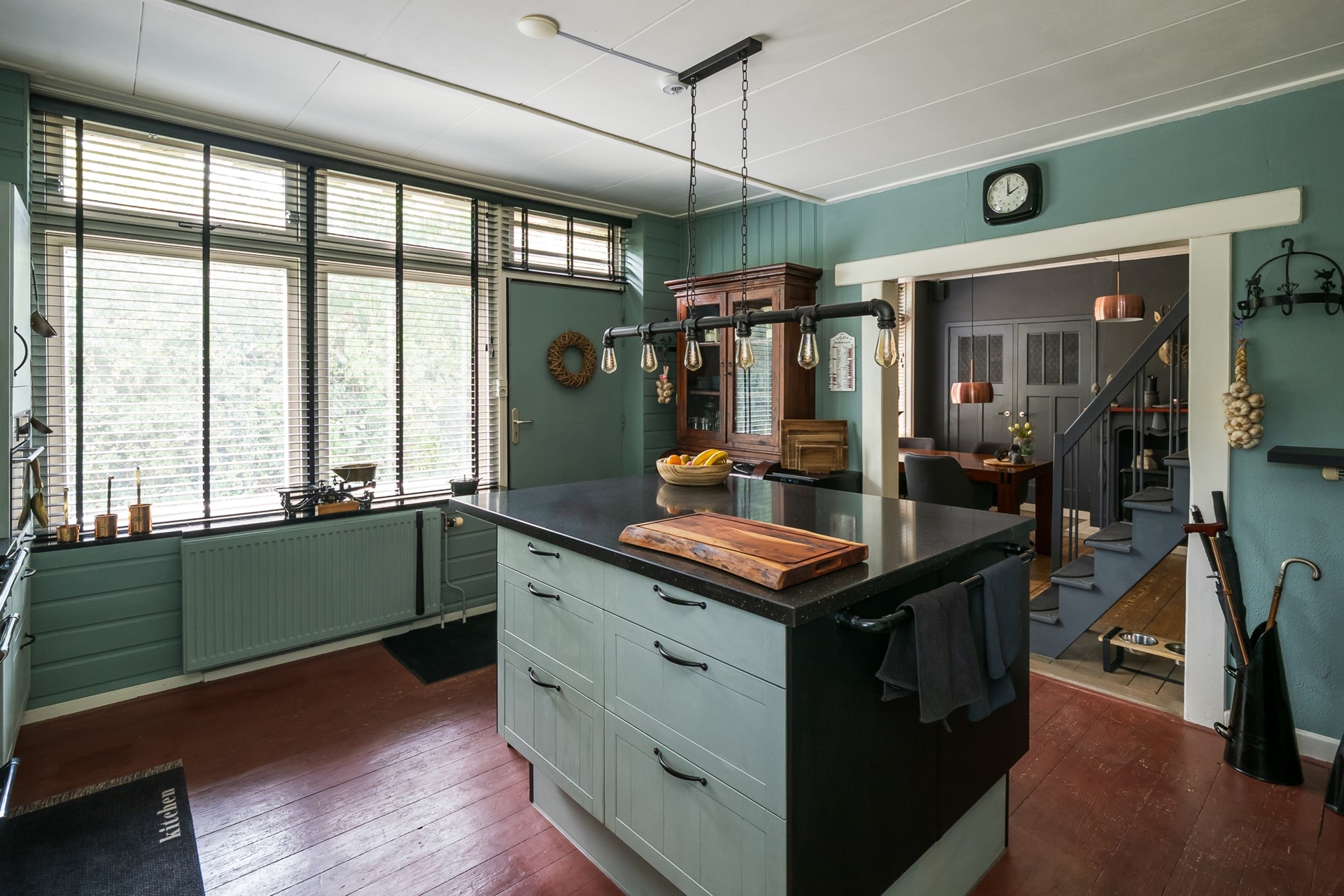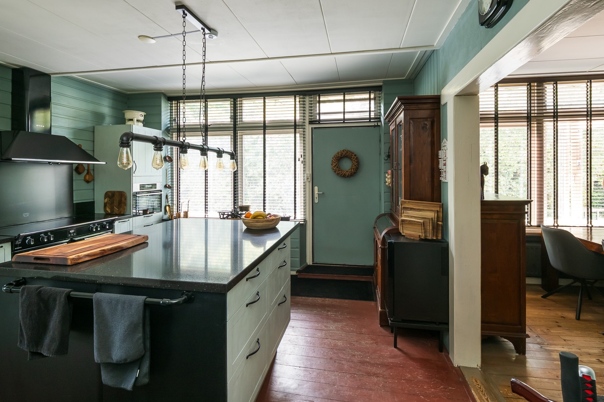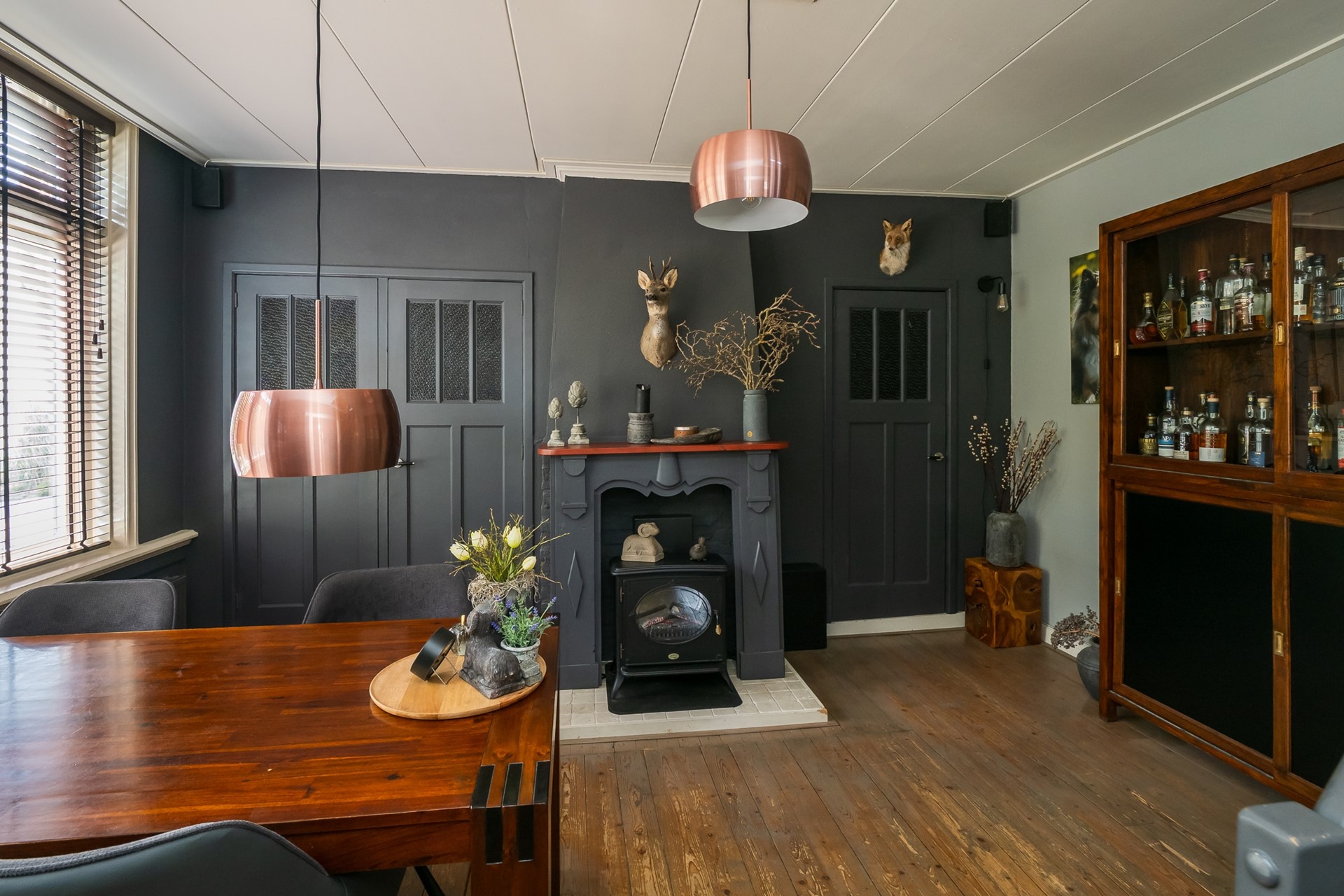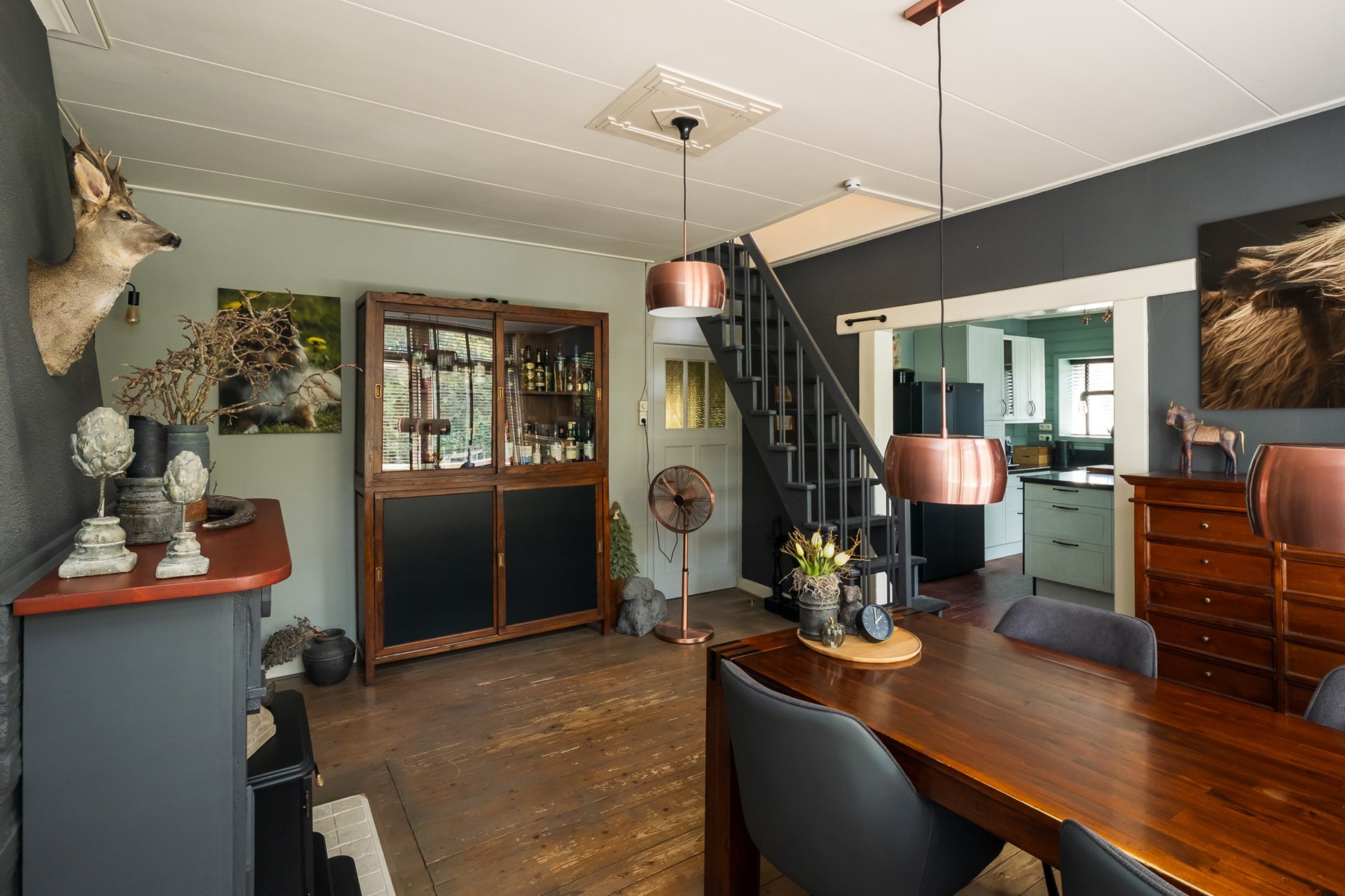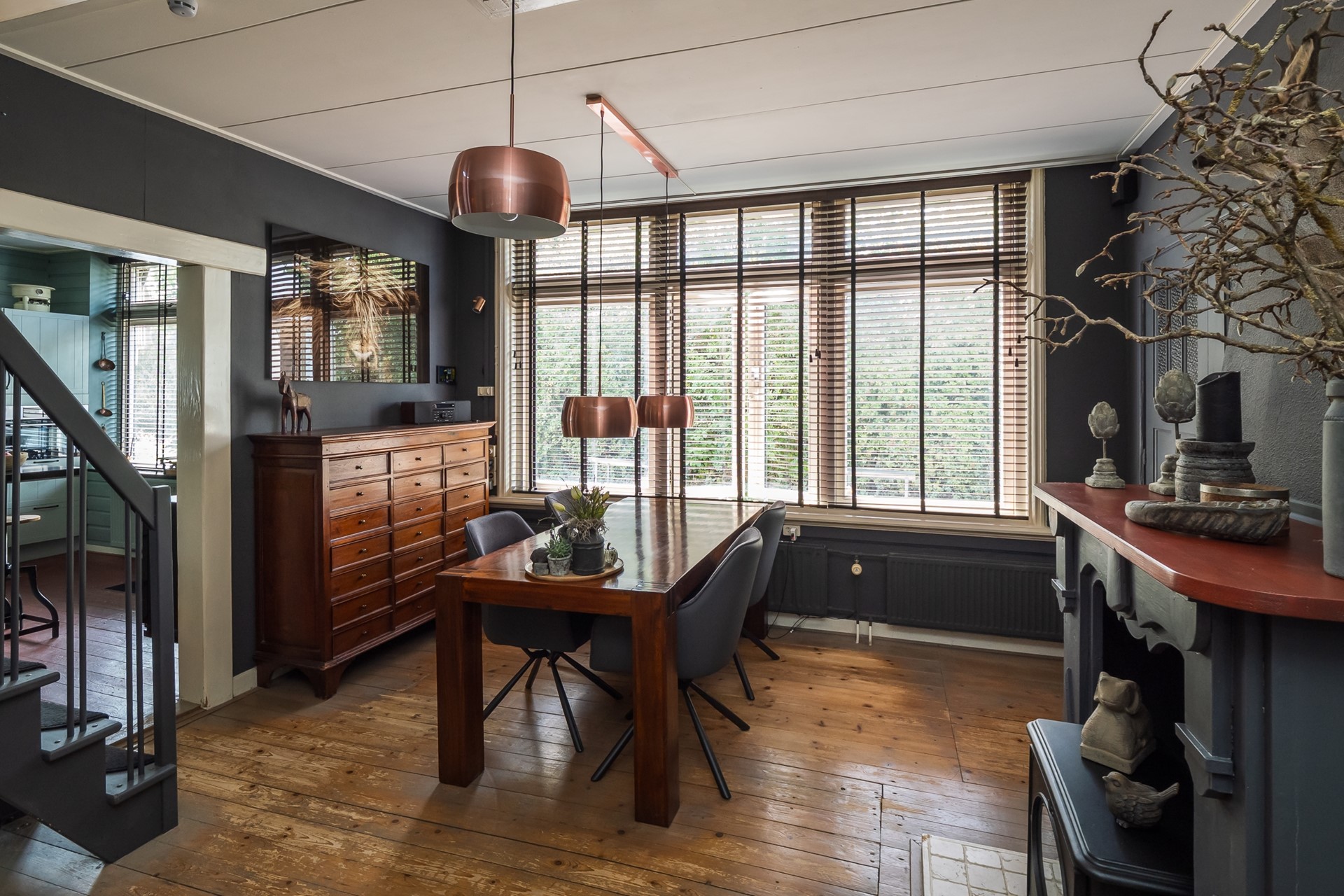 De eetkamer staat in dynamische open verbinding met de woonkeuken en vormt zo een uitnodigende plek voor lange maaltijden en gezellig samenzijn. De elegante houtwerk schouw met aansluiting voor een kachel trekt direct de aandacht en wordt geflankeerd door servieskasten met authentieke paneeldeuren. De royale raampartij brengt volop daglicht binnen en geeft uitzicht op de dijk, waar het smeedijzeren hekwerk met zijn vogelhuisjes levendig bezocht wordt door diverse vogels.