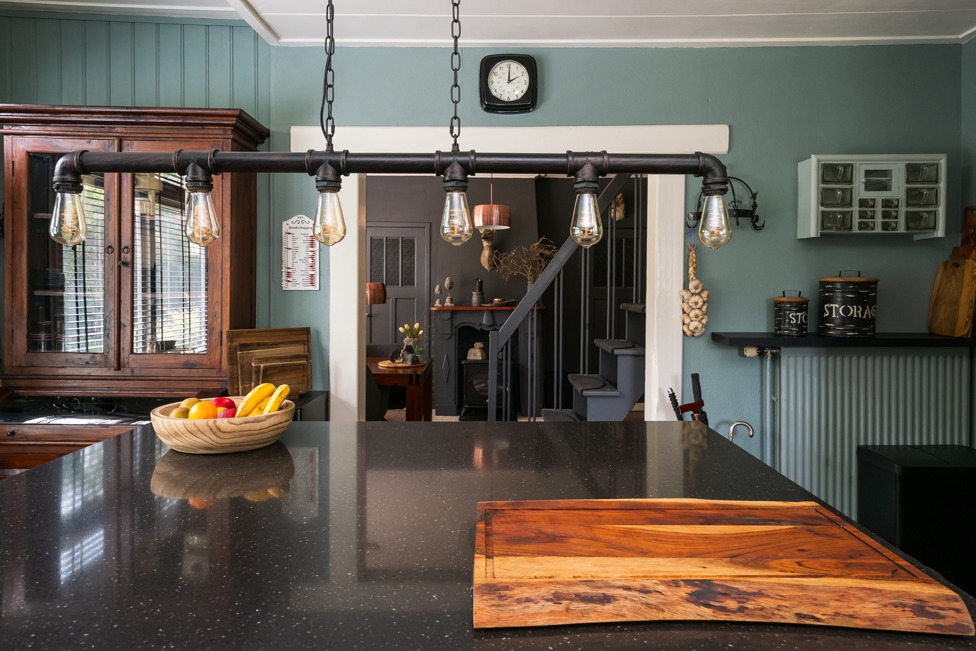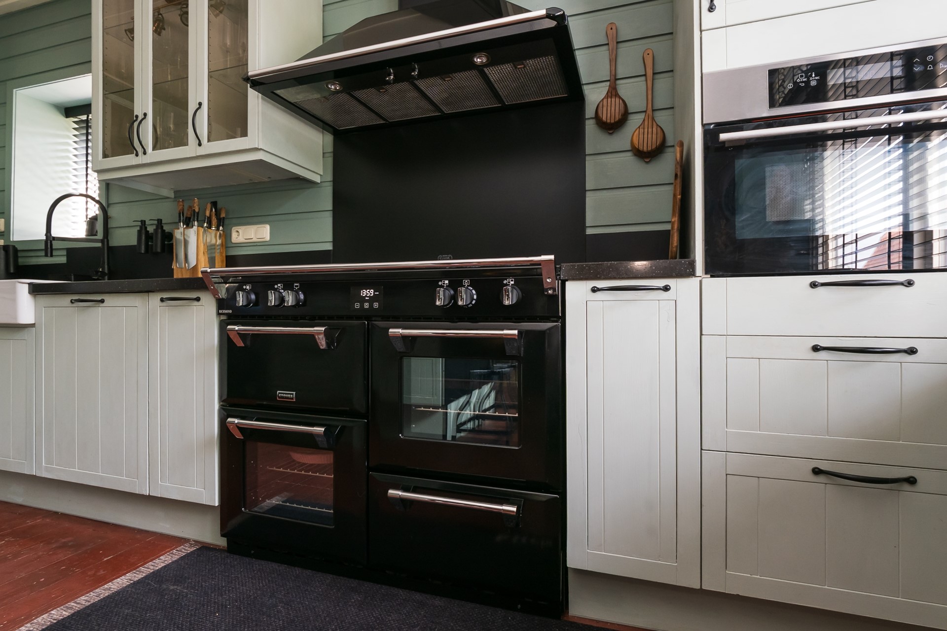 Via de voordeur stap je binnen in de woonkeuken; het culinaire hart van dit dijkhuis. Hier komen koken, samenzijn en genieten moeiteloos samen. De L-vormige keukenopstelling en het centrale werkeiland hebben een composiet werkblad en bieden verrassend veel laden en kastruimten. In 2024 kreeg deze keuken een upgrade met nieuwe apparatuur, waardoor deze klaar is voor de toekomst. Blikvanger is zonder twijfel het brede fornuis van “Stoves” – compleet met vijfpits inductiekookplaat, drie ovens en een warmhoudlade. Daarnaast beschik je over een afzuigschouw, combimagnetron en een vaatwasmachine. Het eiland biedt veel werkruimte en nodigt uit om gezellig aan te schuiven. Extra pluspunt: de kastenfronten zijn eenvoudig te overschilderen, zodat je de keuken helemaal naar eigen smaak kunt personaliseren. De royale raampartij aan de dijkzijde vult de ruimte met daglicht.