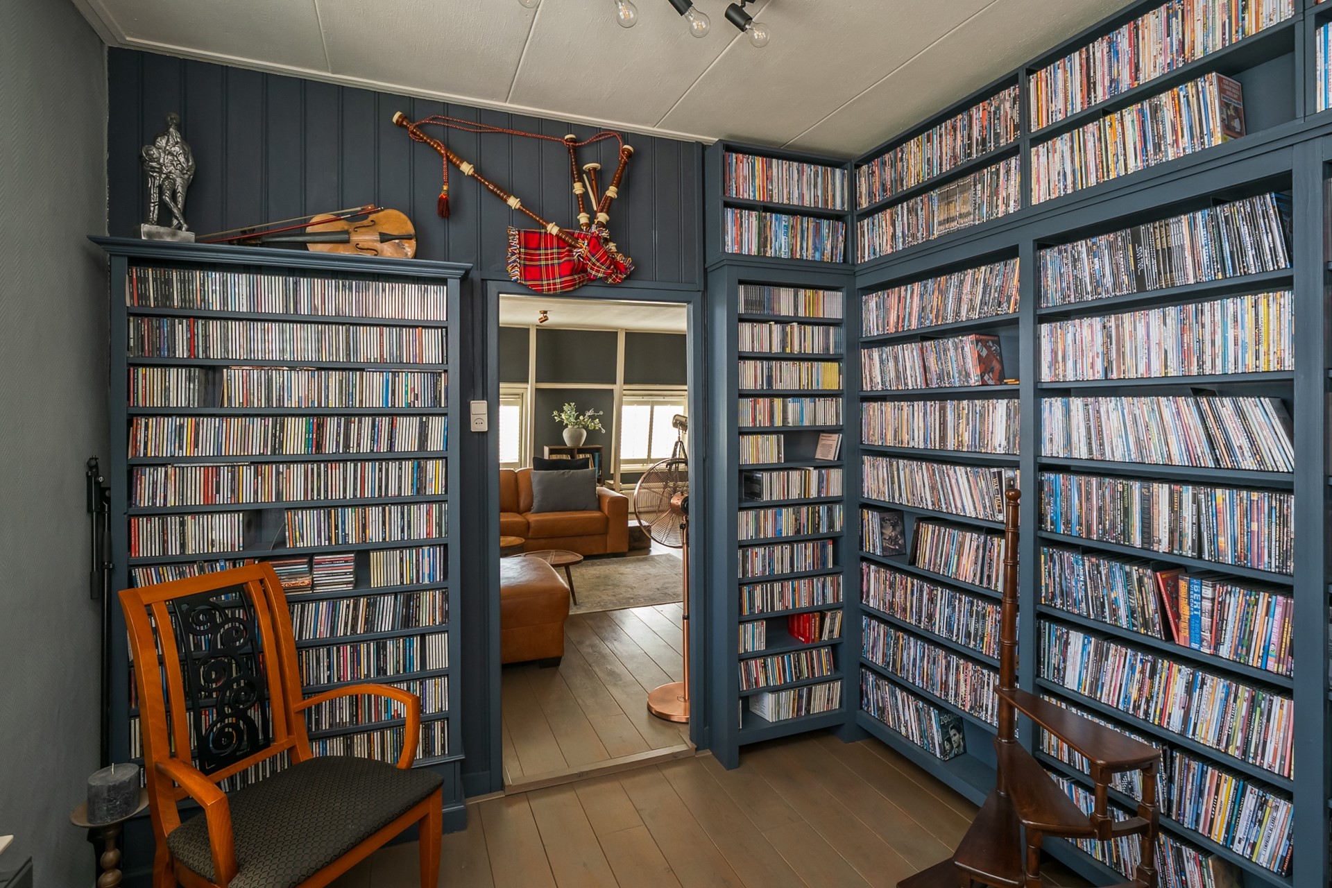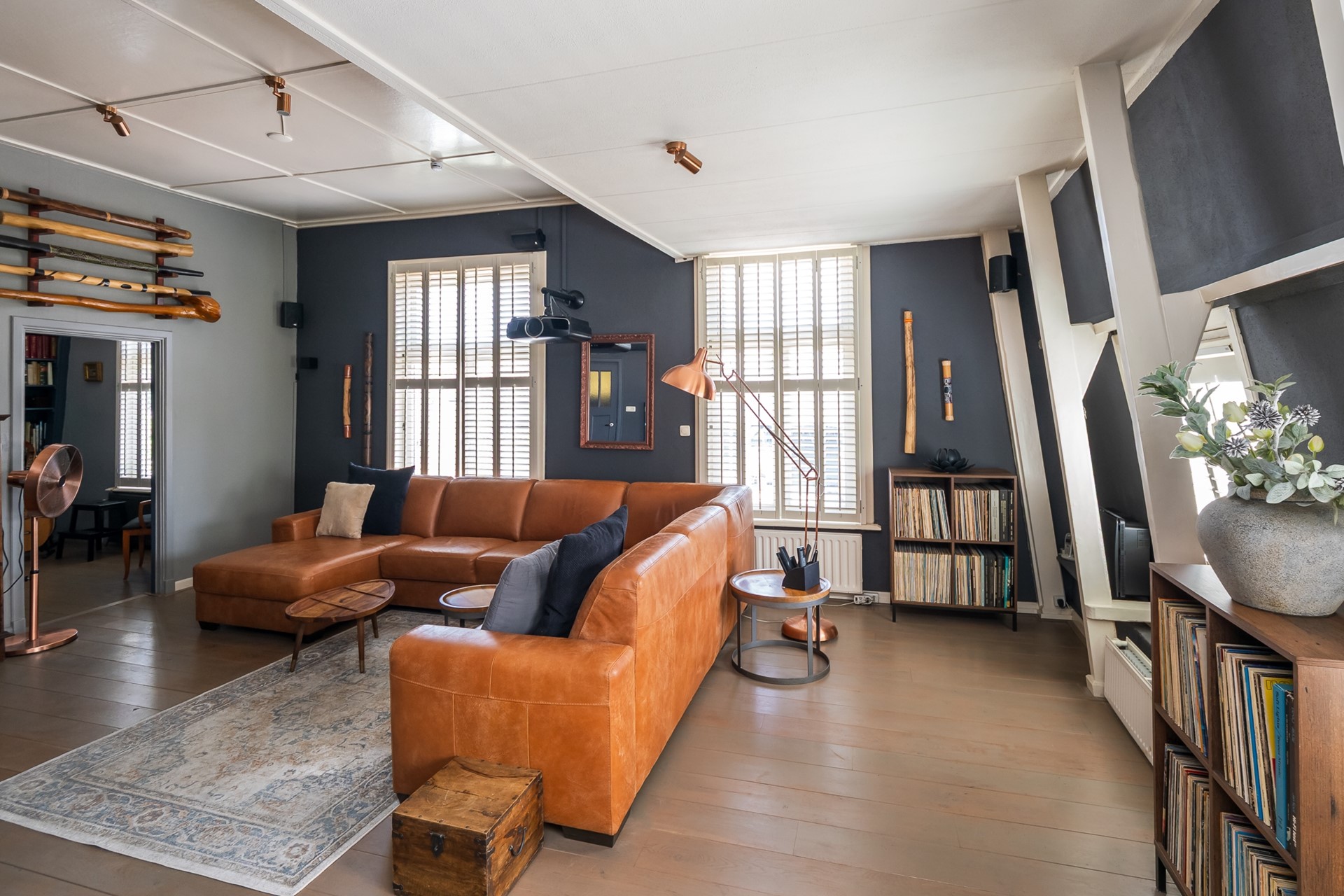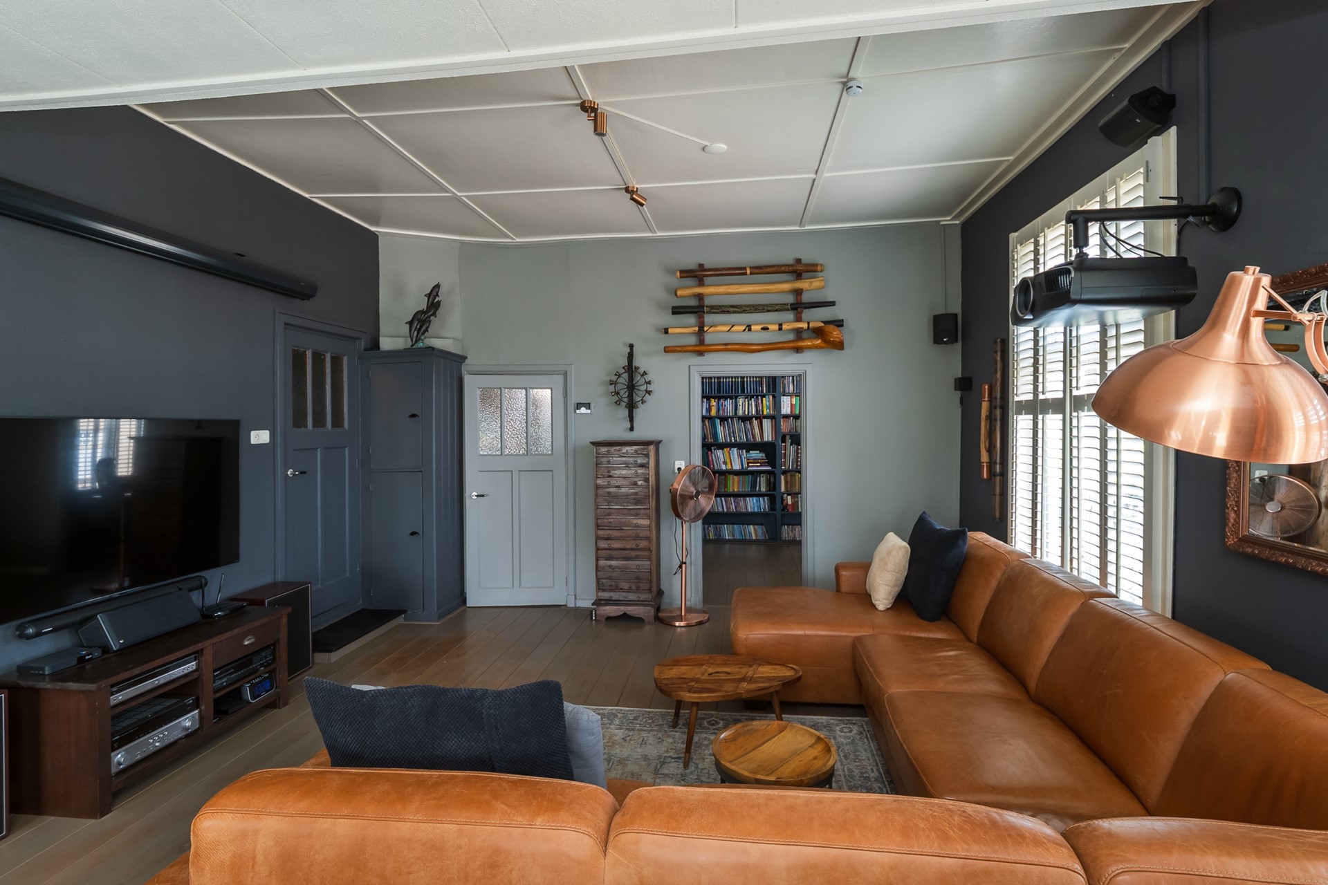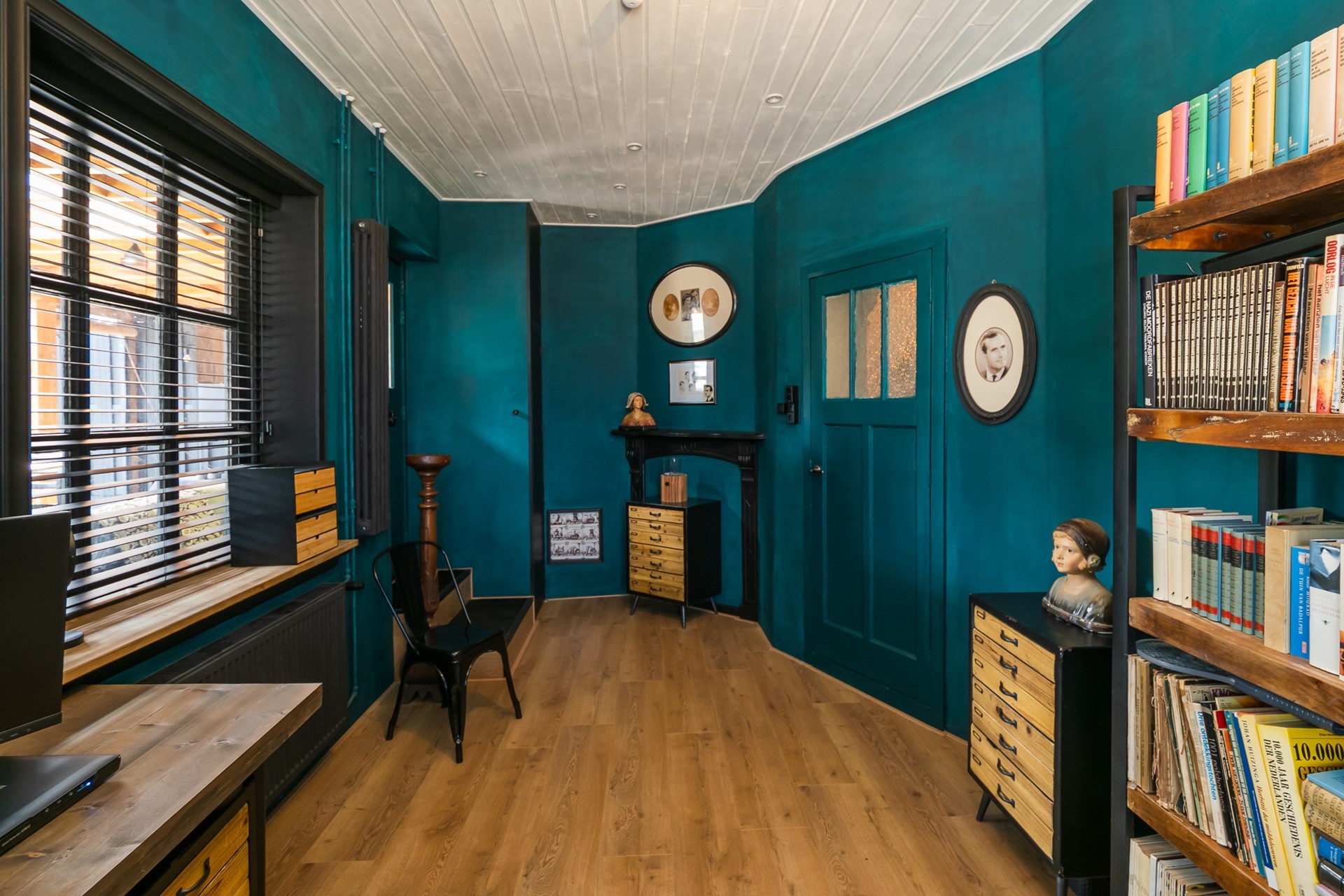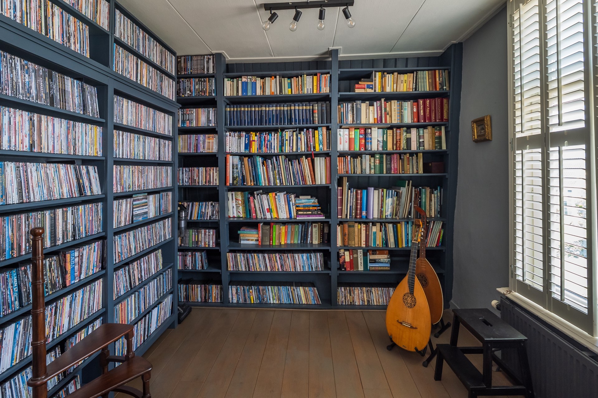 De aangrenzende bibliotheek is een intiem verlengstuk van de living, dat zich perfect leent als bijvoorbeeld leeshoek of werkruimte. De ingebouwde maatwerk boekenkast is inclusief en de cd- en dvd-rekken gaan mee. Ook hier is het roederaam uitgevoerd met shutters.
