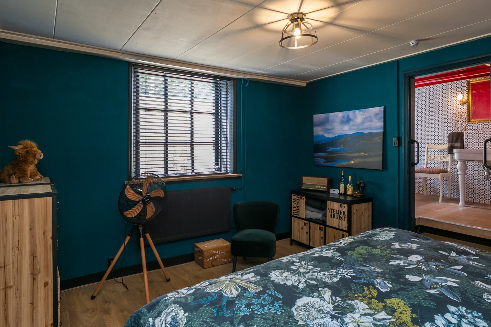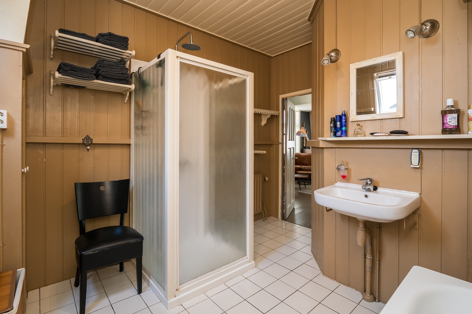 Vanuit de living bereik je een royale badkamer, die is ingericht met een ligbad, een douchecabine met regendouche en een wastafel met spiegel. Praktische opbergruimte is aanwezig in de vorm van een vaste kast, een charmant wandkastje en sierlijke planchetten. De radiator verzorgt de verwarming en het Velux-venster zorgt voor daglicht en ventilatie.