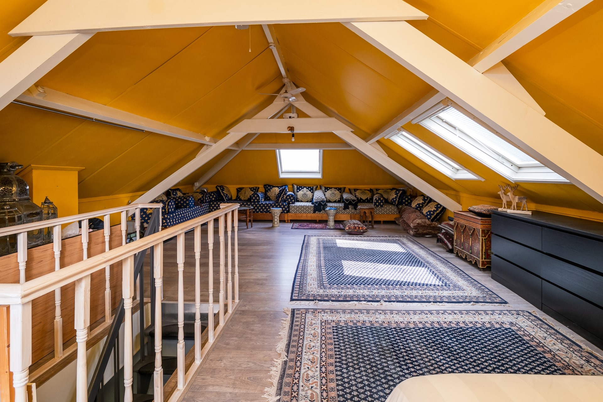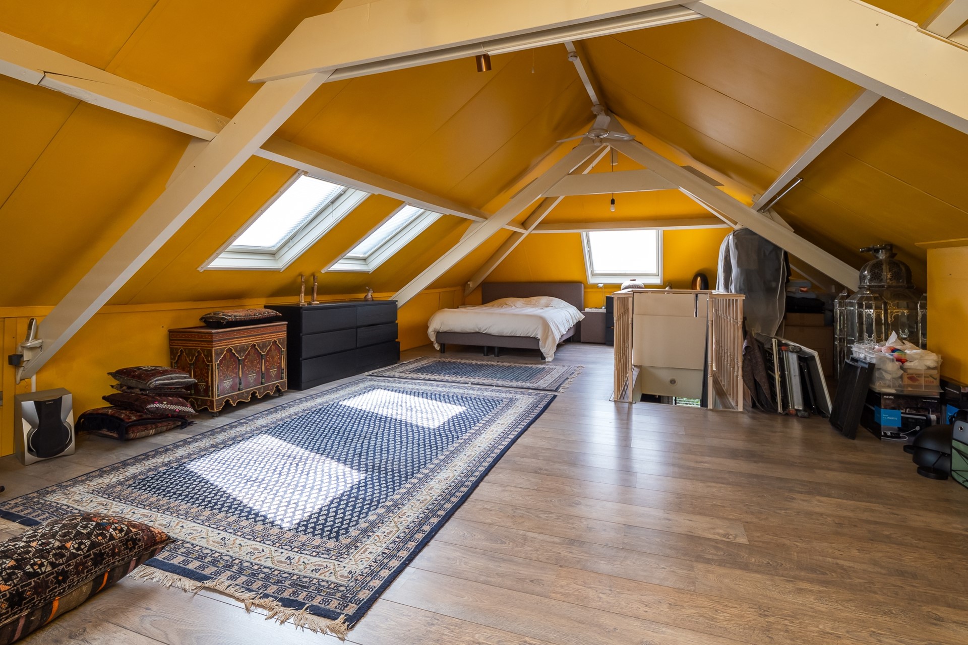 Vanuit de eetkamer leidt een vaste trap naar de royale bovenverdieping, die in 1996 aan het dijkhuis werd toegevoegd. De volledige kap is voorzien van isolatie en de vier Velux-vensters zorgen voor een overvloed aan daglicht. Dankzij de hoogte van de kap en het royale vloeroppervlak biedt deze verdieping volop mogelijkheden, bijvoorbeeld het creëren van extra kamers.