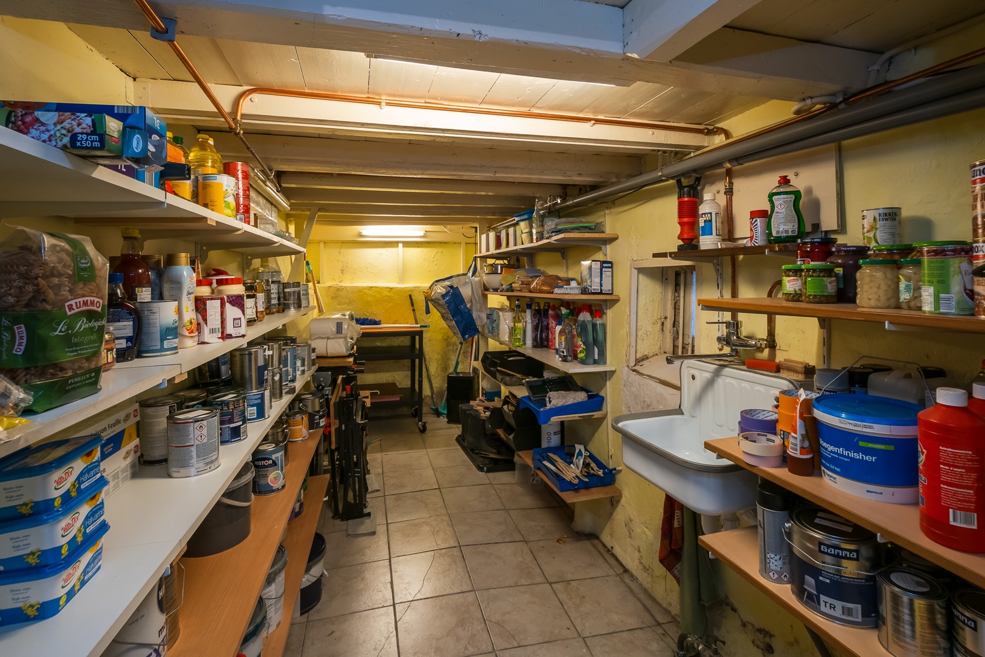 Vanuit de bijkeuken daal je af in de royale proviandkelder met schappen langs de wand, uitstortgootsteen en ontluchtingsvenster. De elektrische dompelpomp zorgt er bij hevige regenval of hoog water voor dat er geen water in de kelder komt te staan.