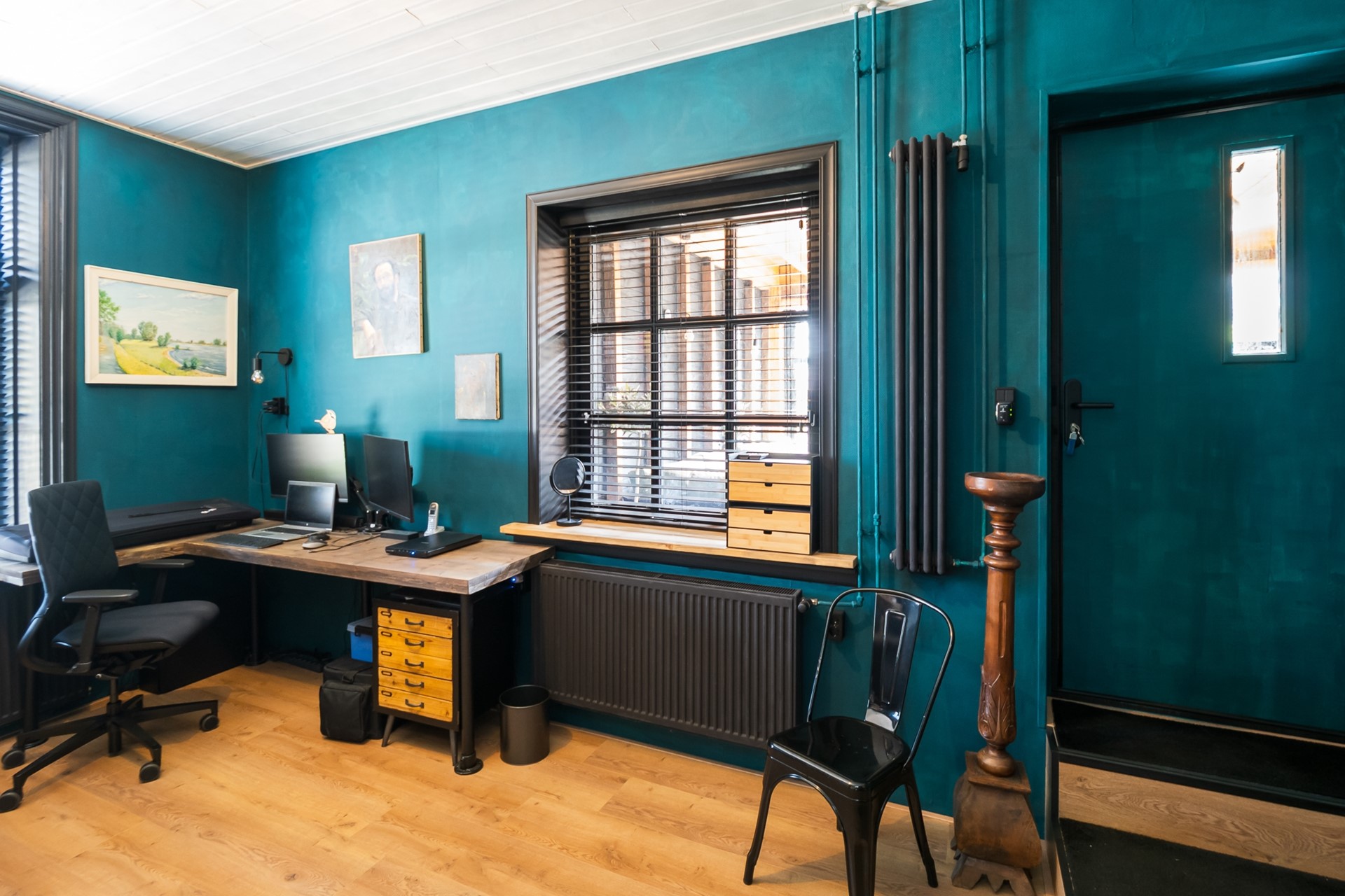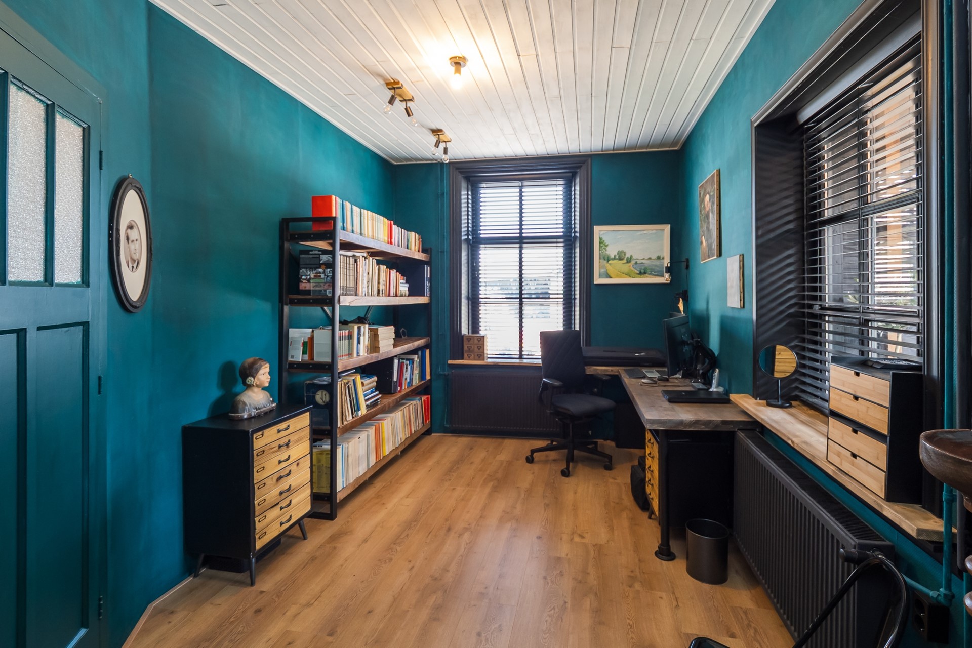 De twee kantoor-/slaapkamers bieden ruimte en sfeer. Grote roederamen verzorgen een heldere lichtinval en bieden een charmant uitzicht op de Rij- en Uitweg.