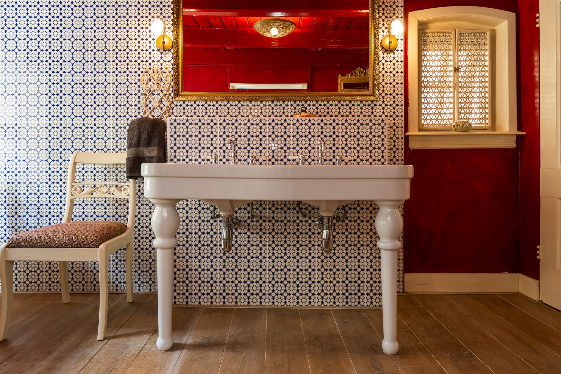 Enkele treden hoger wacht de badkamer. De authentieke Moorse betegeling in combinatie met de verfijnde Marokkaanse Zelliges creëren een oriëntaalse sfeer. Het gietijzeren ligbad op leeuwenpootjes met bijpassende staande kraan, nodigt uit tot ultiem ontspannen. Verfris jezelf aan de nostalgische duo-wastafel met brede spiegel en elegante wandlampjes in lelievorm. Het douchetoilet zorgt voor een zorgeloze hygiëne en de vaste kast biedt tenslotte praktische opbergruimte.