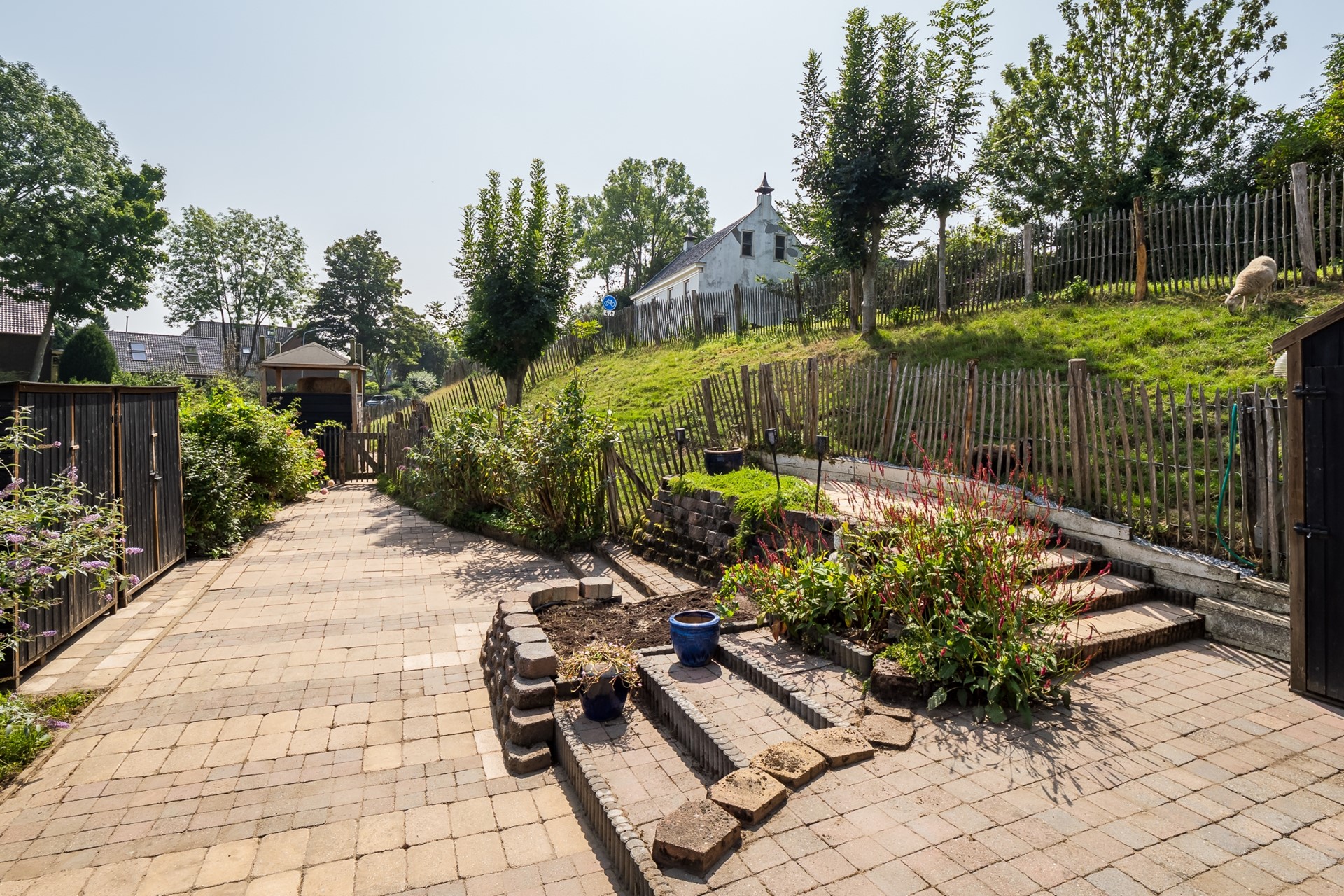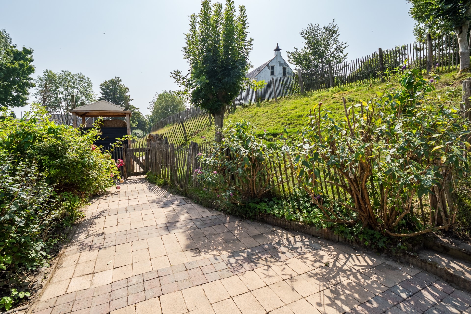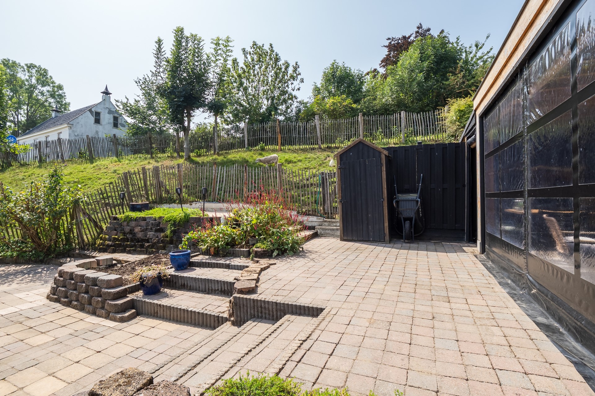 Dierenliefhebbers opgelet! Bij dit huis horen met Engels hekwerk omheinde dierenweides én een verharde plaats met charmant dierenverblijf, in de gedaante van een hooiberg. Ideaal voor het houden van schaapjes of dwerggeitjes. Het grasland in het verlengde van de tuin wordt gehuurd van de gemeente.