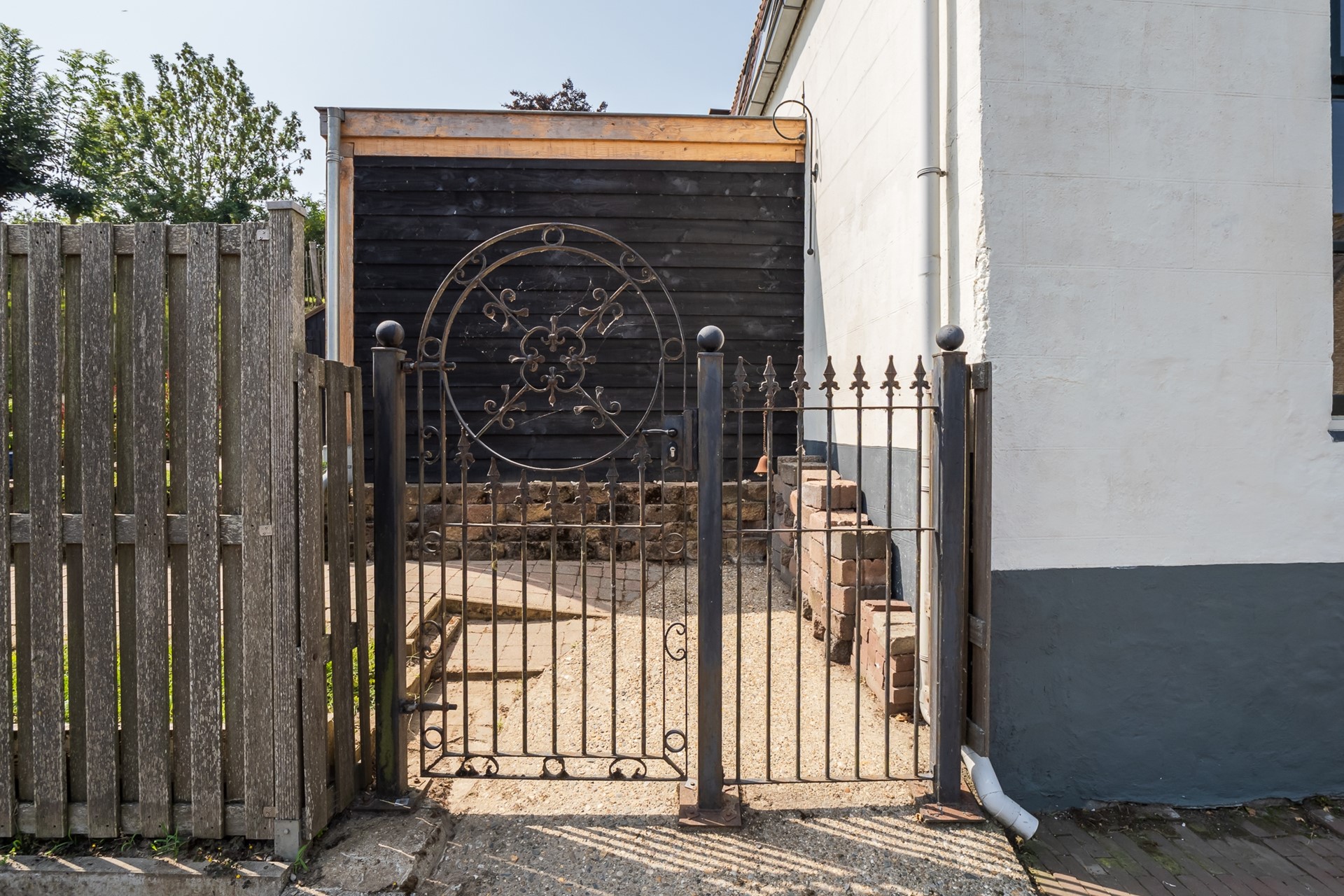 Aan de linkerzijde van het huis ligt een kleine besloten plaats, waar de fietsenberging is gesitueerd. De buren van Waaldijk 53 hebben hier een recht van overpad naar de Rij- en Uitweg.