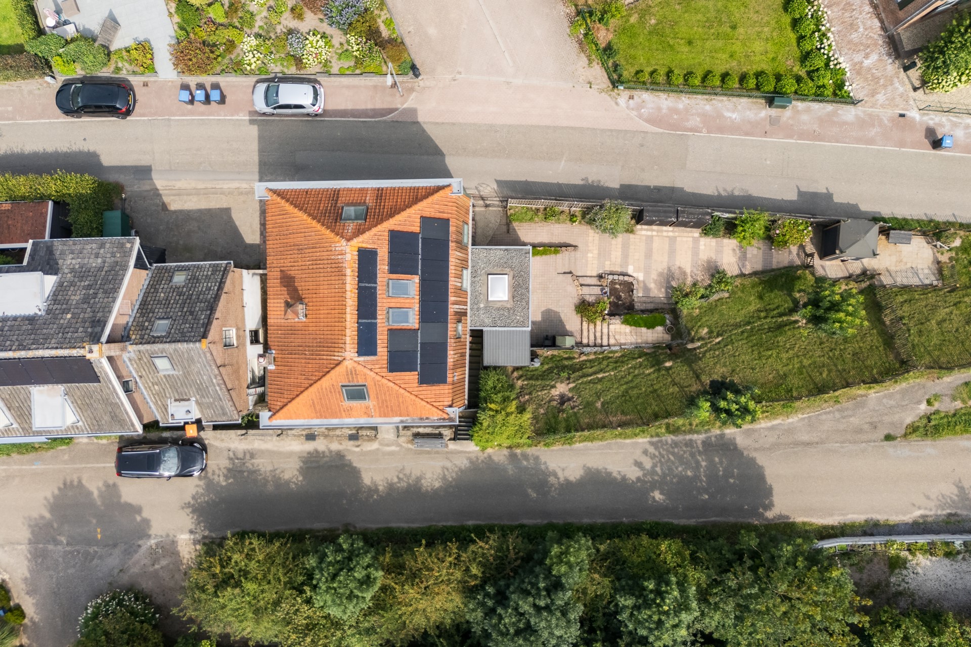 Ook aan het buitenleven is veel aandacht besteed. Aan de rechterzijde van het huis ontvouwt zich een heerlijke tuin met opvallend veel privacy, die zowel vanaf de dijkzijde als aan de zijde van de Rij- en Uitweg toegankelijk is. De royale veranda vormt een heerlijk verlengstuk van het huis en heeft een robuuste Douglashouten constructie en zwart gebeitste hardhouten wanden. Hier beleef je elk seizoen in comfort – van lange zomeravonden met een glas wijn tot knusse winterdagen onder de terrasverwarmer. De afritsbare zeildoeken en de sfeervolle wandlampen zorgen ervoor dat deze plek altijd uitnodigt, ongeacht het weer. De sierbestrating van de veranda loopt naadloos door in een stuk buitenterras. De verdere tuinaanleg bestaat uit meerdere niveaus en wordt opgesierd door speelse borders. Op het niveau van de Rij- en Uitweg ligt een royaal terras, waar houten tuinschermen optimale privacy creëren en het smeedijzeren hekwerk toegang biedt tot de openbare weg. De drie tuinkasten bieden praktische opbergruimten.