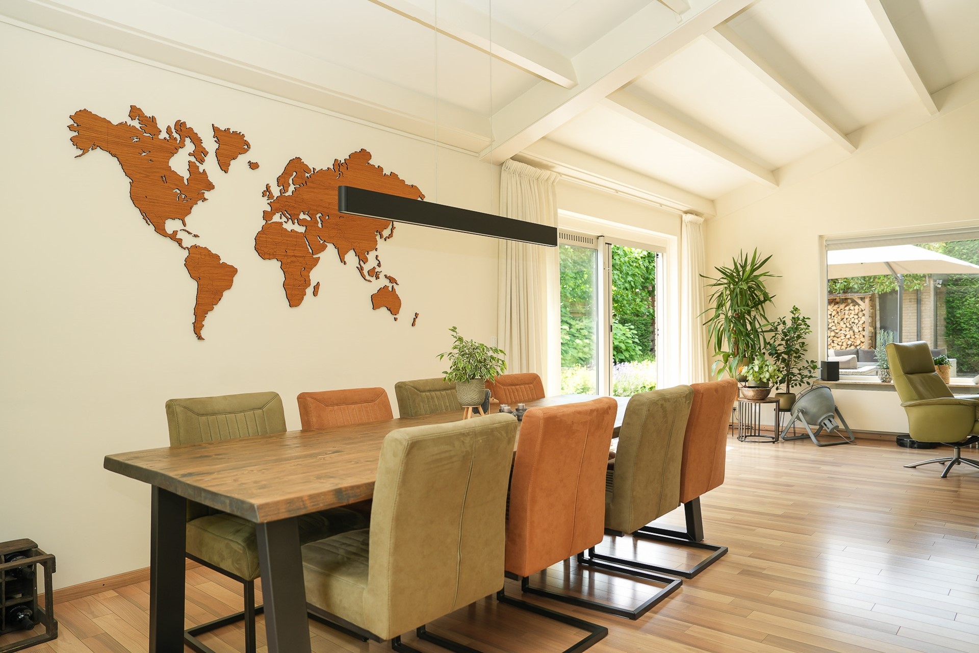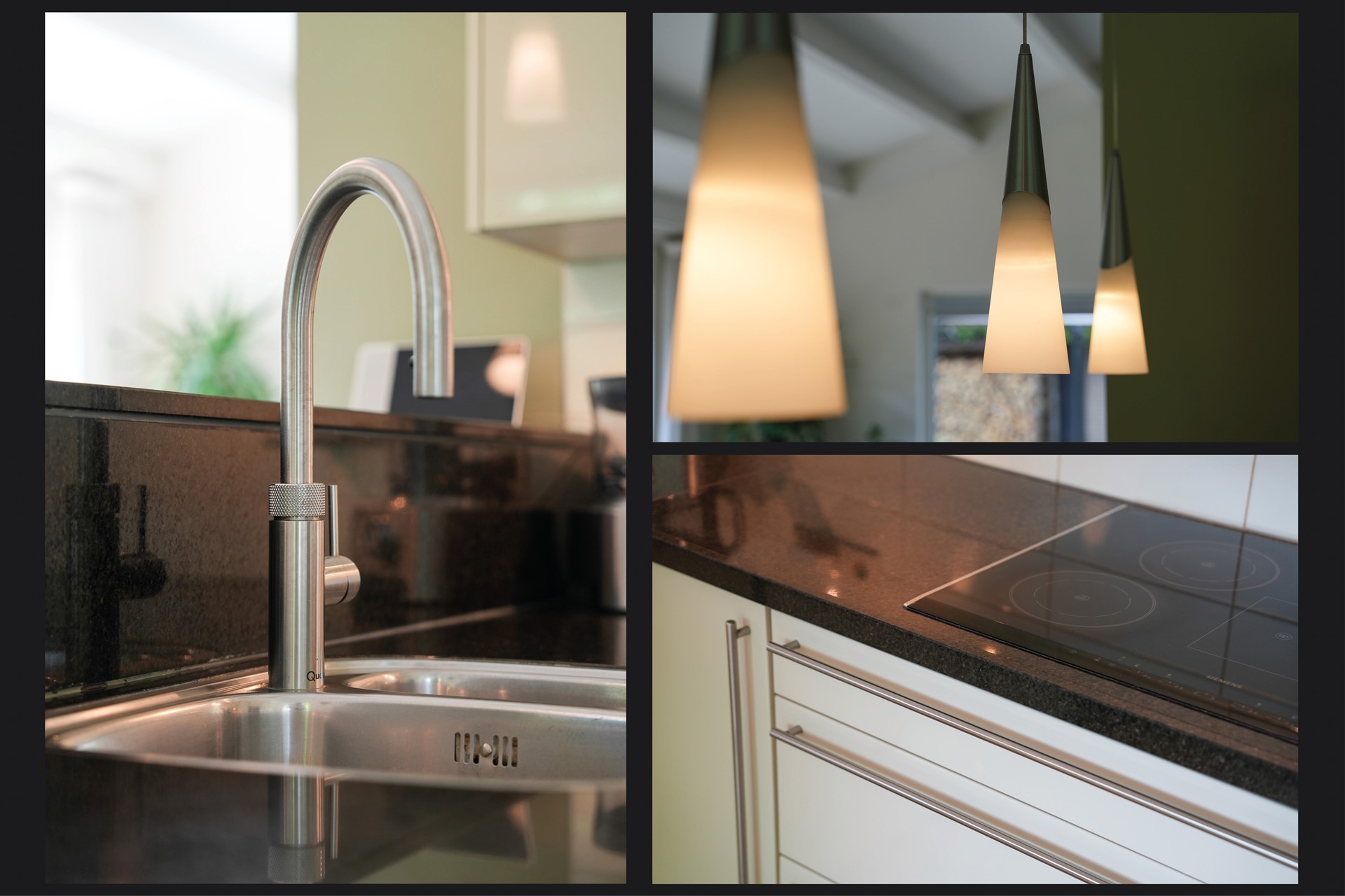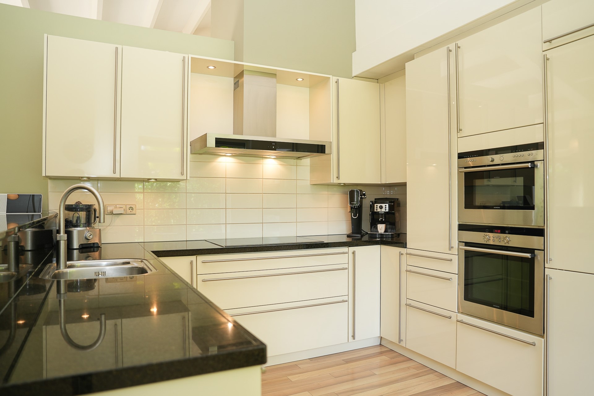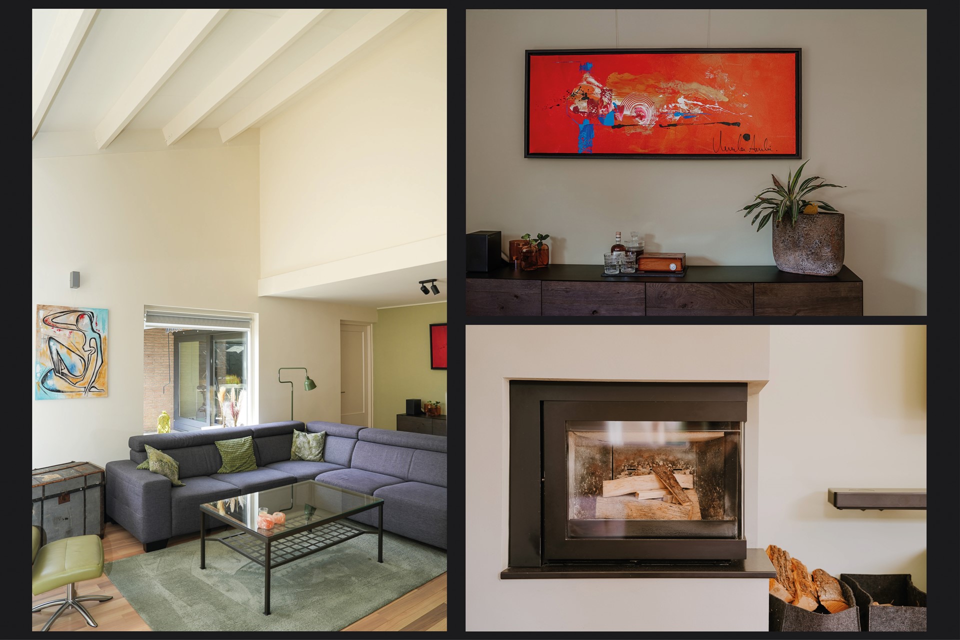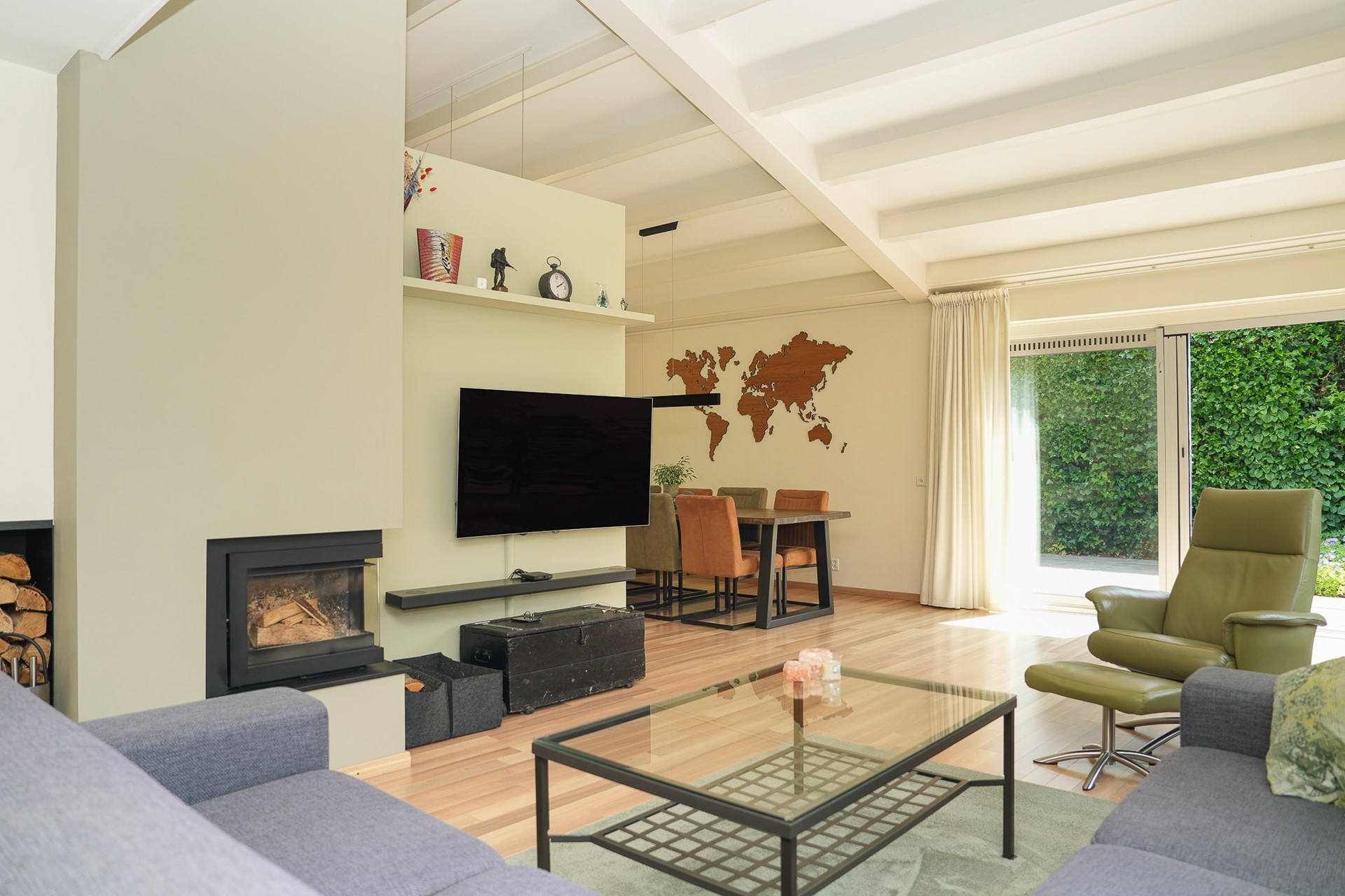 In de hal vinden we de meterkast en een nette toiletruimte. Vanuit de hal heb je toegang tot de lichte woonkamer met open haard en grote raampartijen met zicht op het groen. De woonkamer grenst aan een sfeervolle eethoek en de open keuken, voorzien van onder meer een inductiekookplaat, afzuigkap, combi-oven, koelkast, vriezer, vaatwasser én een Quooker (2020). Hierachter is er een praktische bijkeuken met achterdeur.