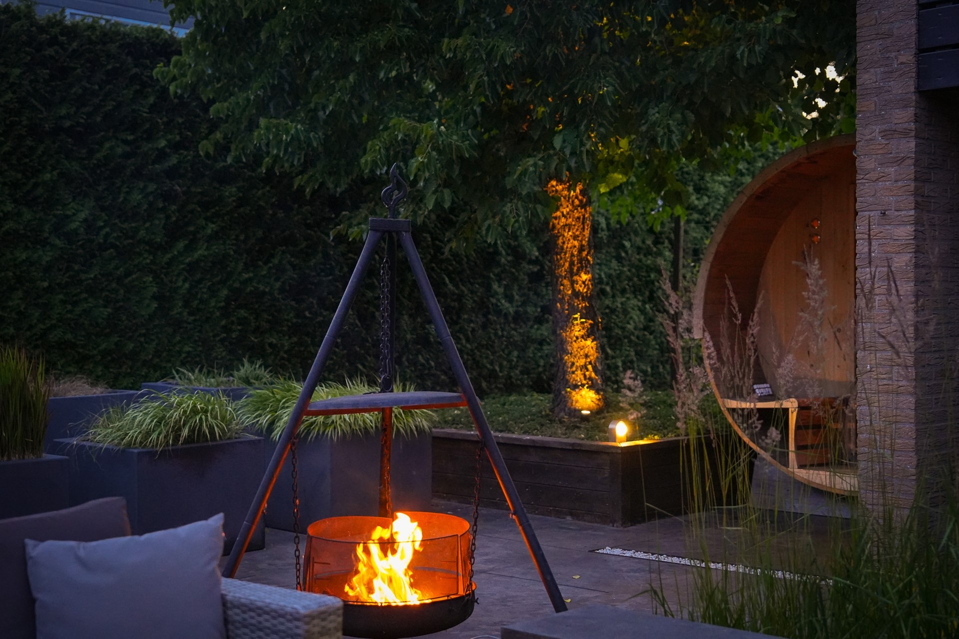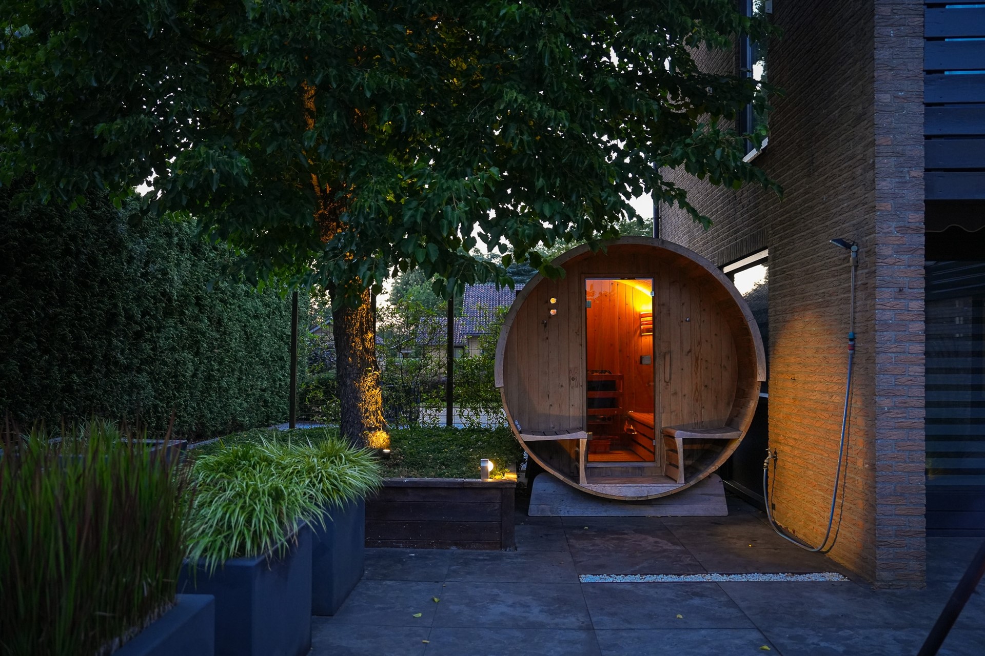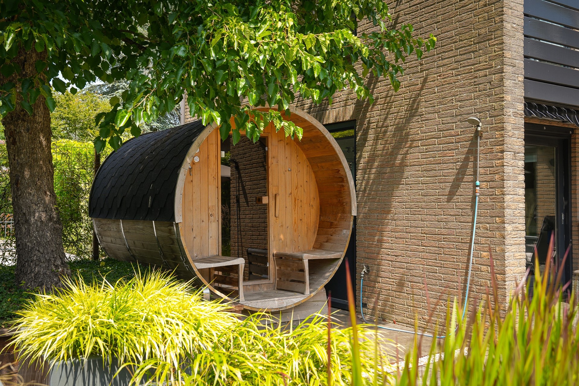 Blikvanger is de houten barrelsauna, perfect geplaatst onder een volwassen boom. Daarnaast is er een buitendouche aanwezig, een tuinverlichtingssysteem (N-light) en een automatische beregeningsinstallatie met grondwaterpuls.